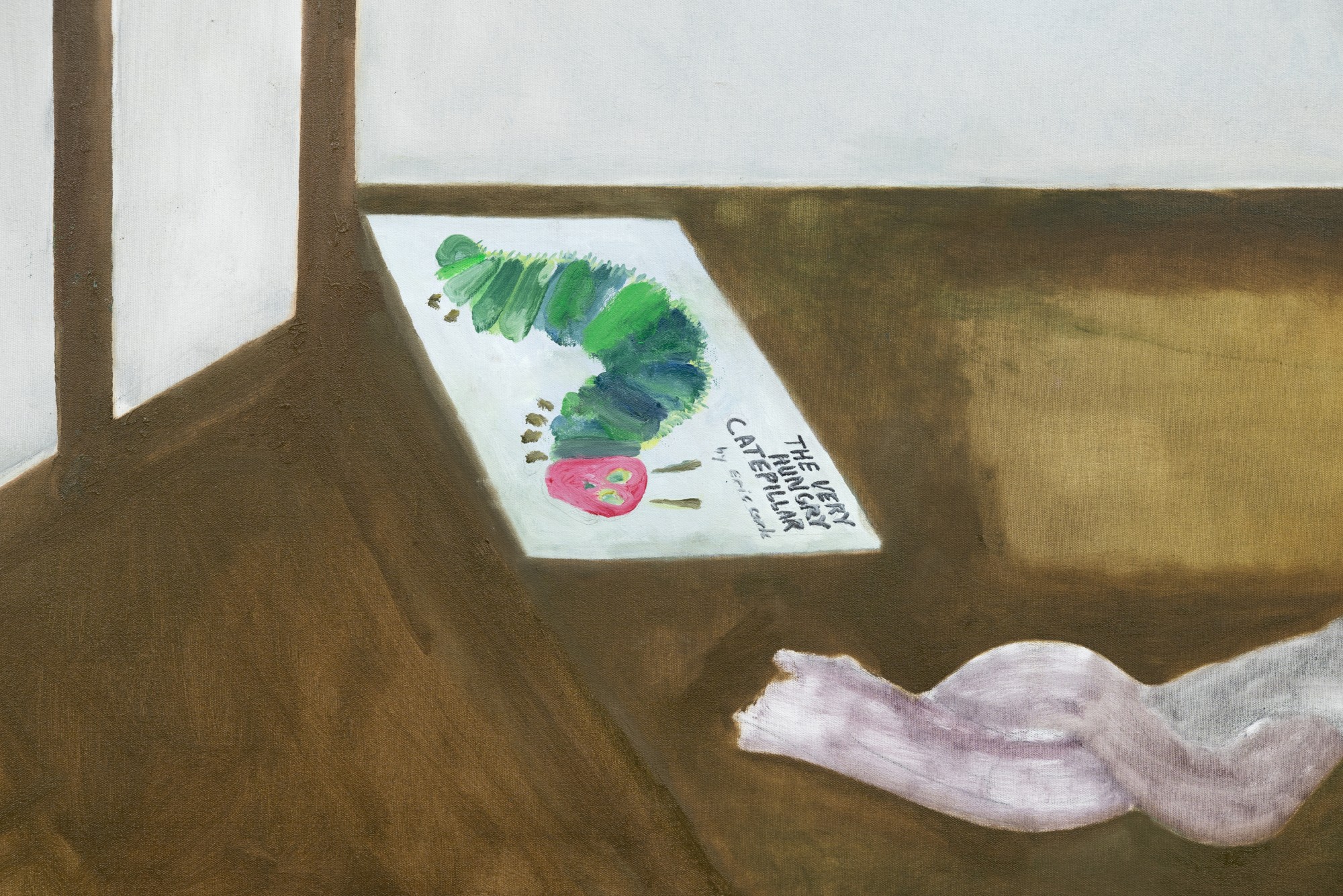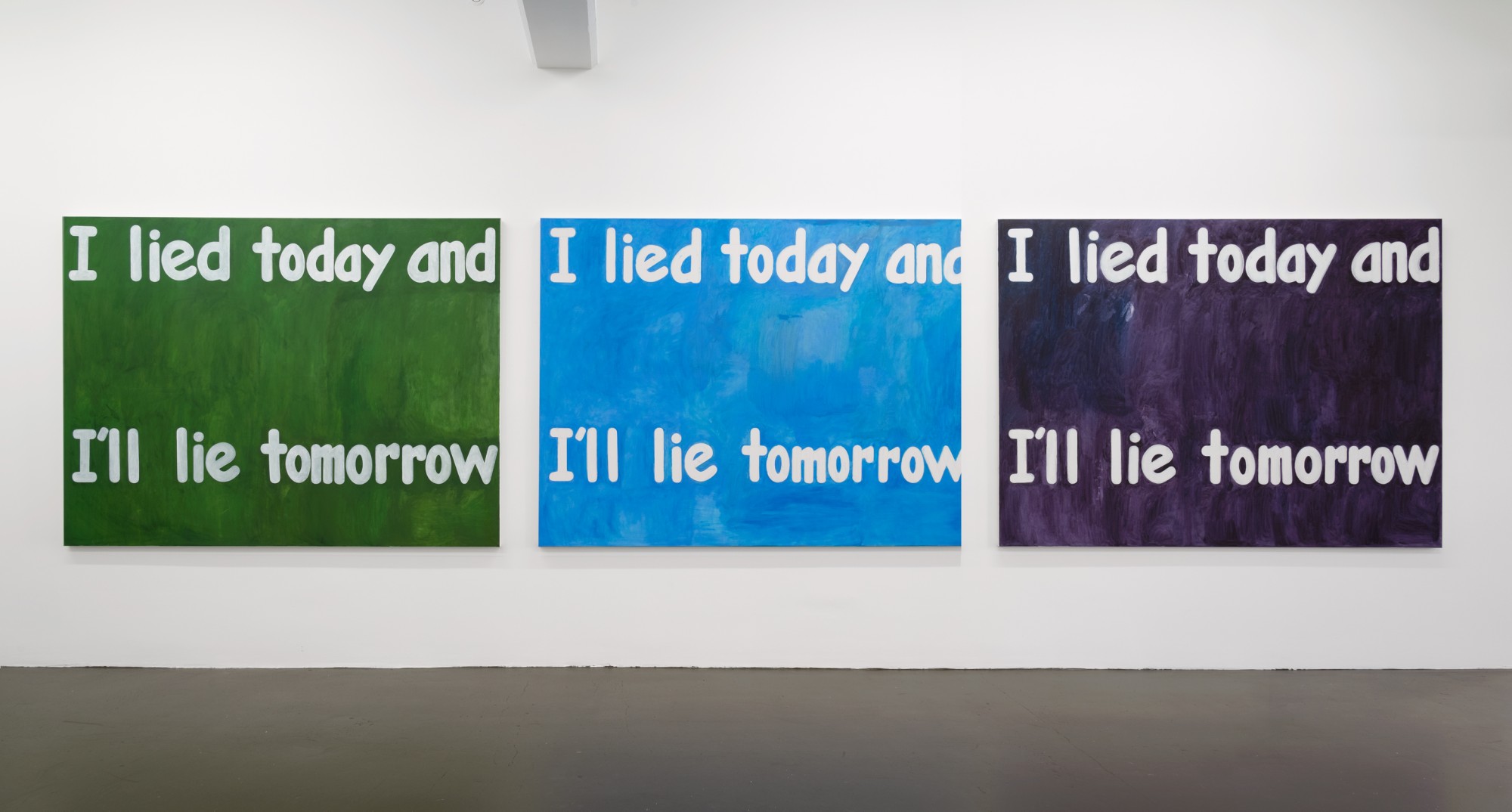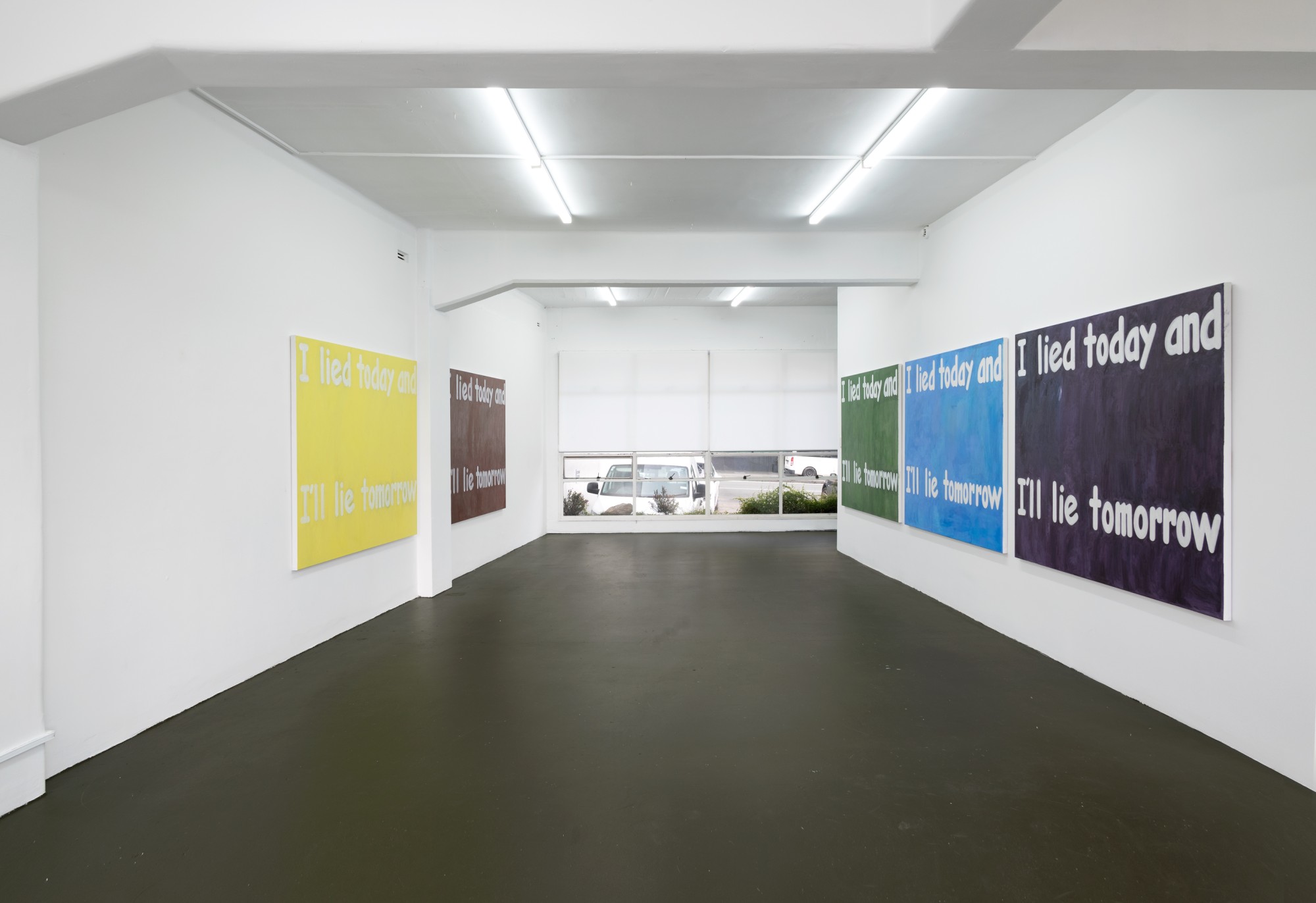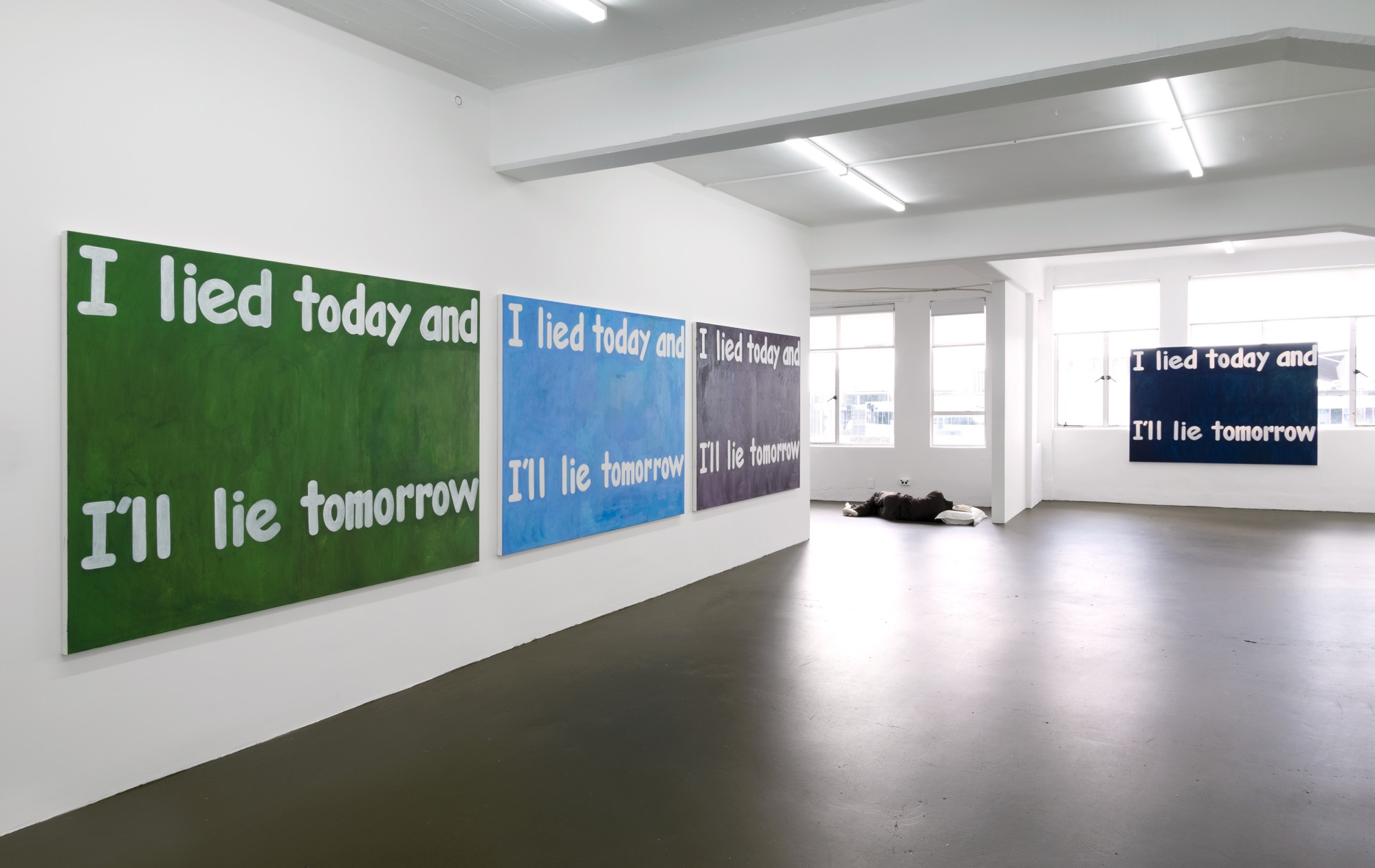 Affirmations comprises a series of large text paintings in a range of colours that say the same thing (the ‘affirmations’ of the exhibition’s title), as well as a life-sized sculpture of the artist sleeping in the corner of the gallery.