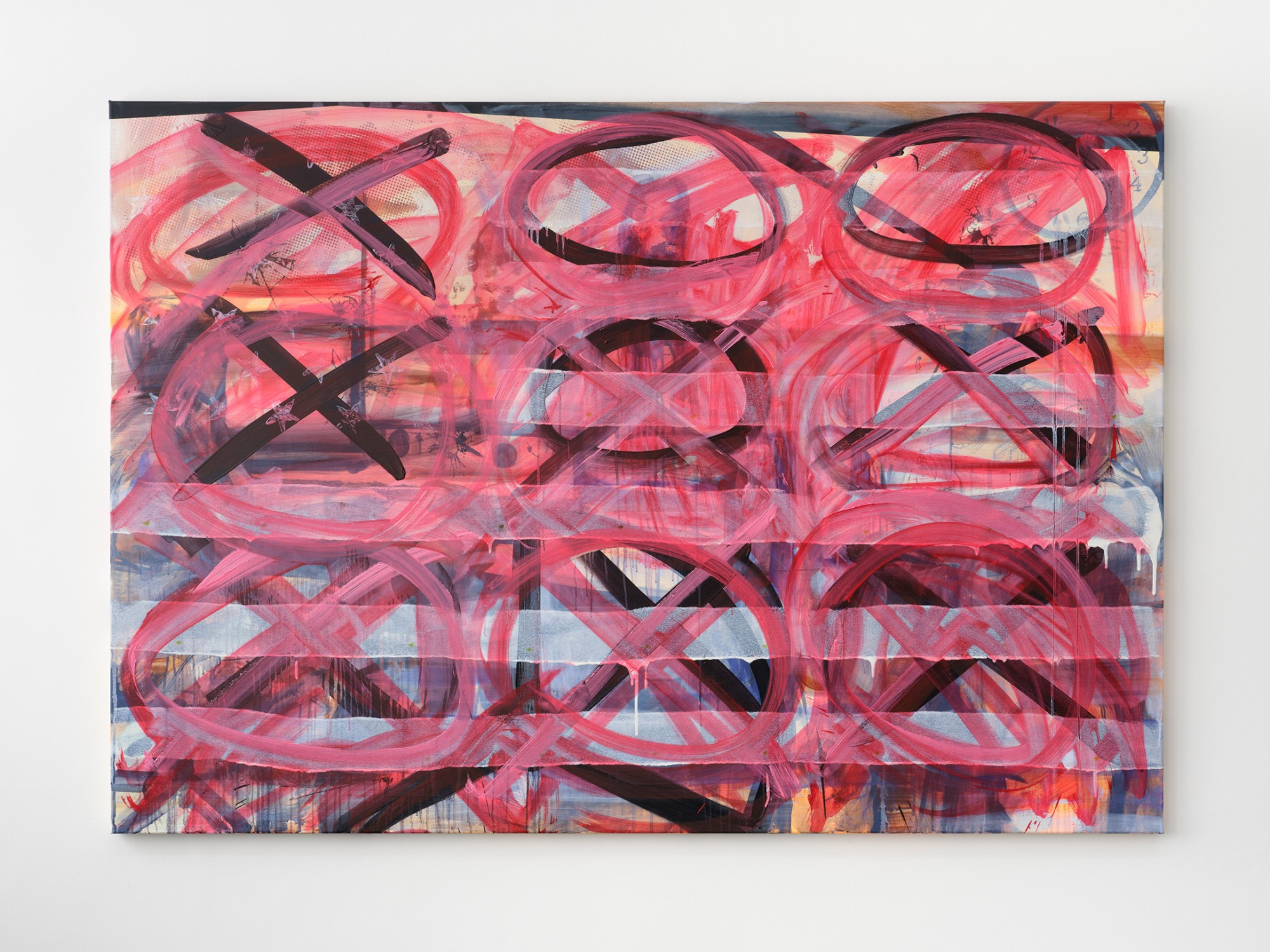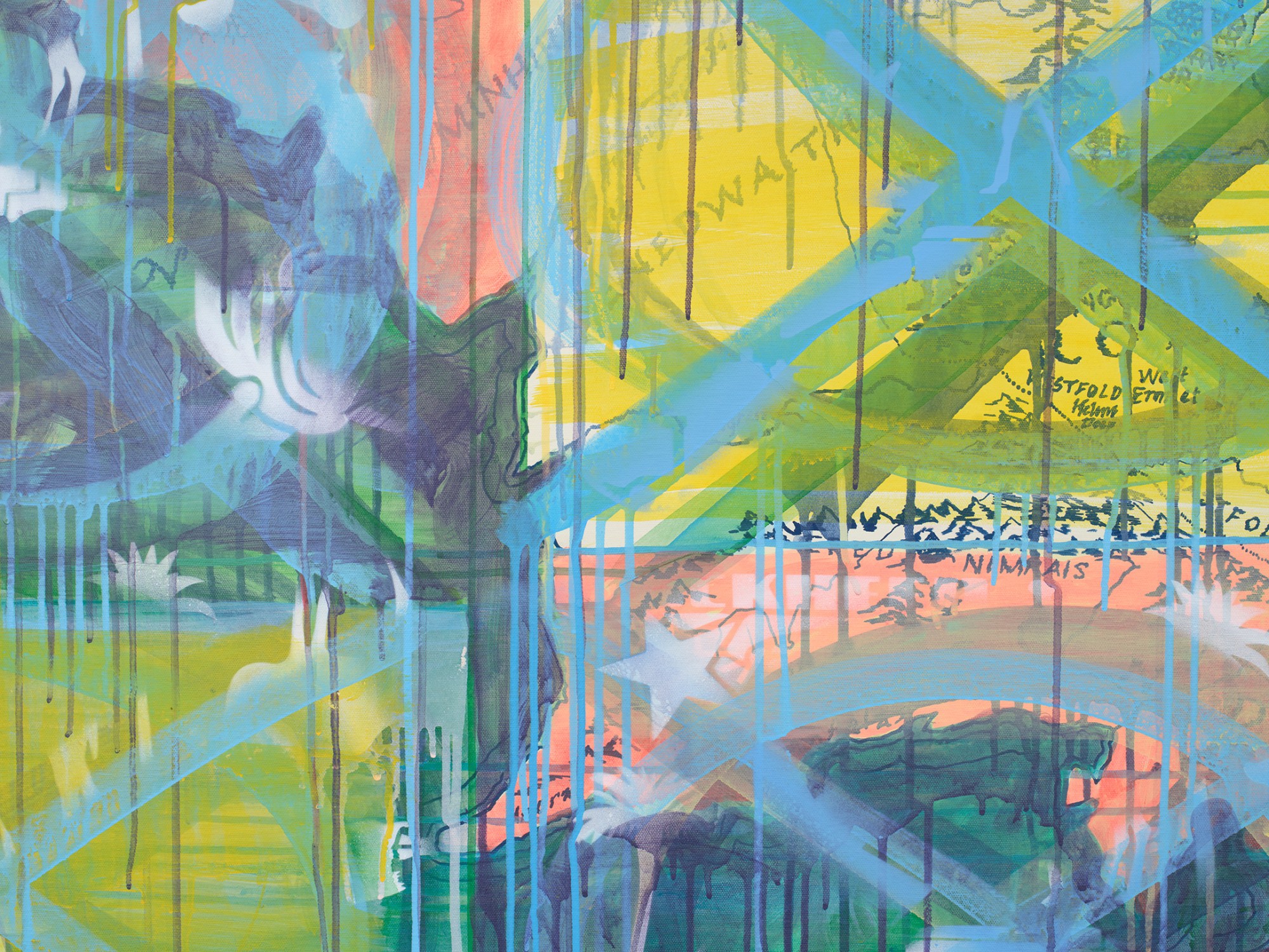 acrylic, acrylic spray-paint, permanent marker on canvas