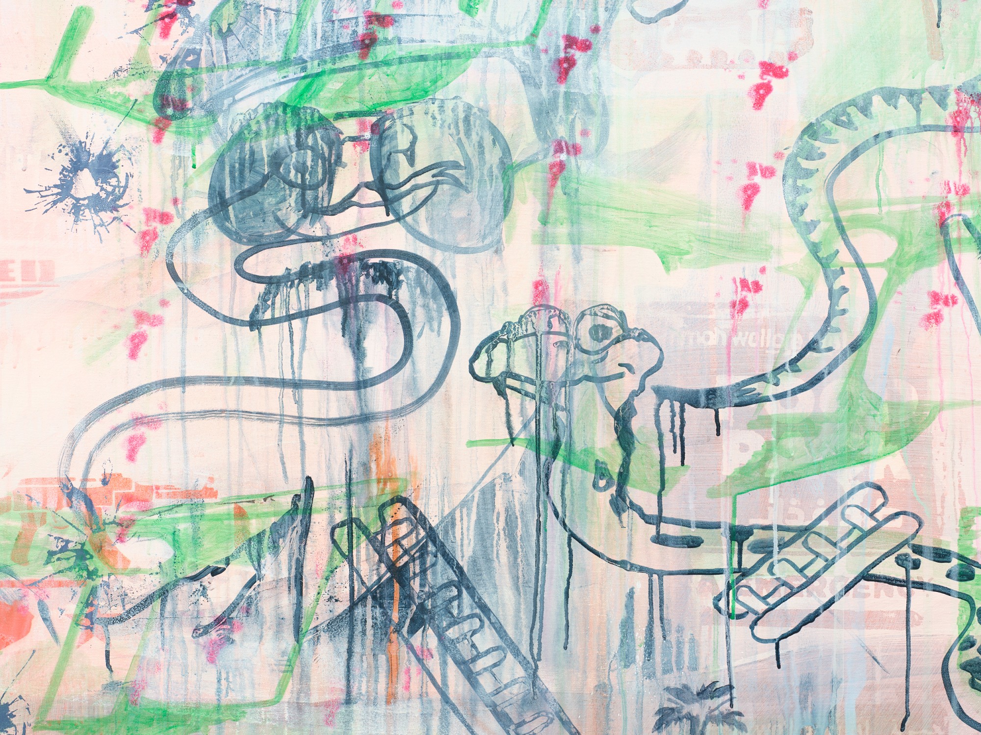 It is rare that a single image can be read in isolation in Yeldezian’s paintings; they bleed into one another, distorting and concealing information, pulling in and out of focus. Paint is applied in sheer but brightly coloured layers, together with sketchy linework and shadowy frottage, sometimes punctured by day-glo stencils. Don’t Welcome Me Mat (2024), a work painted directly onto a loose hanging drop-cloth, functions like collage with space for the eye to journey over the bright dots of a twister board, palm trees, cartoon snakes, bullet holes, and a shroud-like figure of Warhol’s cowboy. In no players online (2024) multiple grids overlap, including the stars and stripes and a supersize game of tic tac toe. The over-loaded image verges on oblivion, the result of a seemingly manic effort to reconcile the medium with it’s subject matter.