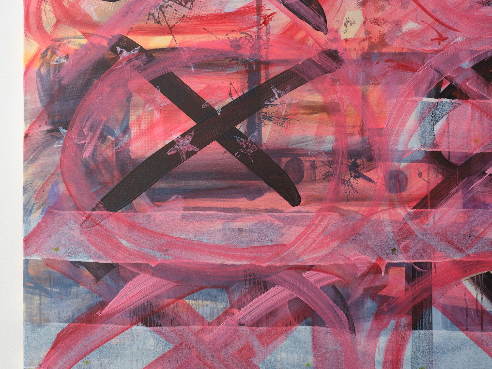 acrylic, spray enamel, charcoal, soft pastel and wax crayon on canvas sheet