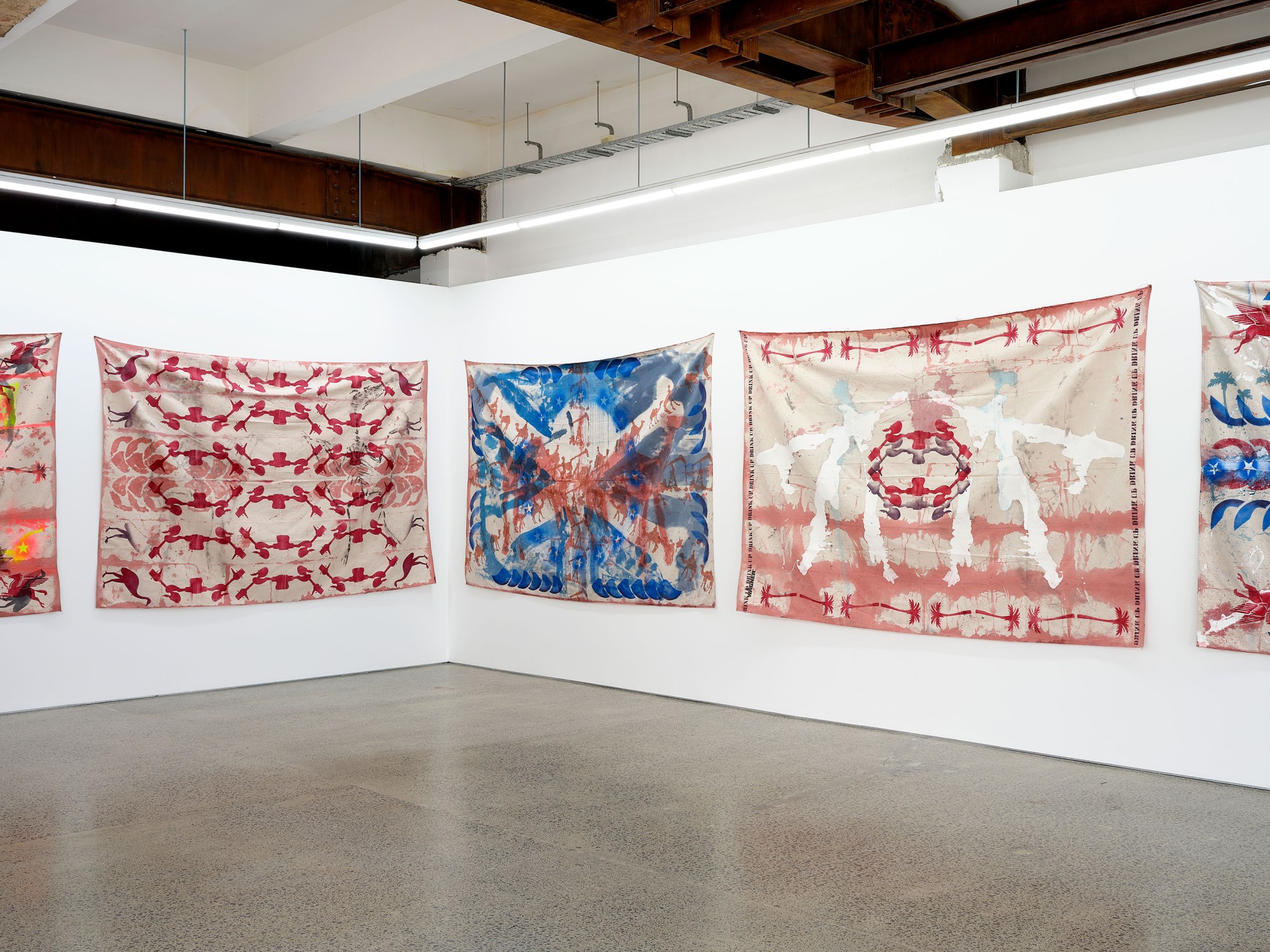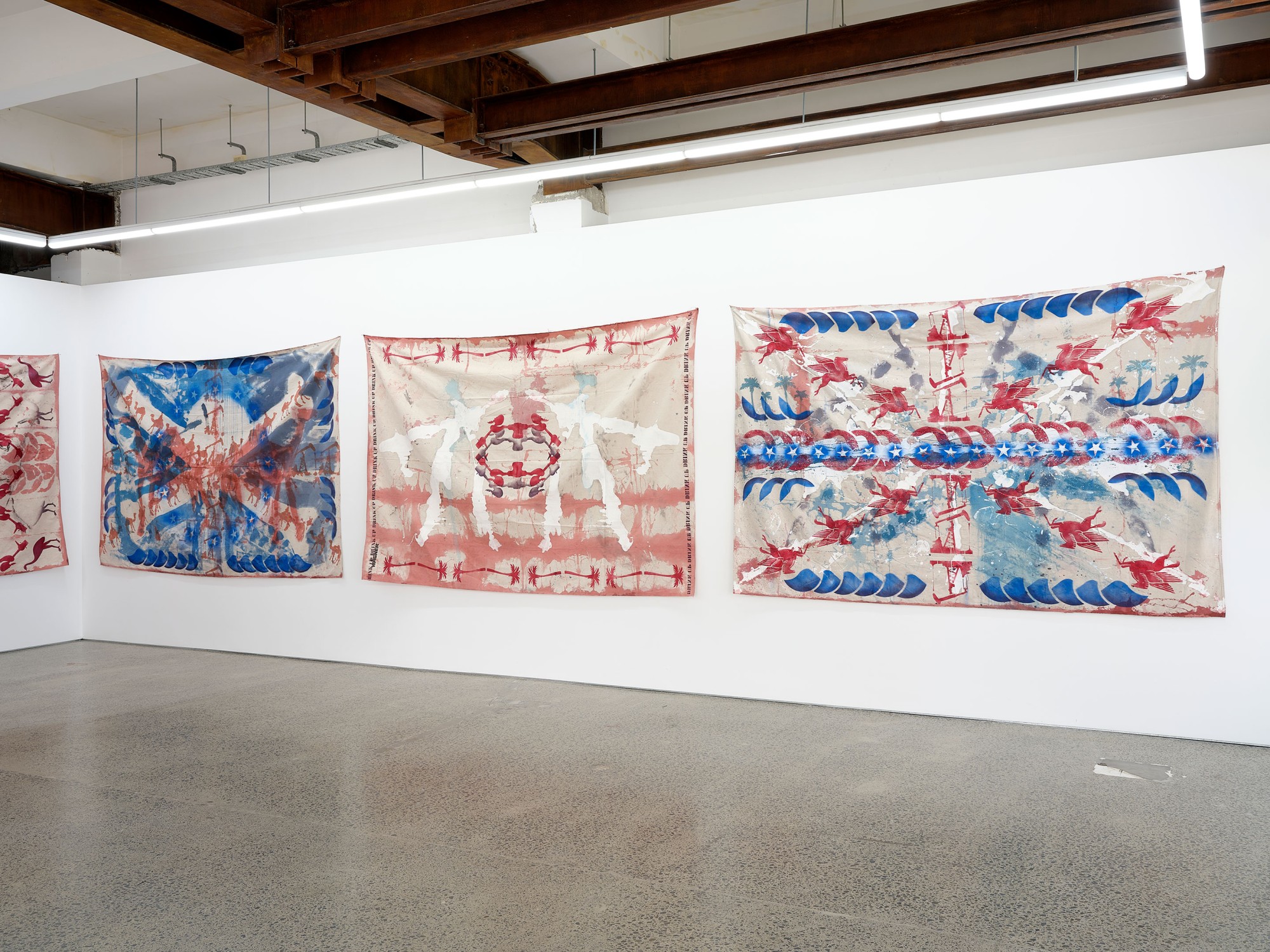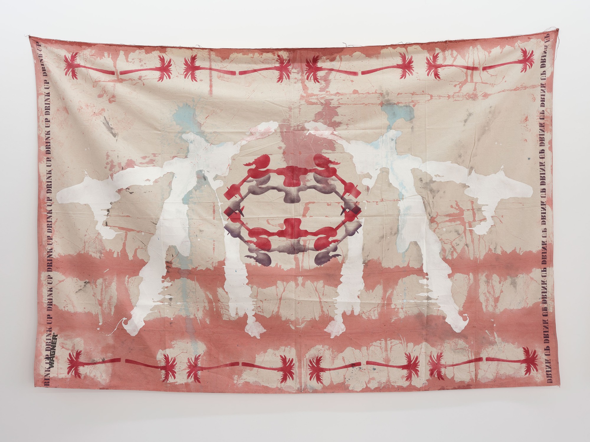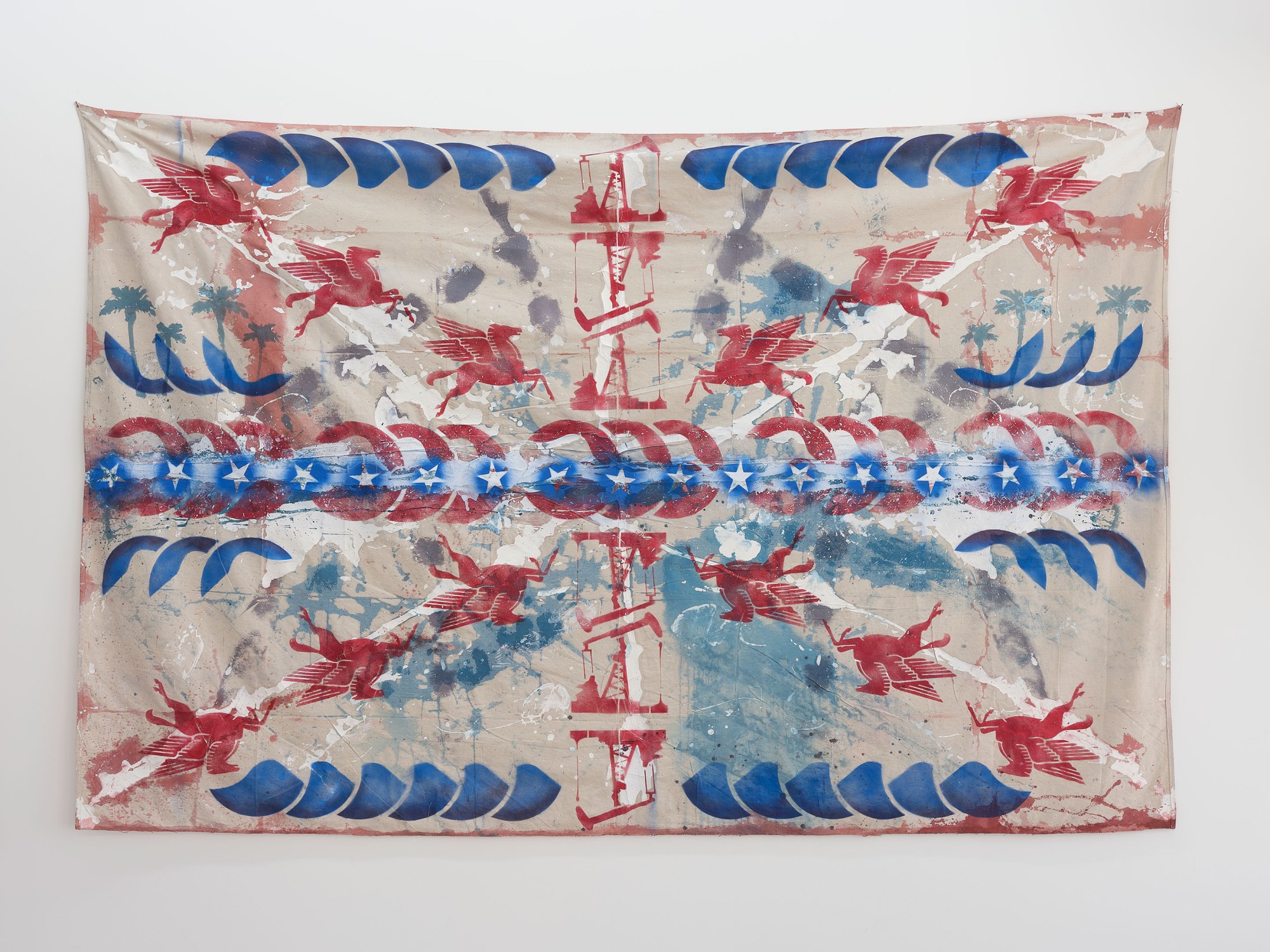 acrylic spray, house paint, acrylic and oil on canvas drop-sheet