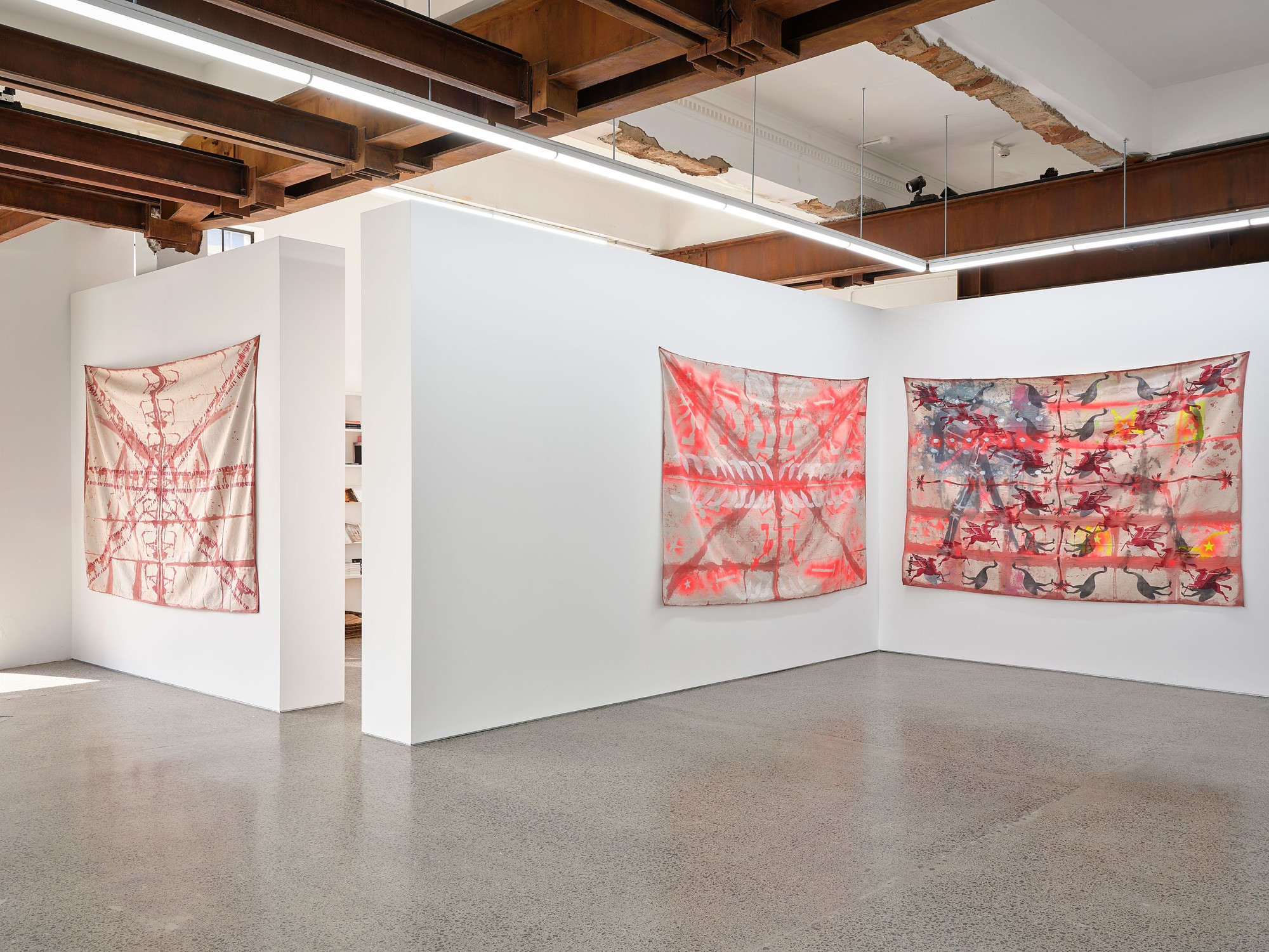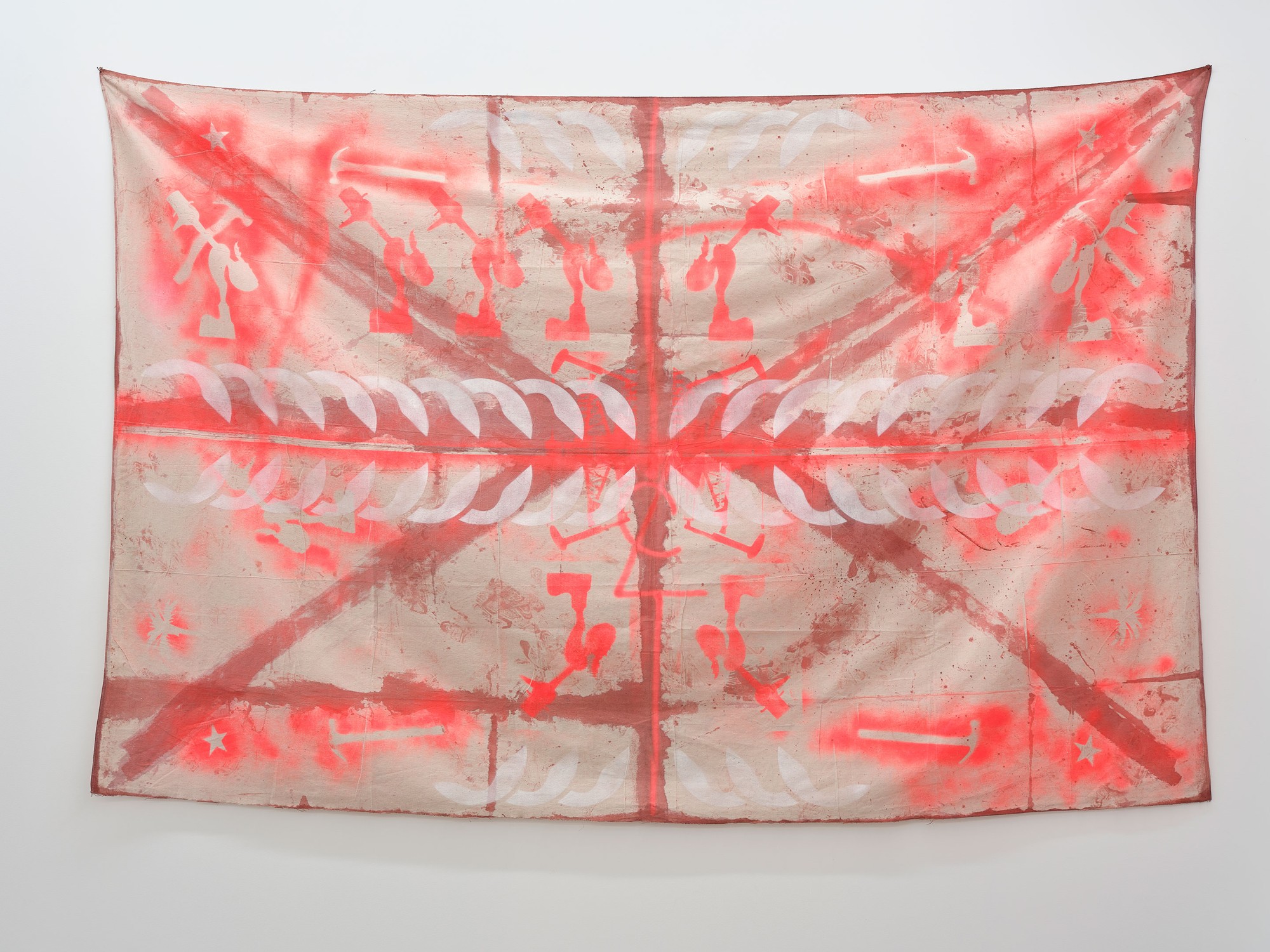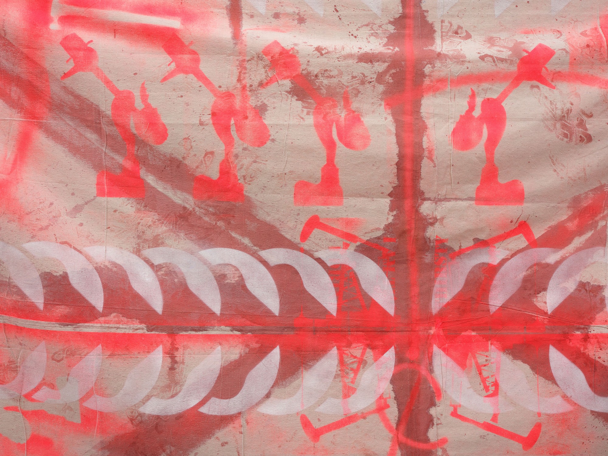 line marking paint, acrylic spray, oil and acrylic on canvas drop-sheet