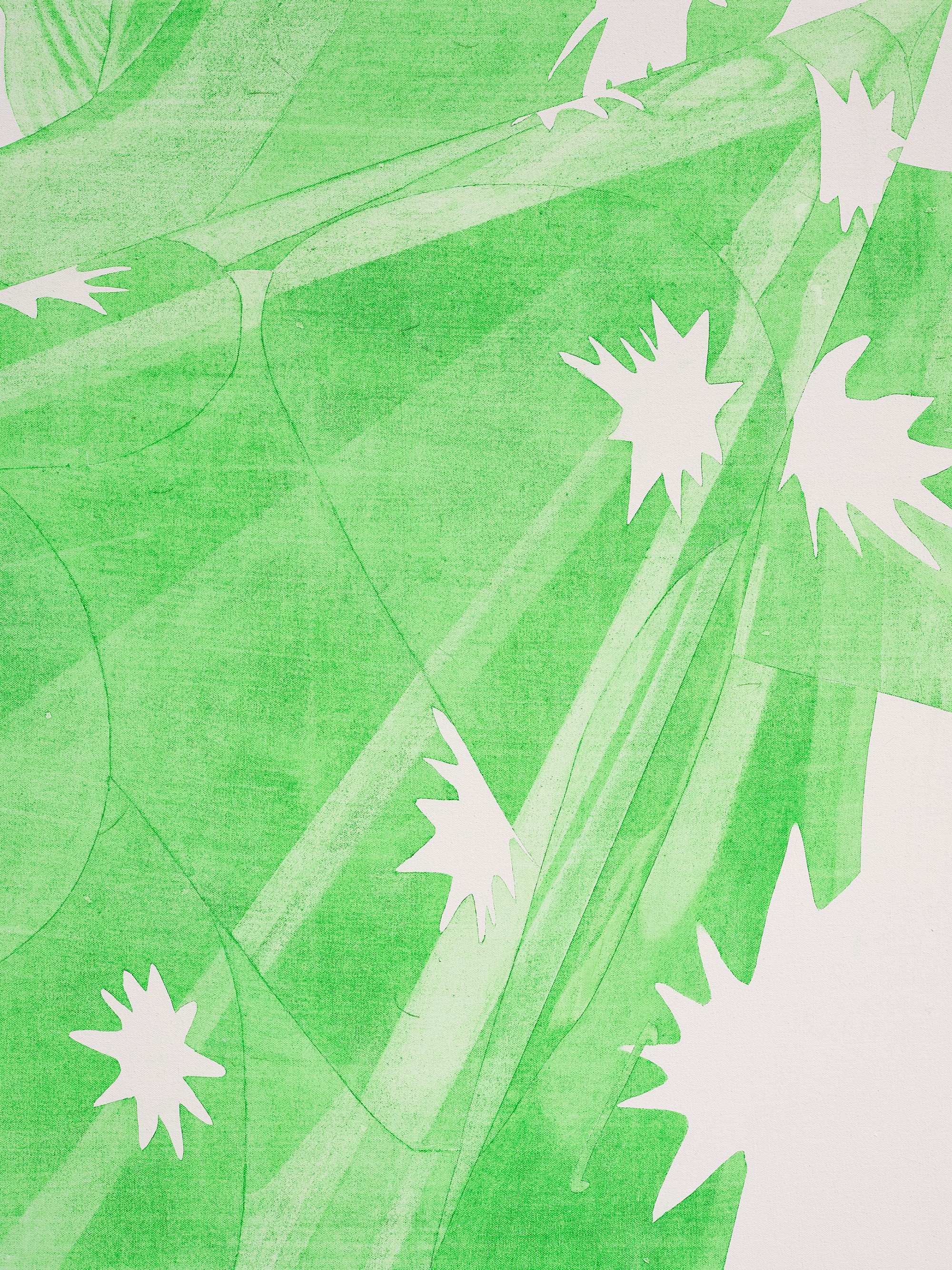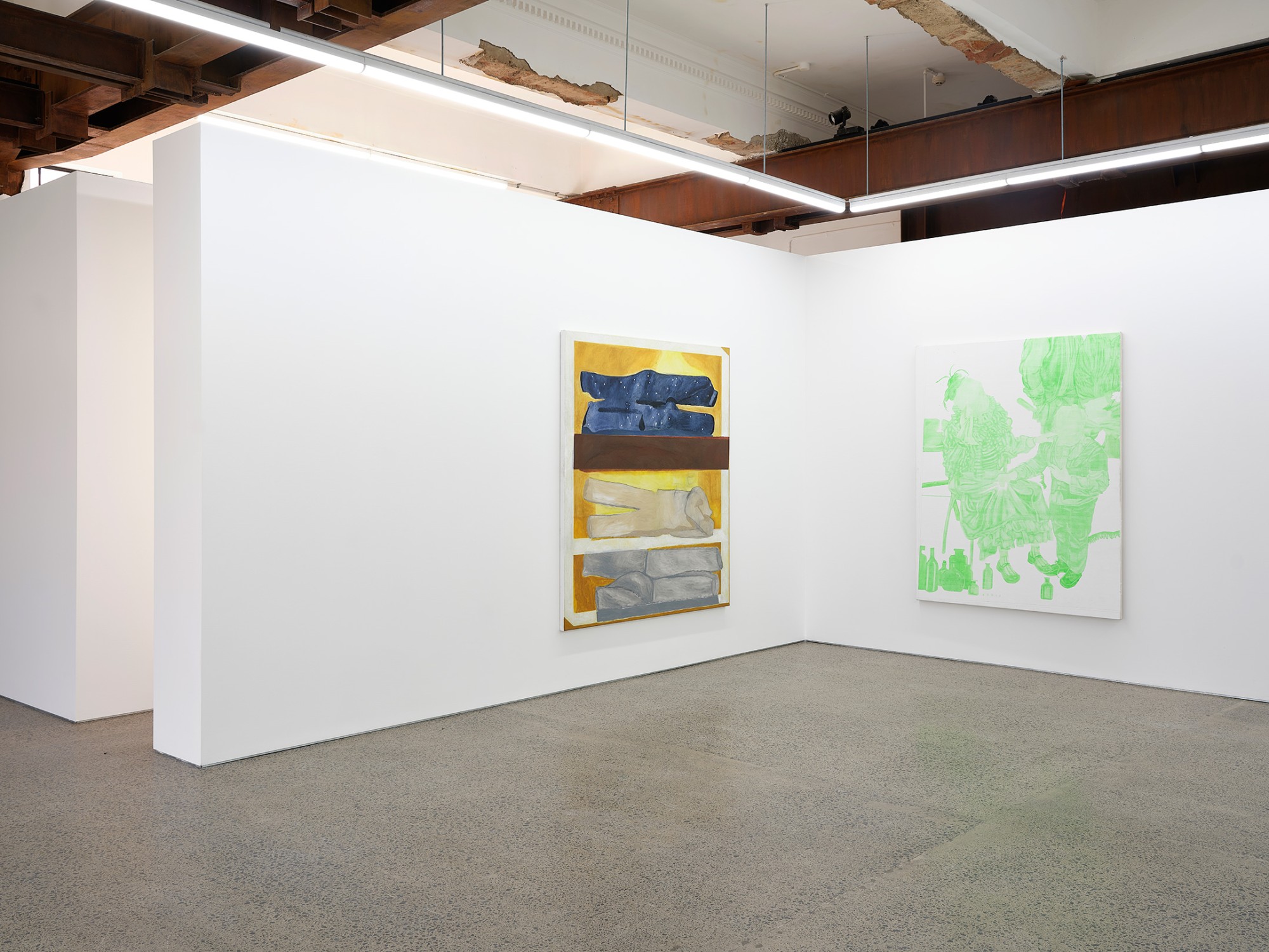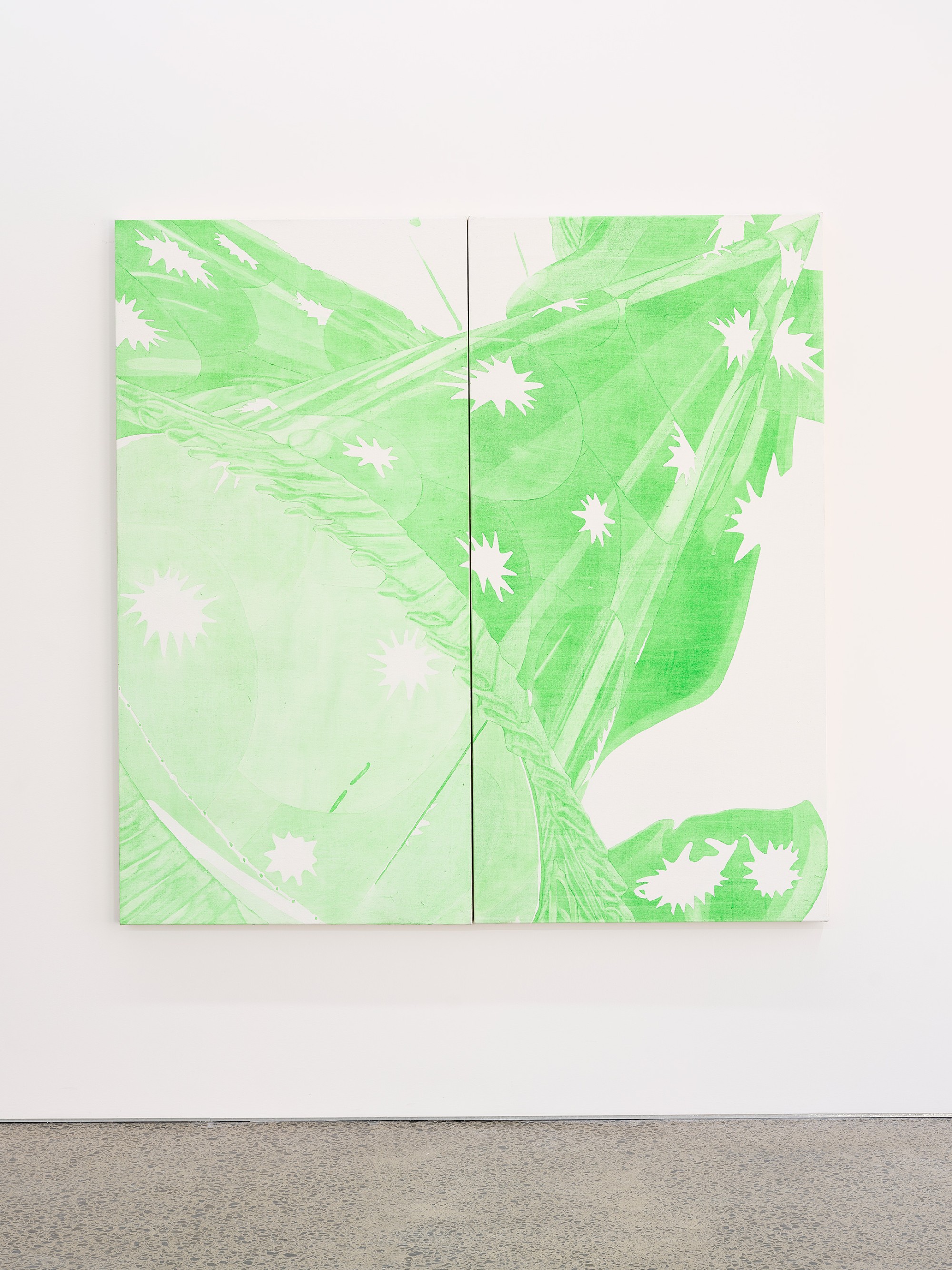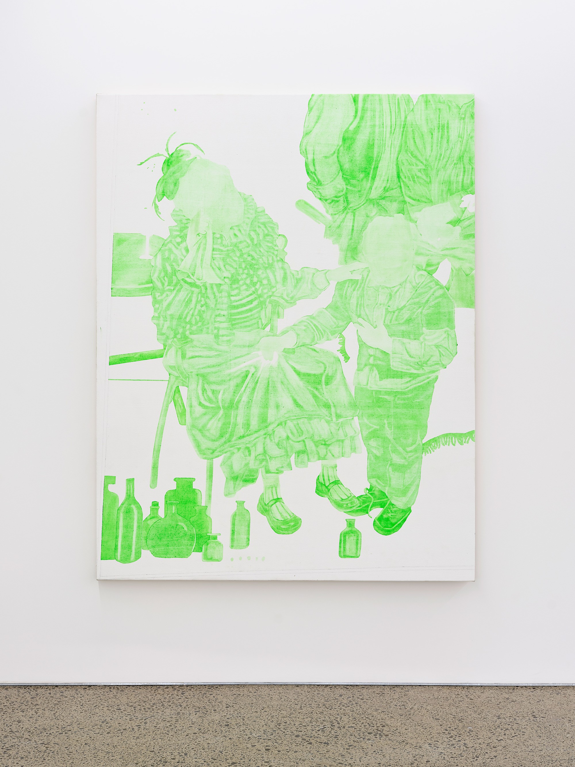 Friedman has been painting paintings of other paintings since 2022; paintings that painters look at, either in adoration or with aversion. Photographs taken by the artist are cropped and projected onto the canvas, then painted exclusively in a single colour: Kama fluorescent green. Friedman avoids expressive or subjective decisions about the application of paint, where possible, in an attempt to “deny the hand”. Friedman's pictures increasingly operate in relation to her writing practice and the built identity of a painter.