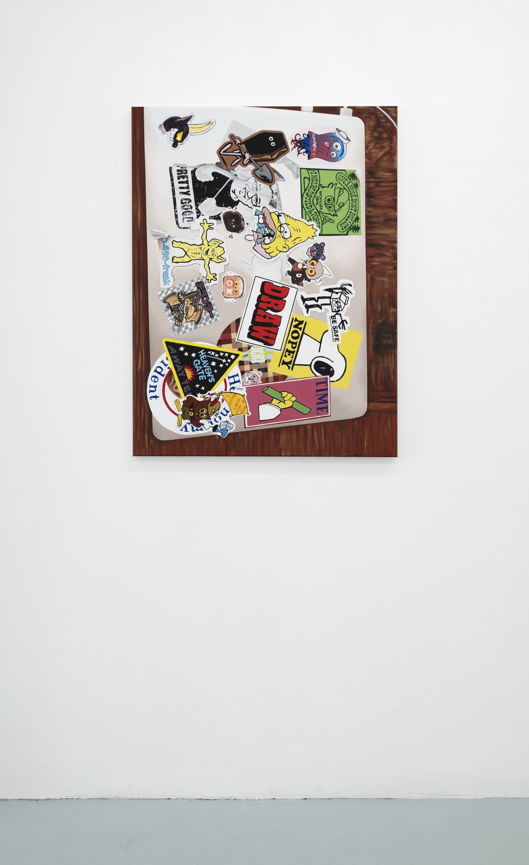 As always, Wagstaff’s subject matter is carefully chosen for both it’s legibility as a cultural sign, and for it usefulness in the artist’s ongoing critique of value and taste. Like the fashion images and tattoos from Wagstaff’s previous paintings, the laptops and their stickers are tools of identity formation and display. While the personal brand of each user is specific to their device, the jumble of symbols – characters from the Simpsons, Pokémon, a Mona Lisa dj-ing, aliens, self-help slogans, coder in-jokes – give an overall impression of young people who are vaguely counter-cultural and very online.