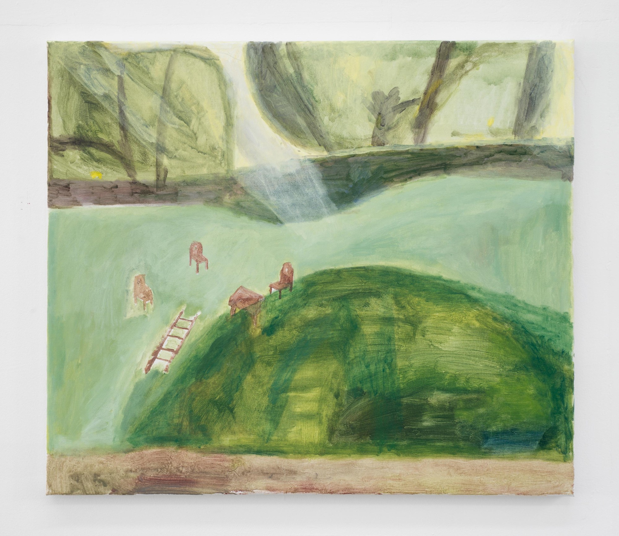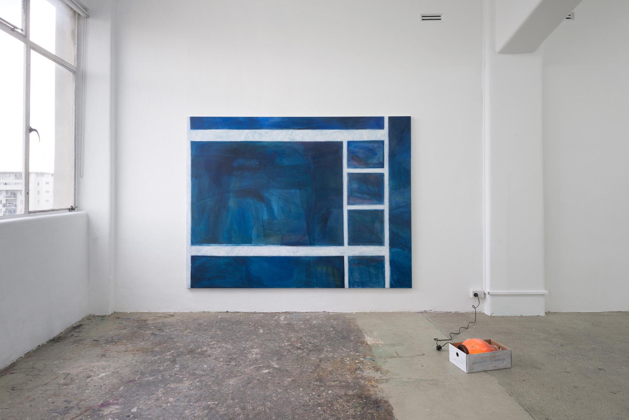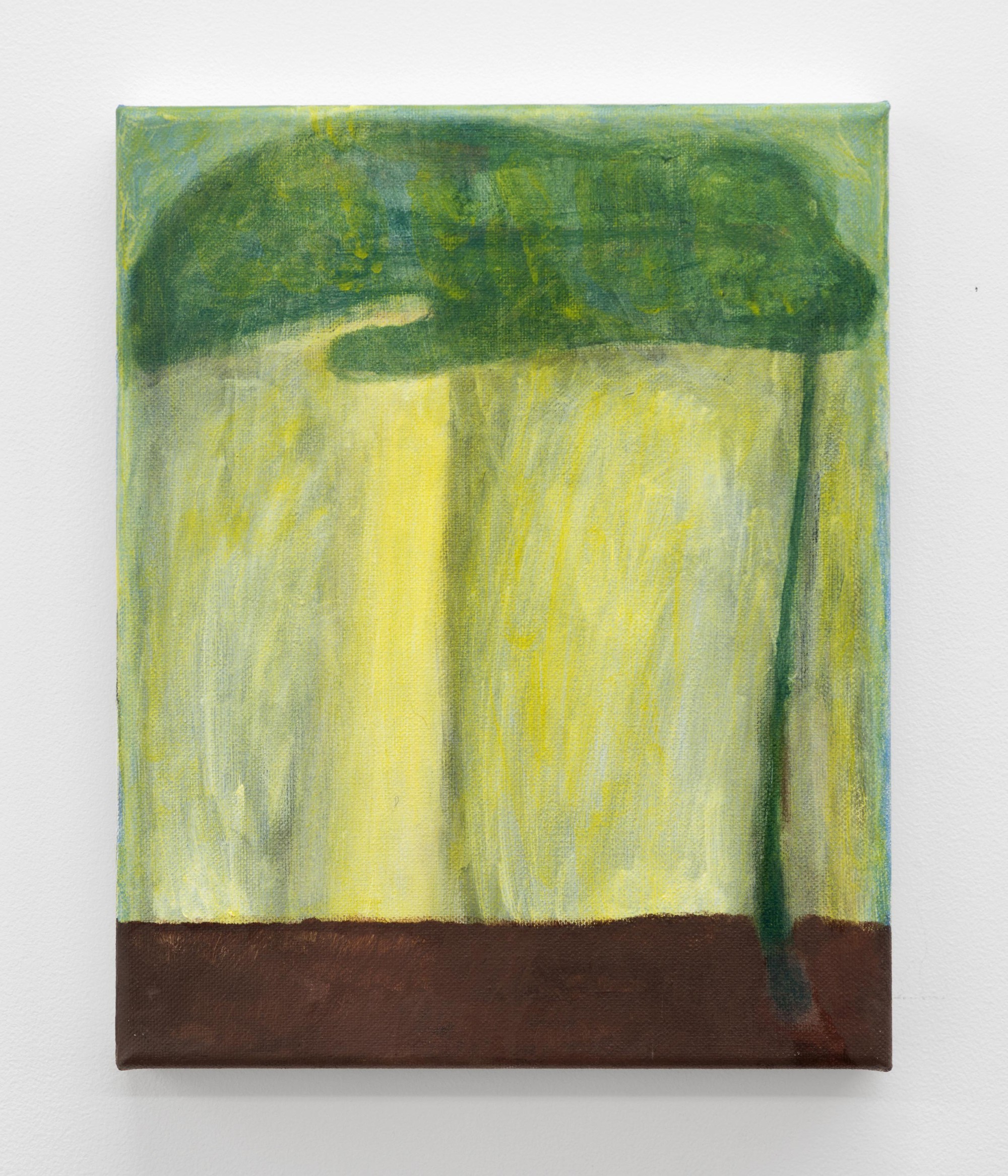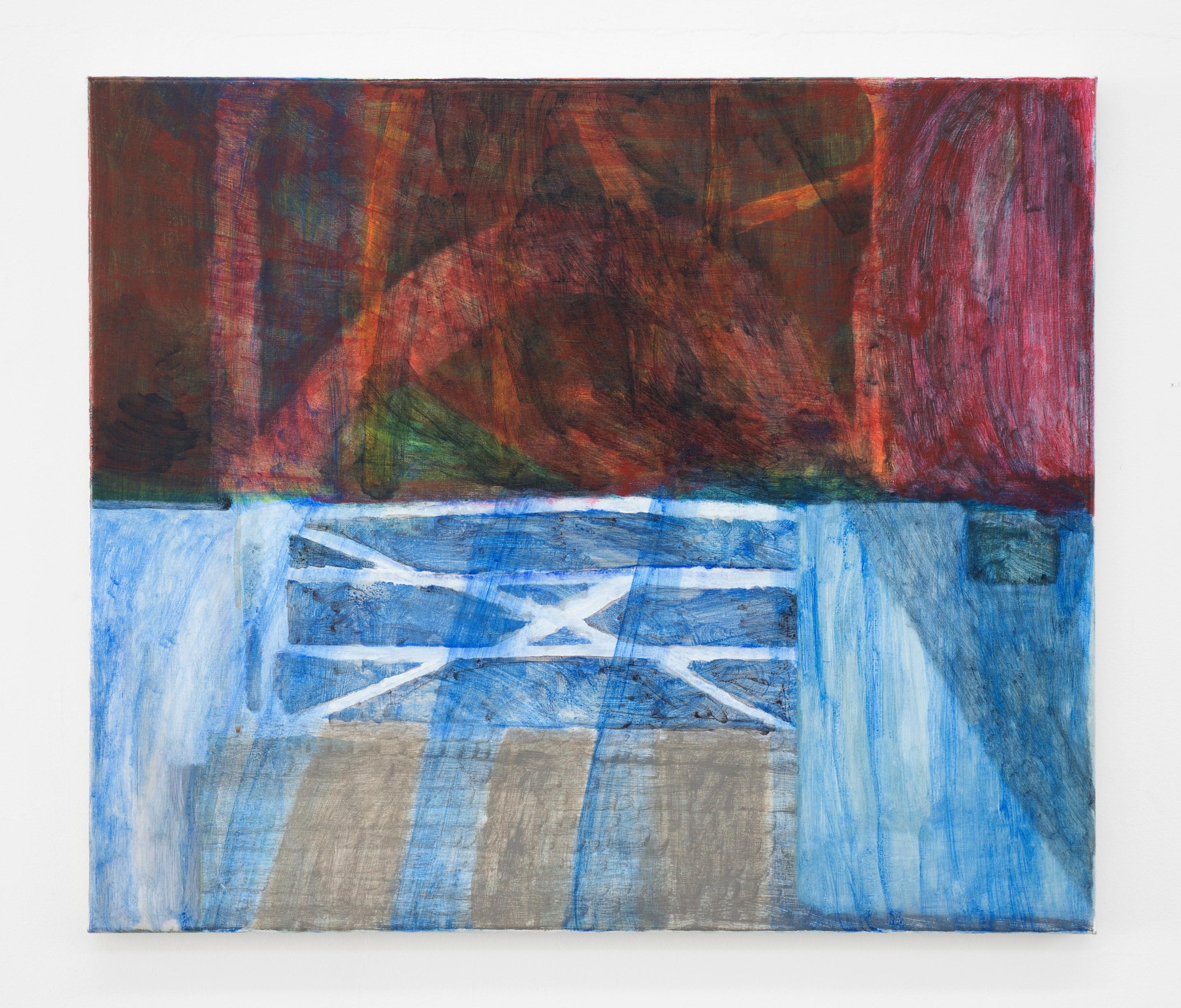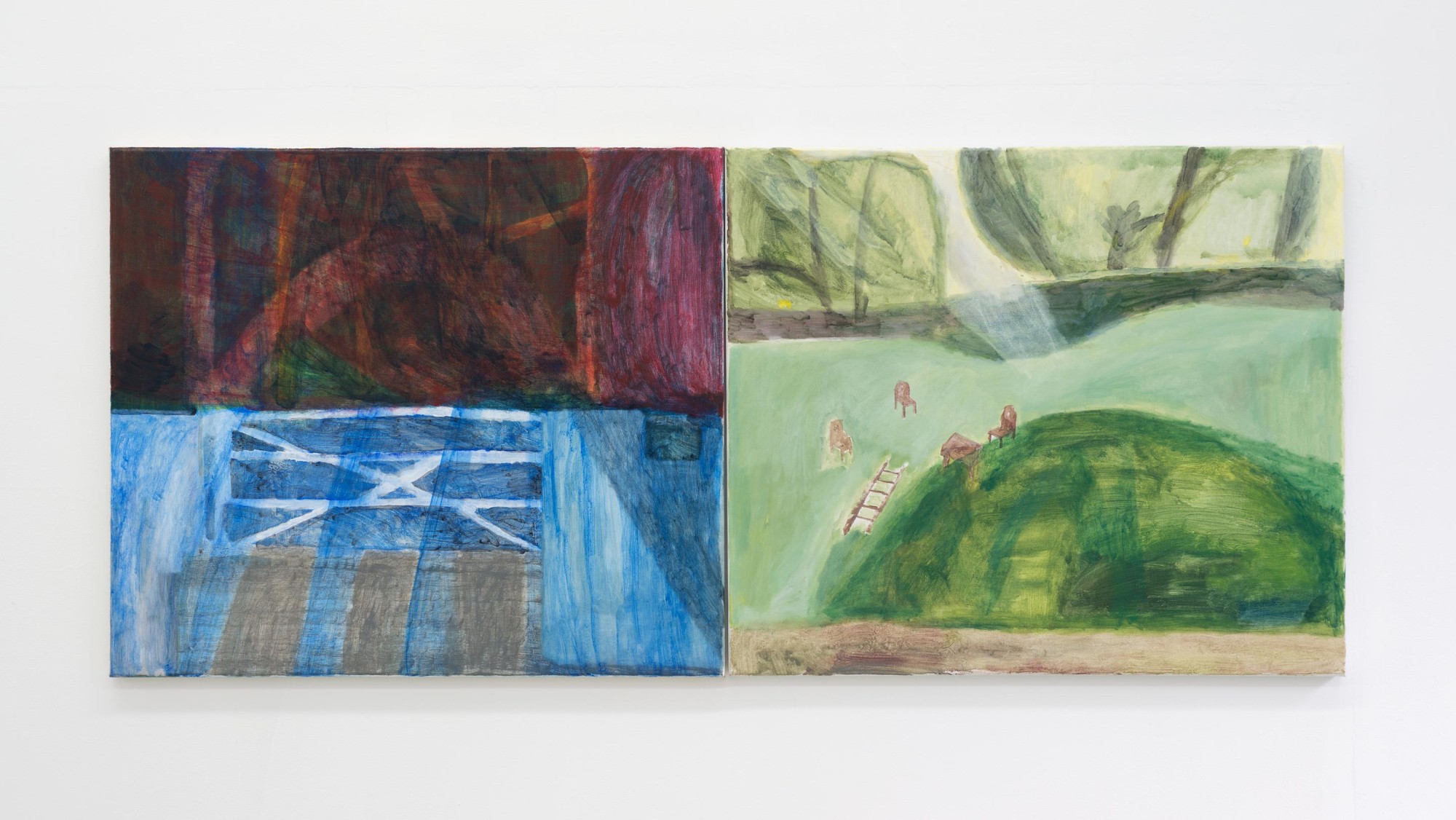 The series of small paintings for instance seem to be thematically concerned with childhood, alternating in a night and day rhythm towards Primary, the large painting hung at the far end of the gallery, that suggests a dreamy night-time landscape, seen through the abstracted profile of a bunk-bed.