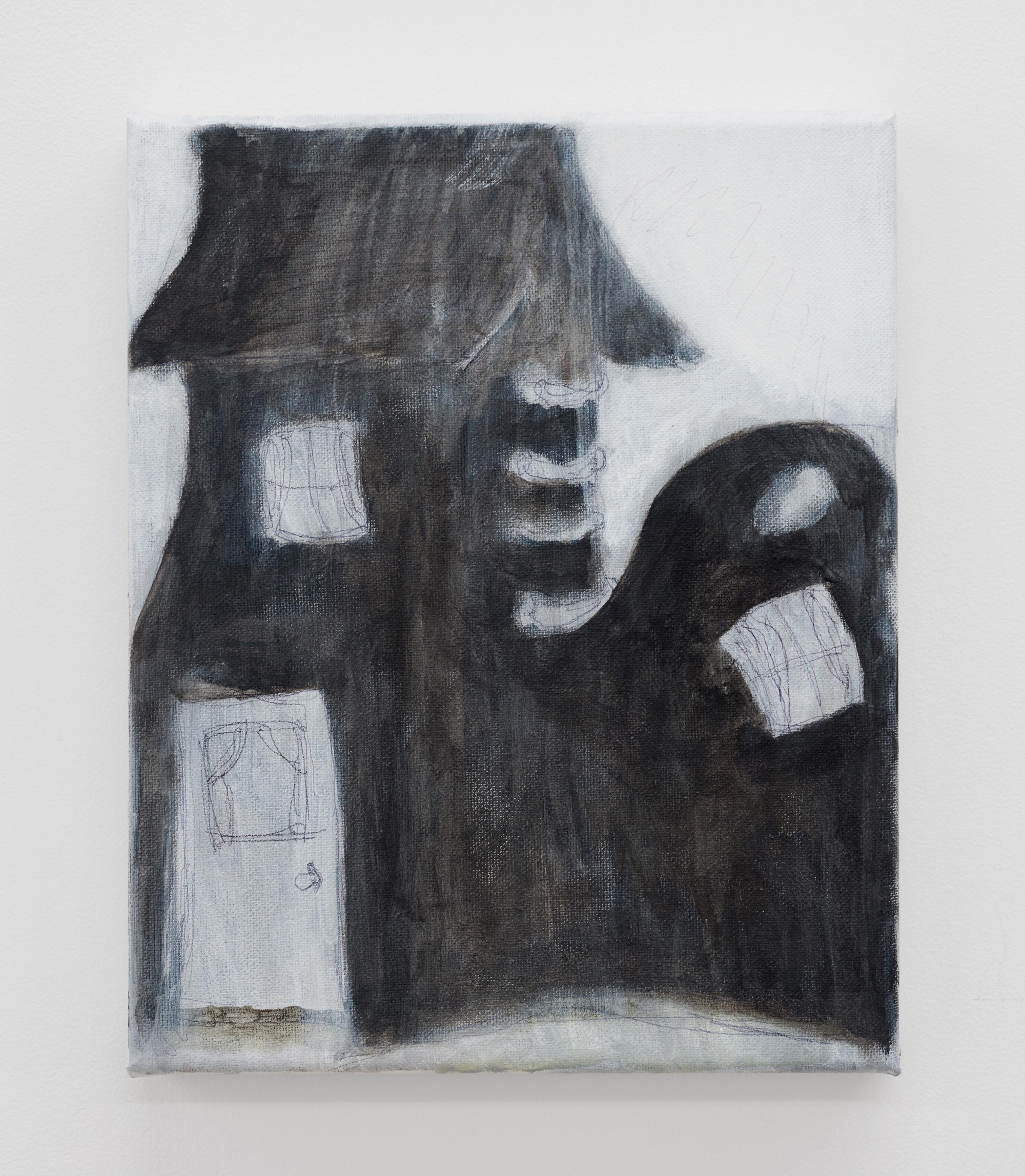 Within this series, Pumice seems to be a key painting, sharing its title with the exhibition. In it we see a sketchy, grey toned depiction of a goofily proportioned shoe that doubles as a house, referring the viewer back to an old nursery rhyme; 'There was an old woman who lived in a shoe'. Do a cursory search online about the poem and you'll find interpretations that ground its evocation of deprivation and a mother's tough love in the context of 18th century British imperialism.