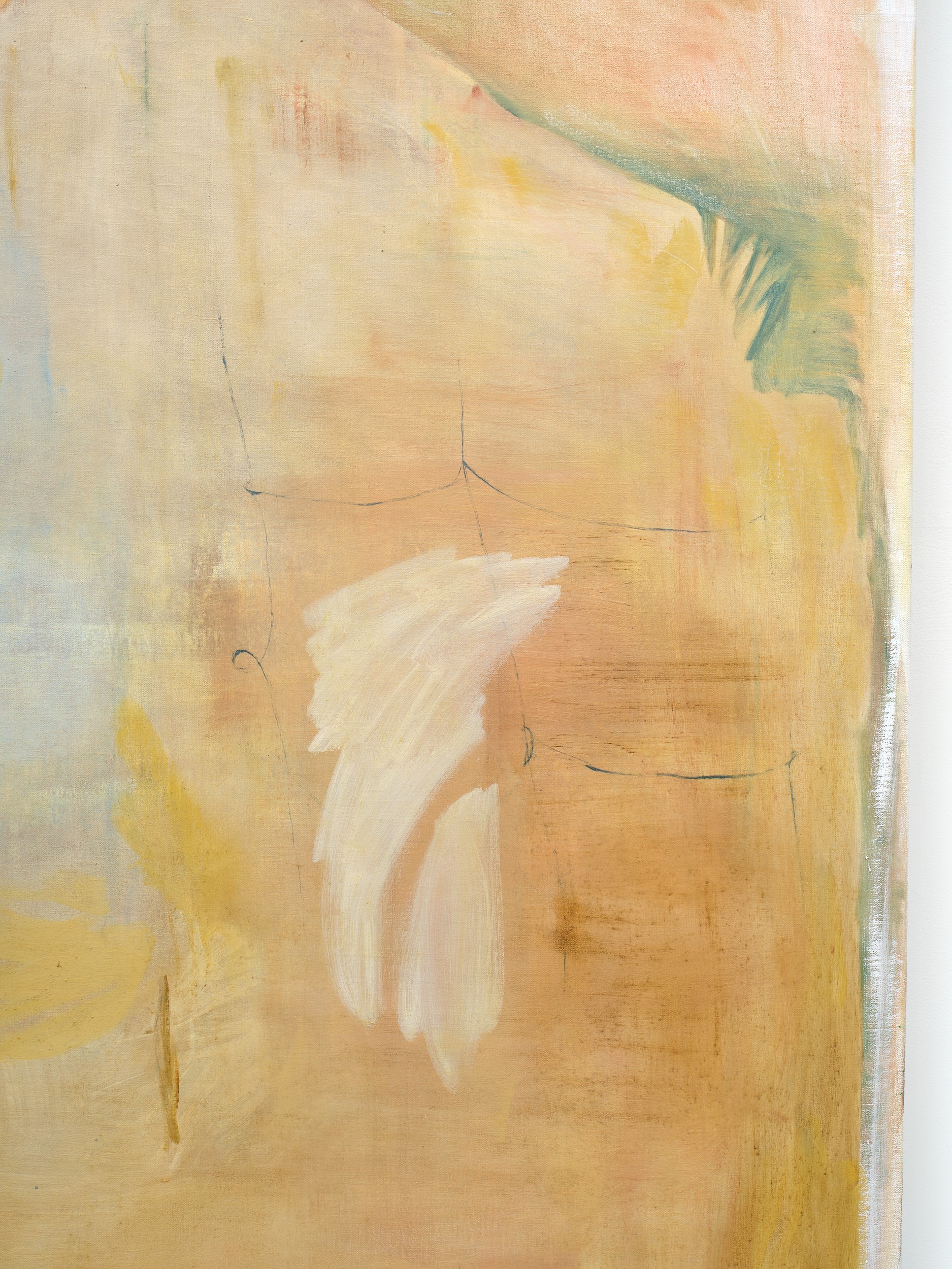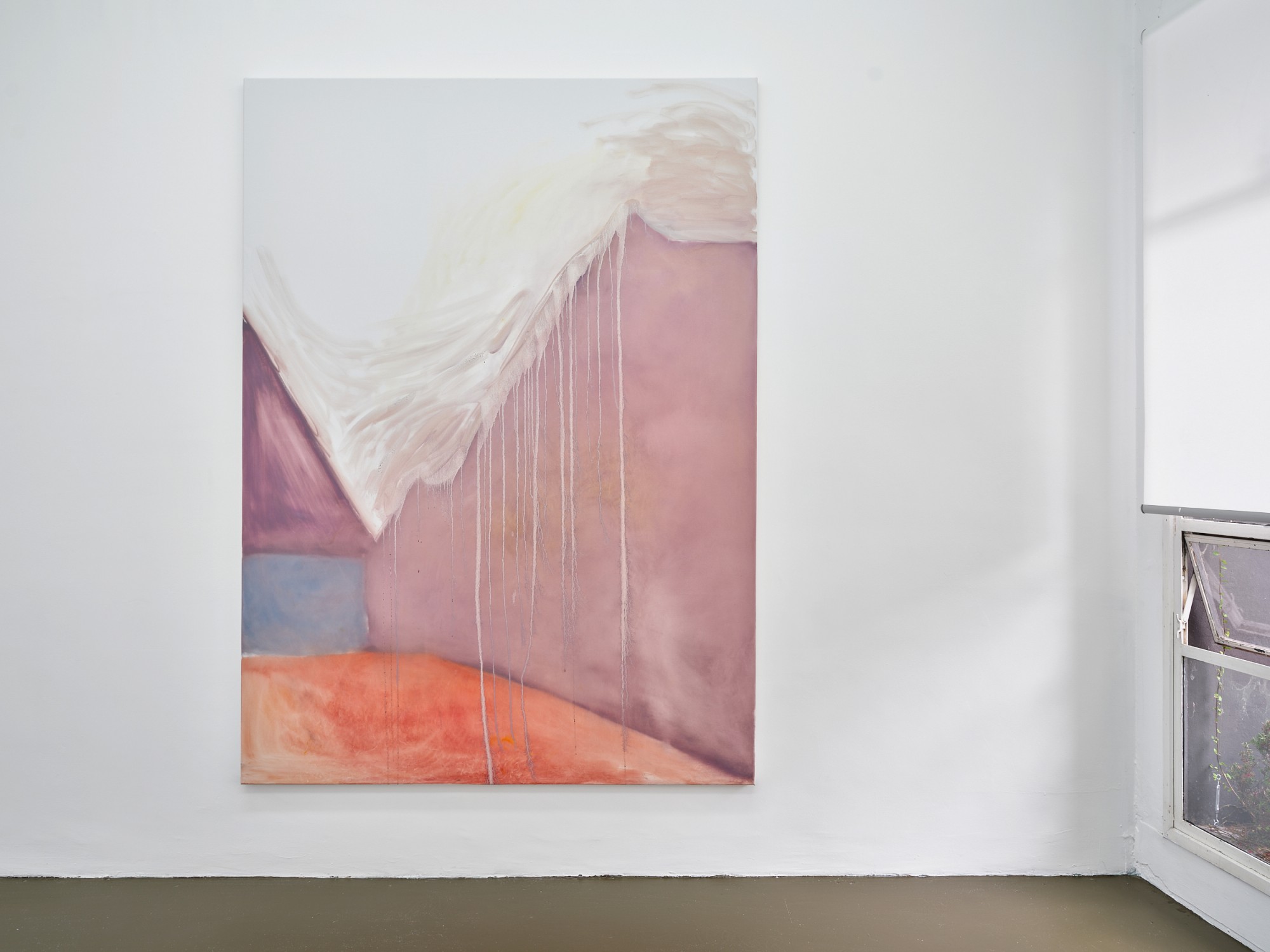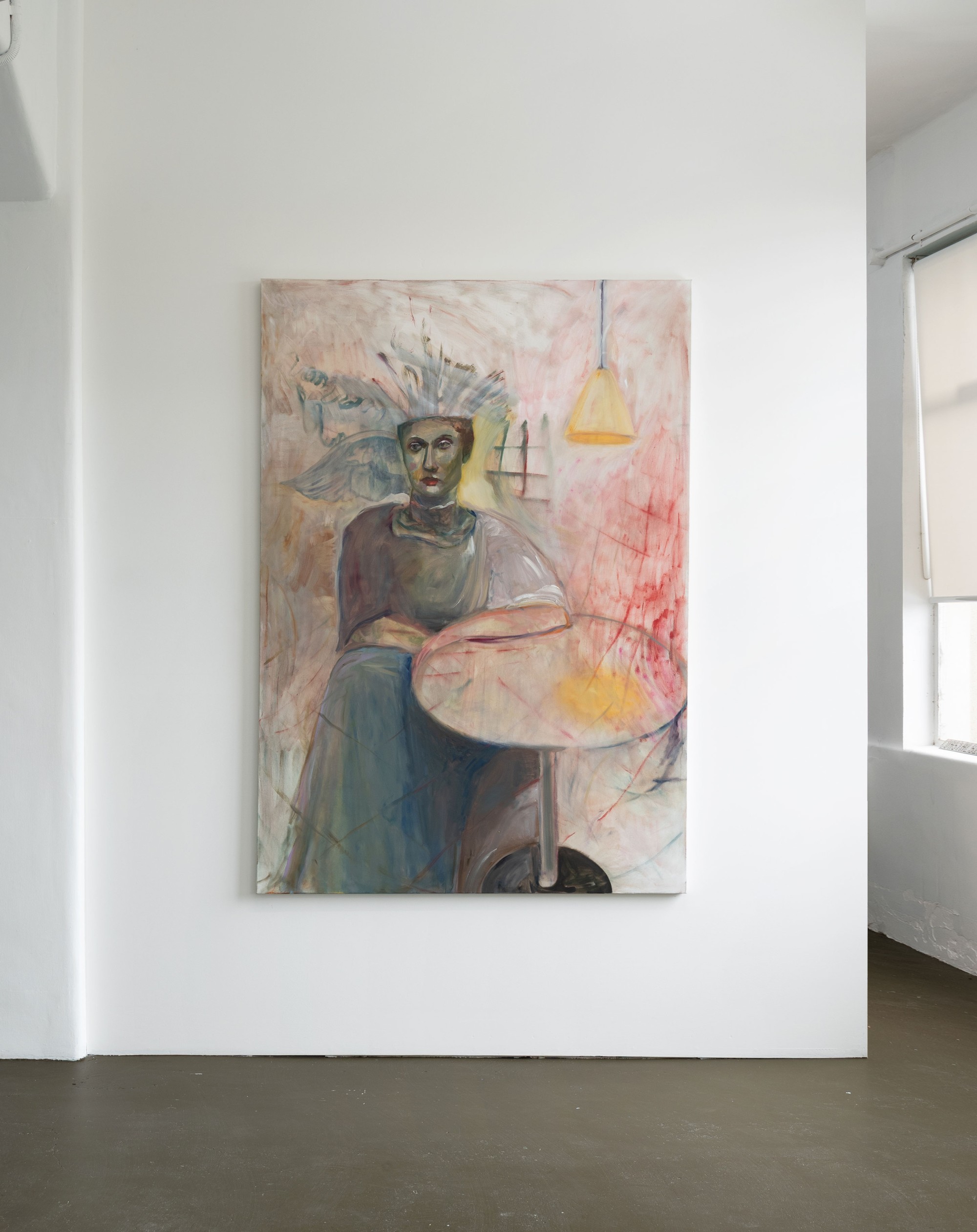 In Shivers, as in many of Jannides’ recent exhibitions, time appears to be playing tricks. Both within the confines of a single painting – in the contrary speeds of mark-making – and in a broader sense, as the artist conjures motifs and settings of her early work. Shivers features phantoms of paintings-past – veiled subjects and rooms, arches, and perhaps the most iconic marker of time, the shining sun/moon – which taken together disclose an eerie process of return.
