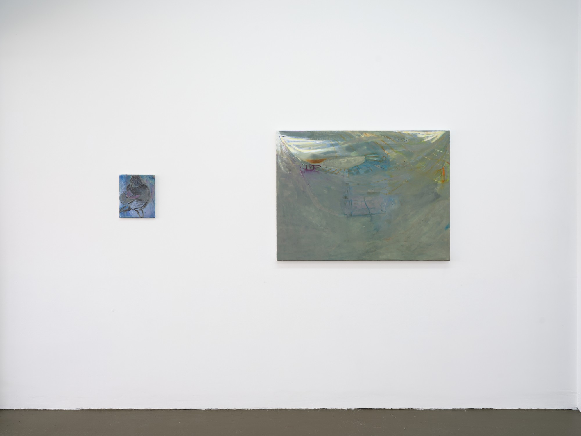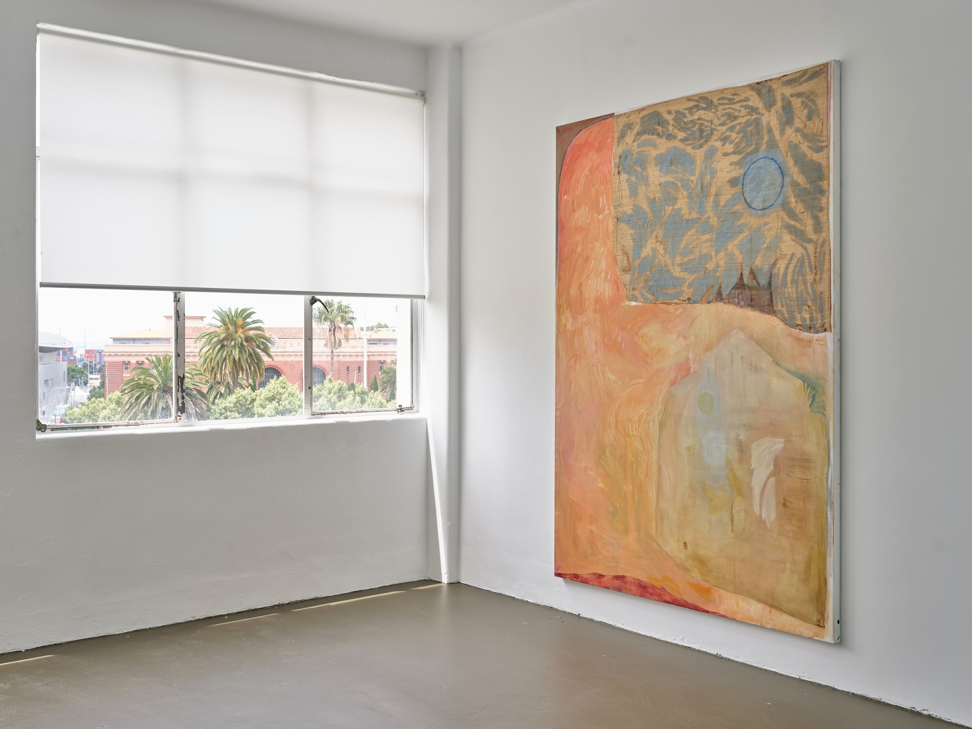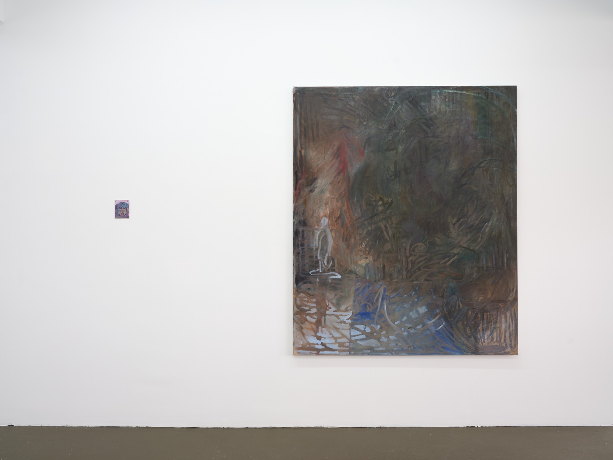 In Shivers, as in many of Jannides’ recent exhibitions, time appears to be playing tricks. Both within the confines of a single painting – in the contrary speeds of mark-making – and in a broader sense, as the artist conjures motifs and settings of her early work. Shivers features phantoms of paintings-past – veiled subjects and rooms, arches, and perhaps the most iconic marker of time, the shining sun/moon – which taken together disclose an eerie process of return.