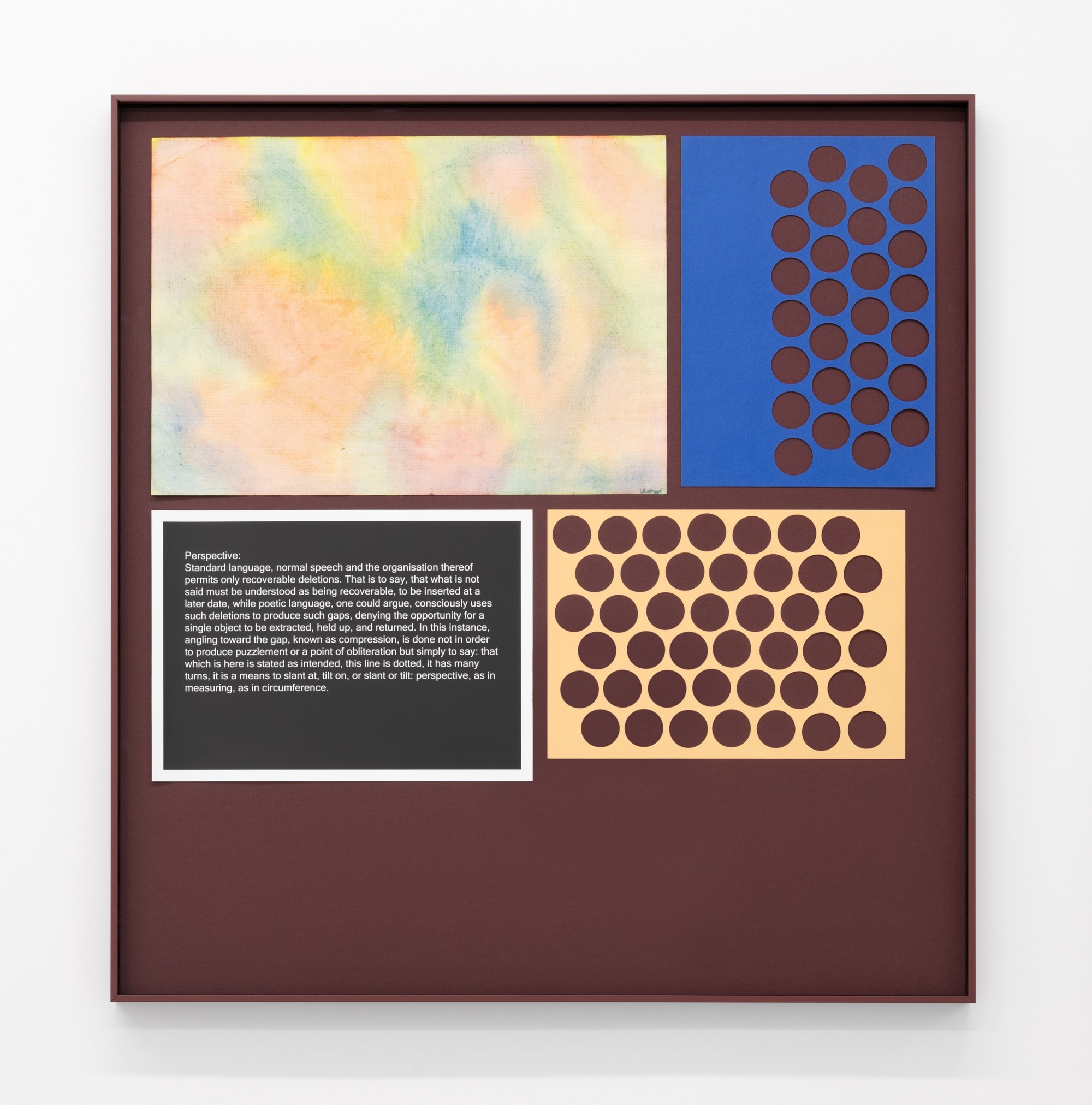 As the title (borrowed from a chapter of prose by Bernadette Mayer) suggests, Buchanan’s new exhibition is as complex as a life is. Both dense and transient, the collection of work in The Arrangement... suggests diaphonous boundaries between art-making and domestic life, and between the abstract and the concrete.