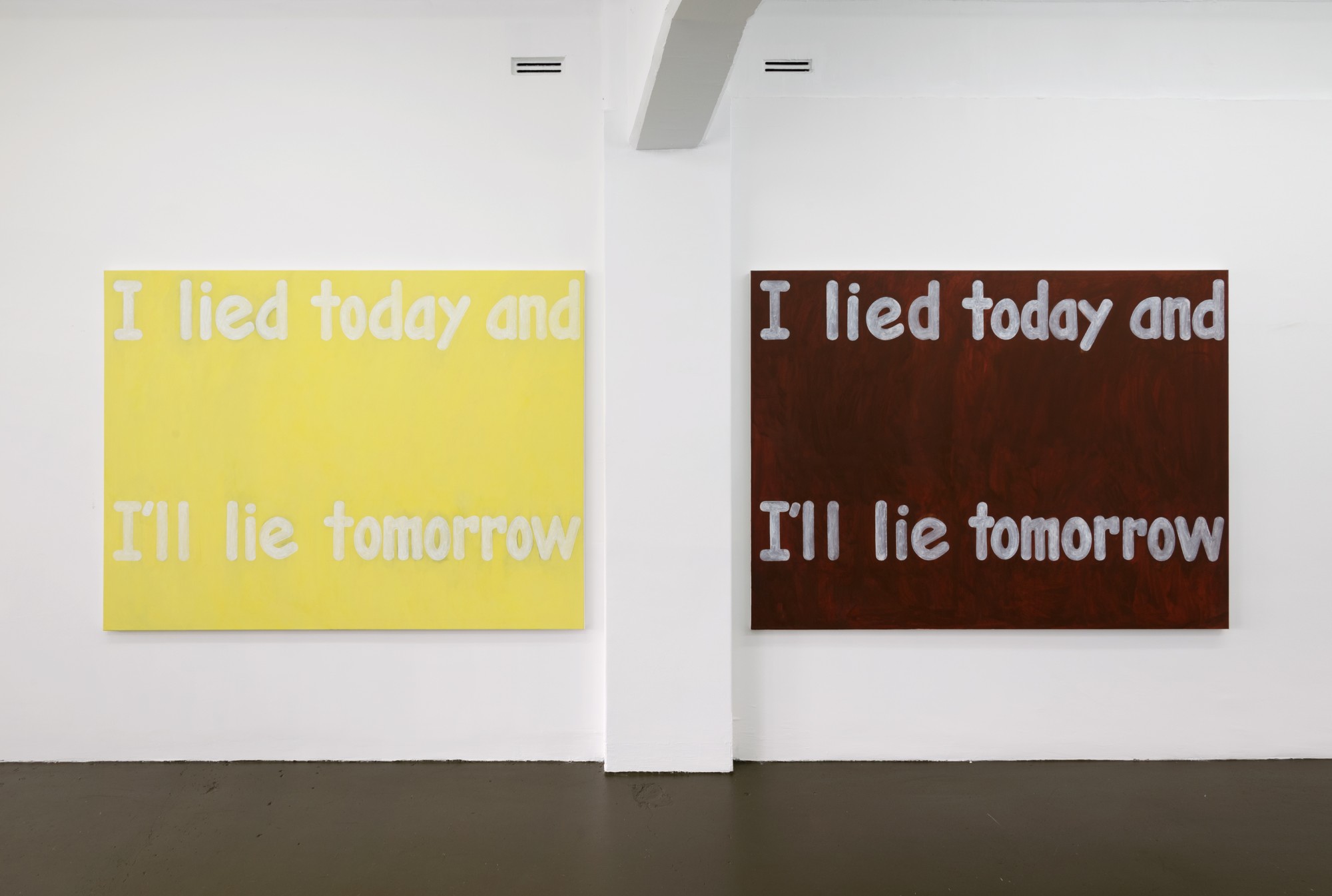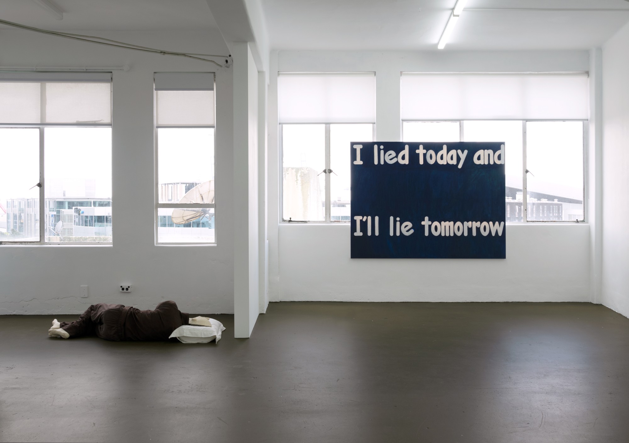 Affirmations comprises a series of large text paintings in a range of colours that say the same thing (the ‘affirmations’ of the exhibition’s title), as well as a life-sized sculpture of the artist sleeping in the corner of the gallery.