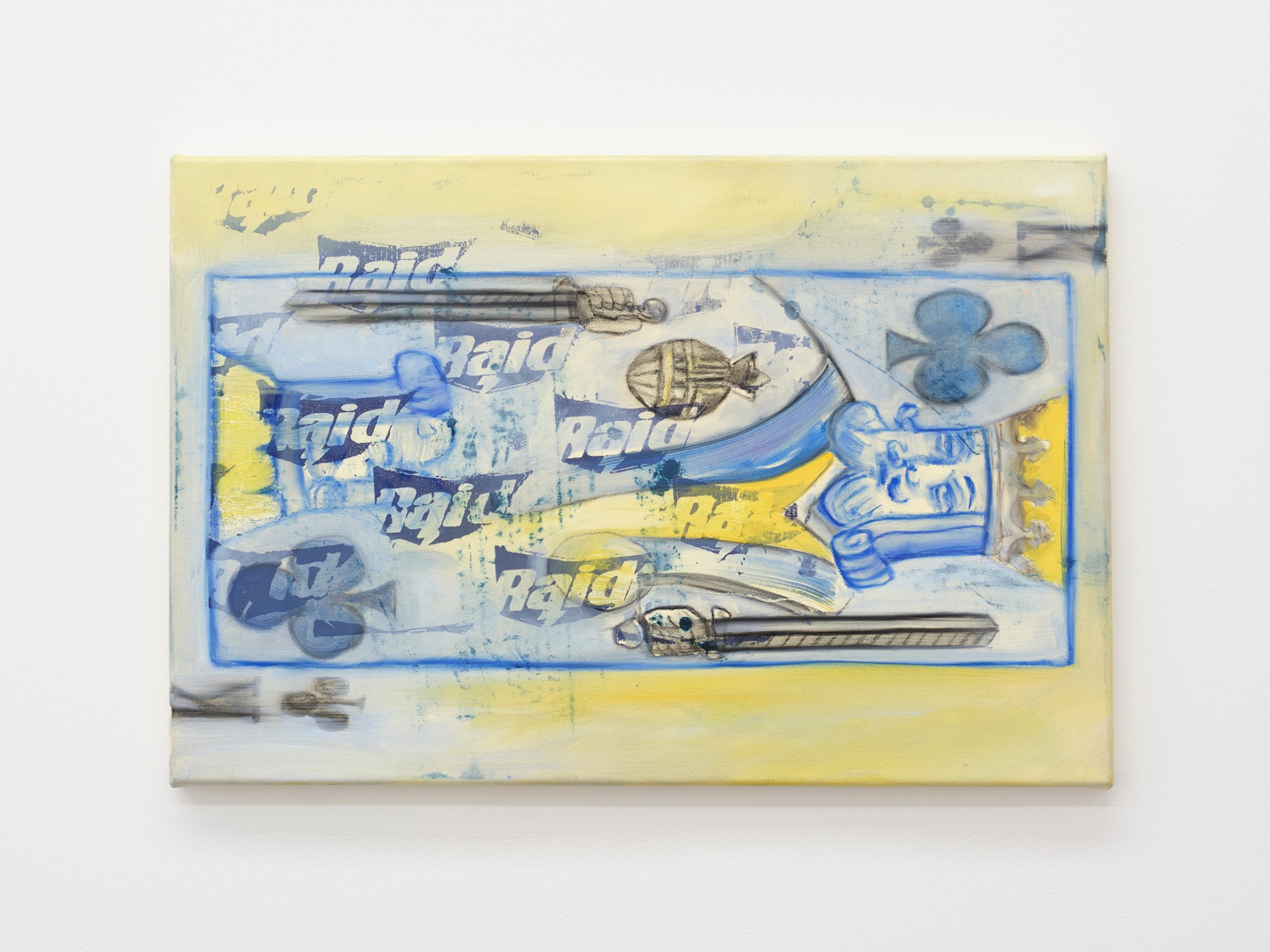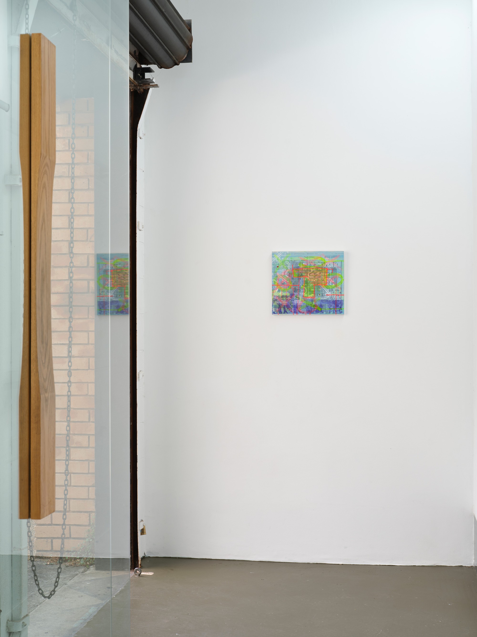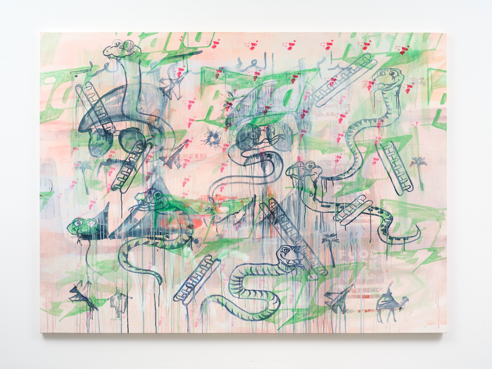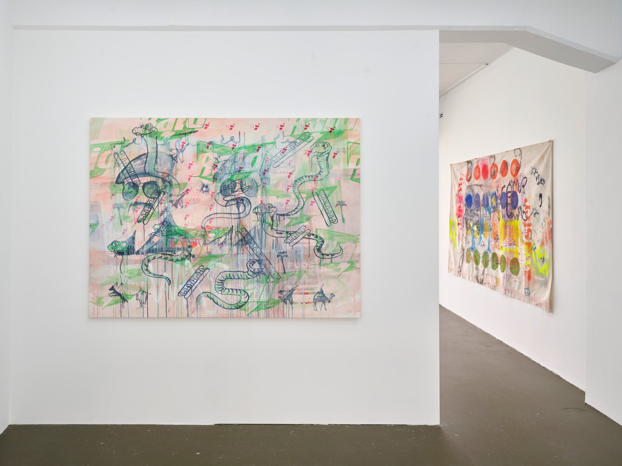 It is rare that a single image can be read in isolation in Yeldezian’s paintings; they bleed into one another, distorting and concealing information, pulling in and out of focus. Paint is applied in sheer but brightly coloured layers, together with sketchy linework and shadowy frottage, sometimes punctured by day-glo stencils. Don’t Welcome Me Mat (2024), a work painted directly onto a loose hanging drop-cloth, functions like collage with space for the eye to journey over the bright dots of a twister board, palm trees, cartoon snakes, bullet holes, and a shroud-like figure of Warhol’s cowboy. In no players online (2024) multiple grids overlap, including the stars and stripes and a supersize game of tic tac toe. The over-loaded image verges on oblivion, the result of a seemingly manic effort to reconcile the medium with it’s subject matter.