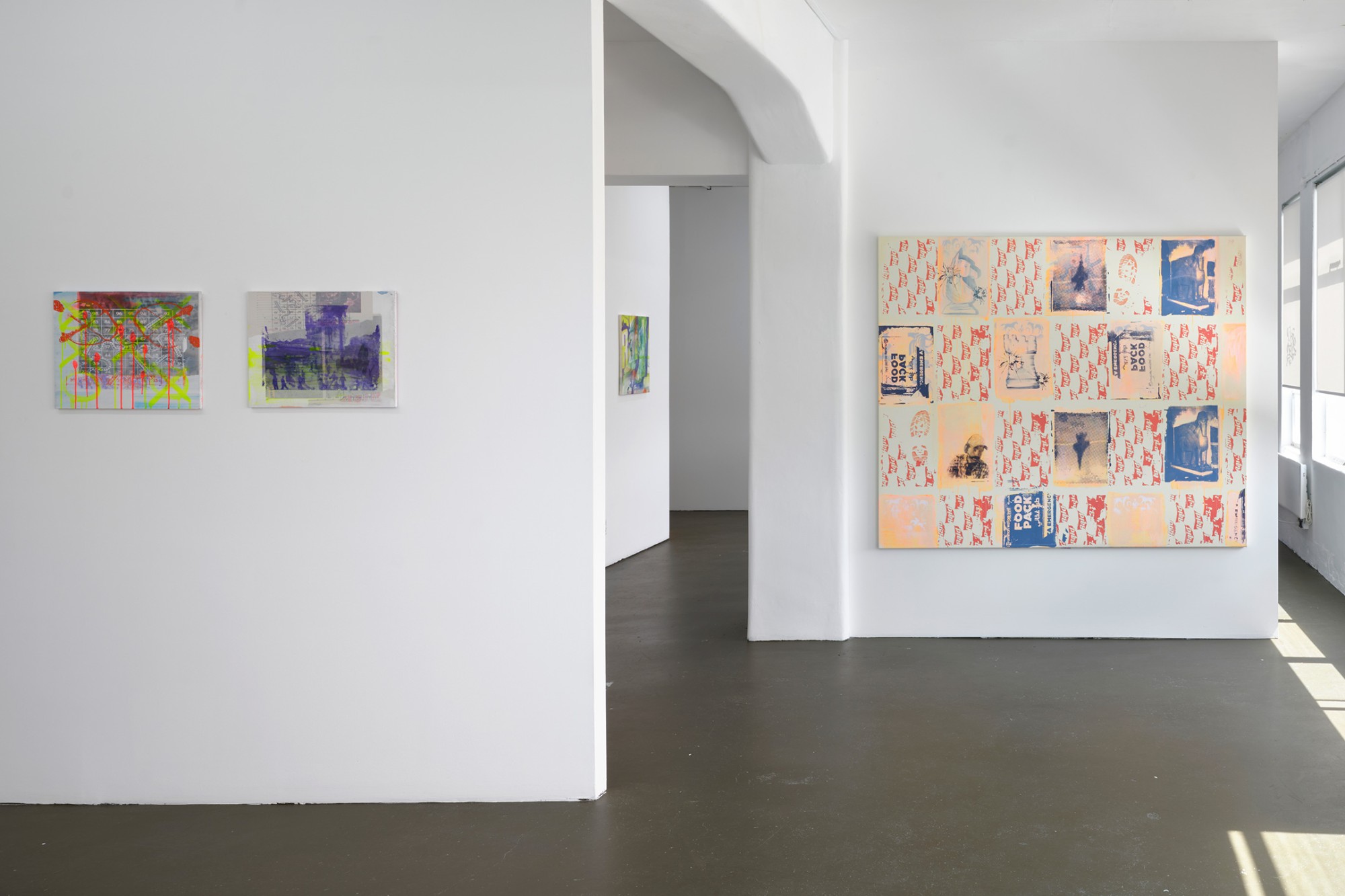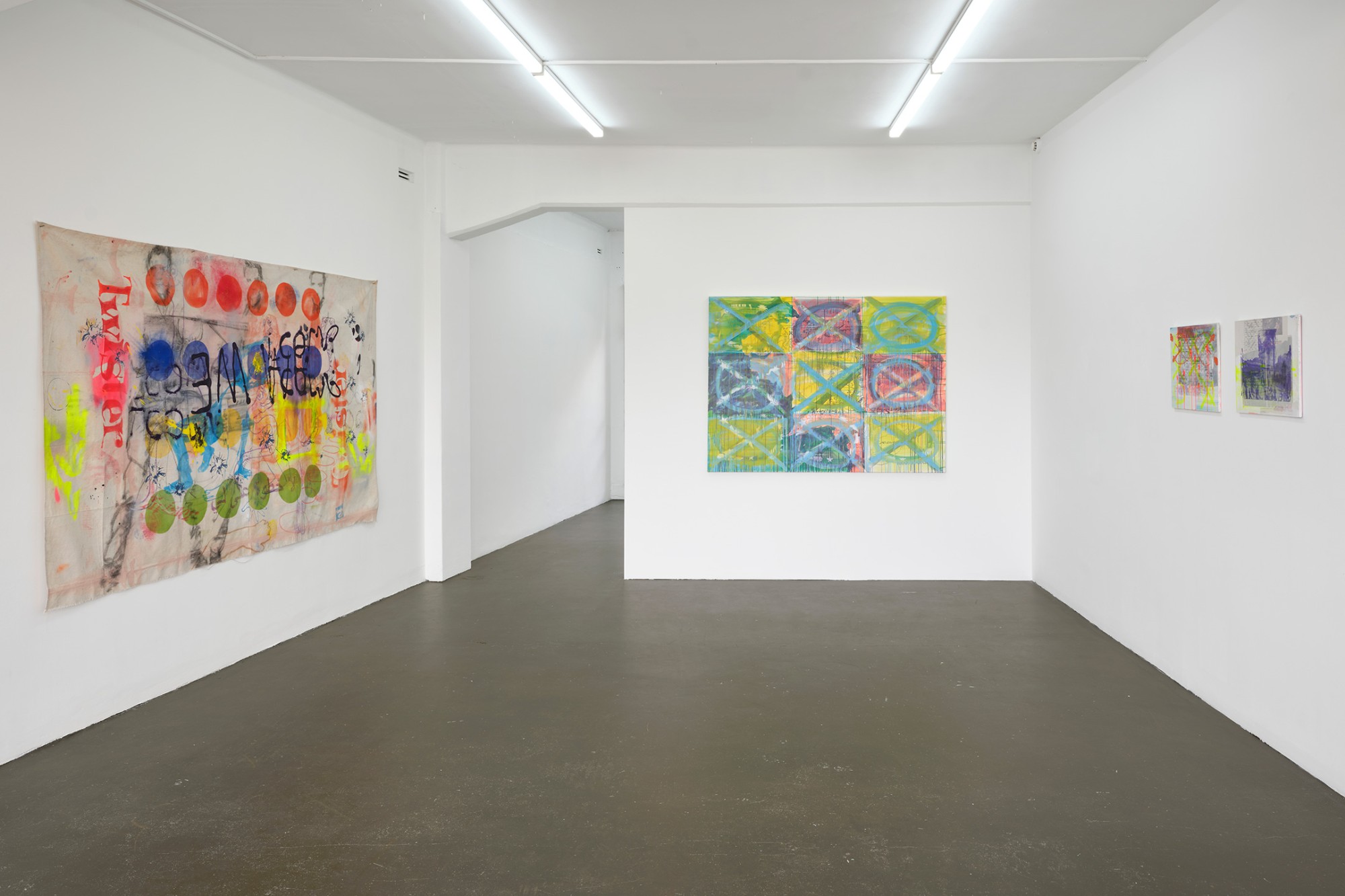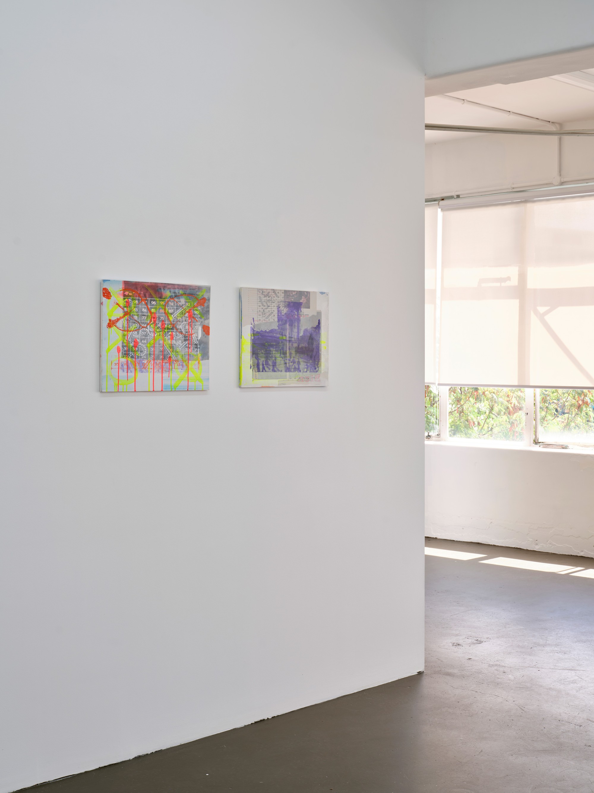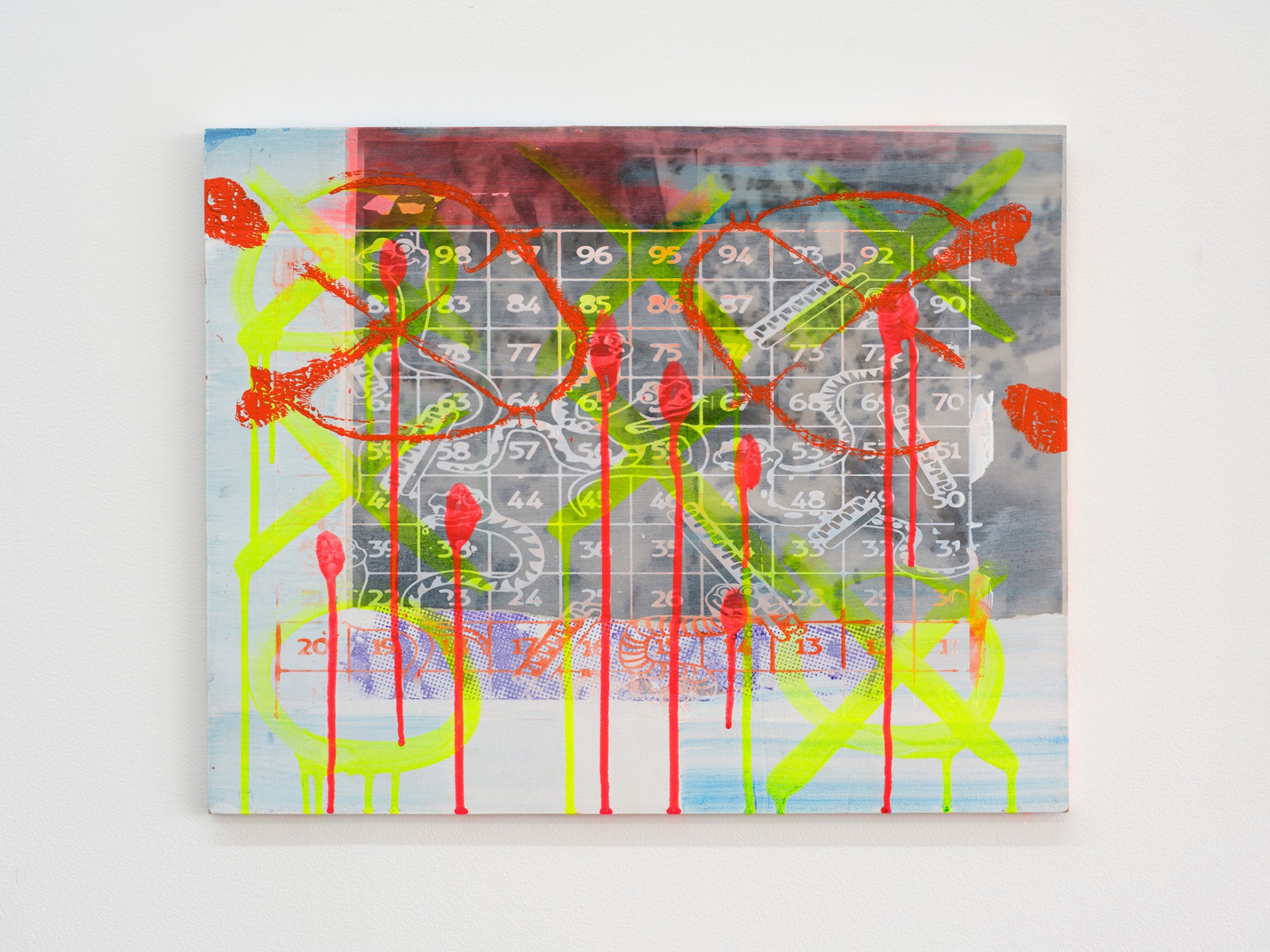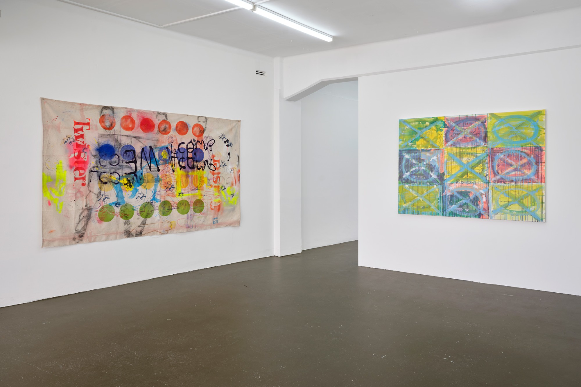 It is rare that a single image can be read in isolation in Yeldezian’s paintings; they bleed into one another, distorting and concealing information, pulling in and out of focus. Paint is applied in sheer but brightly coloured layers, together with sketchy linework and shadowy frottage, sometimes punctured by day-glo stencils. Don’t Welcome Me Mat (2024), a work painted directly onto a loose hanging drop-cloth, functions like collage with space for the eye to journey over the bright dots of a twister board, palm trees, cartoon snakes, bullet holes, and a shroud-like figure of Warhol’s cowboy. In no players online (2024) multiple grids overlap, including the stars and stripes and a supersize game of tic tac toe. The over-loaded image verges on oblivion, the result of a seemingly manic effort to reconcile the medium with it’s subject matter.