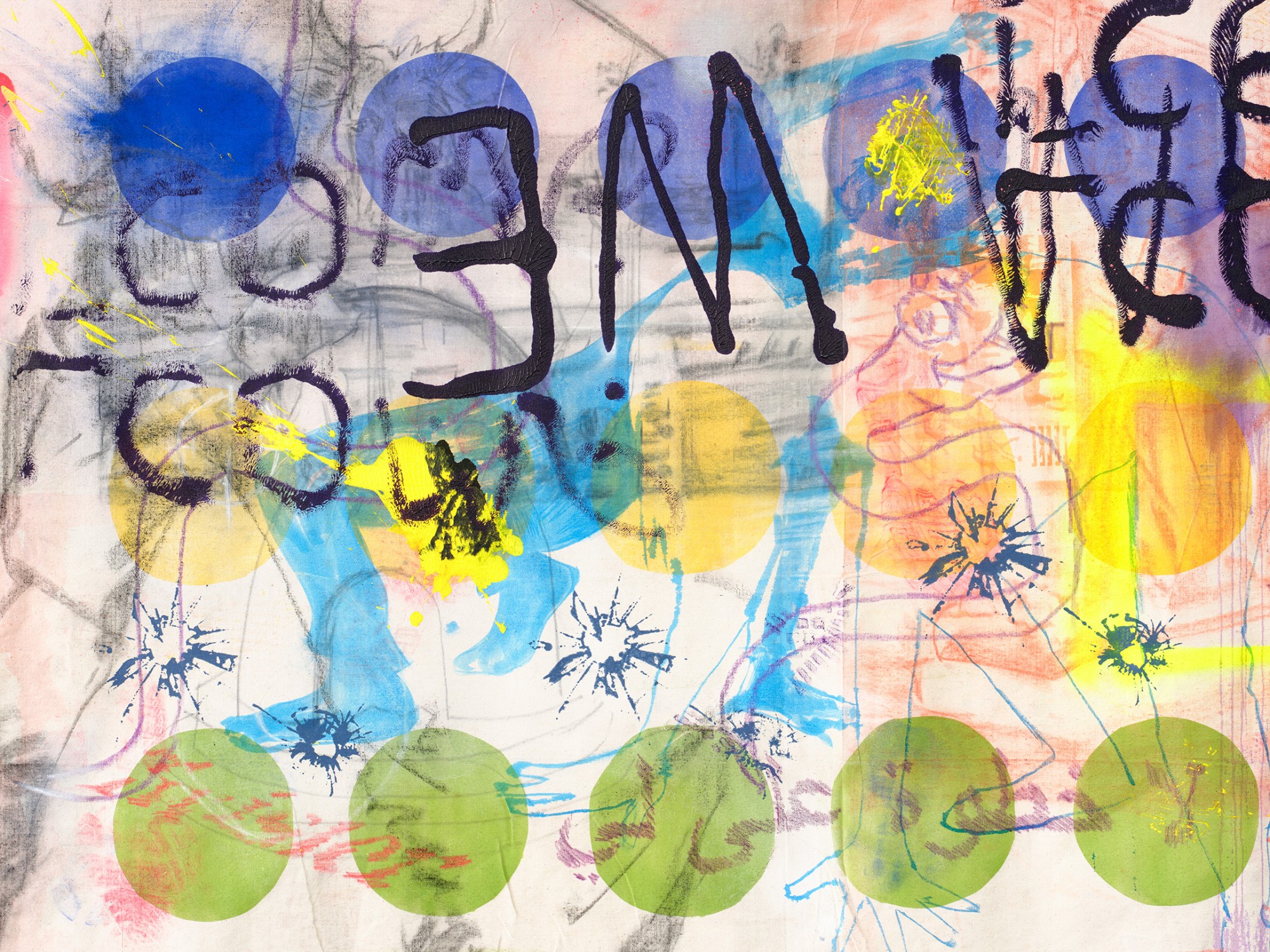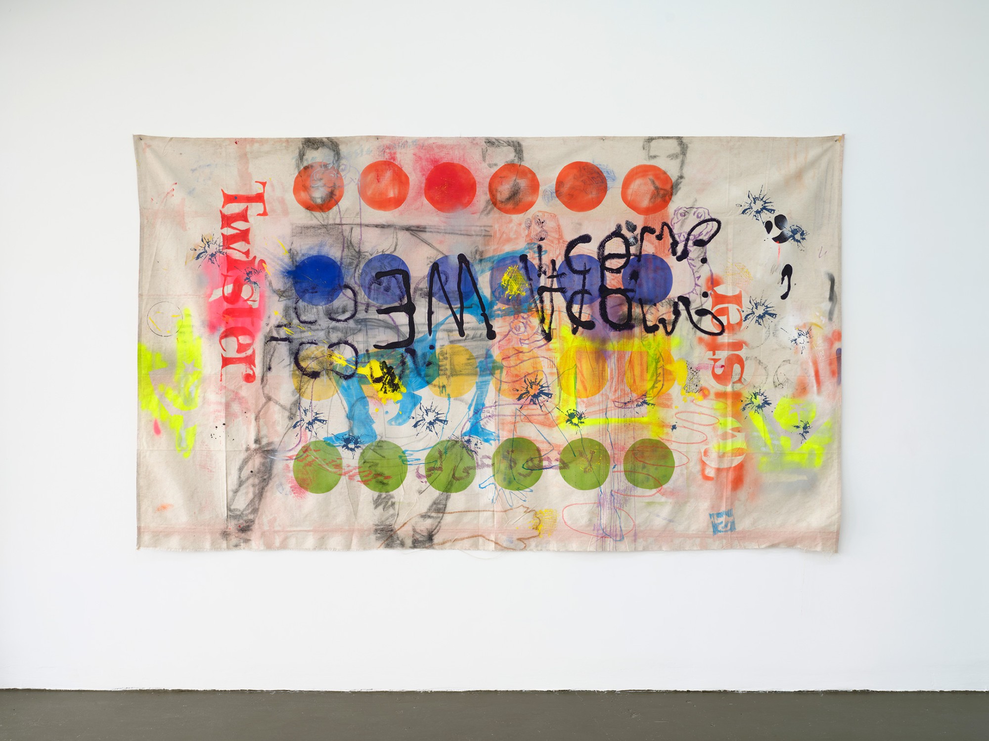 acrylic, spray enamel, charcoal, soft pastel and wax crayon on canvas sheet