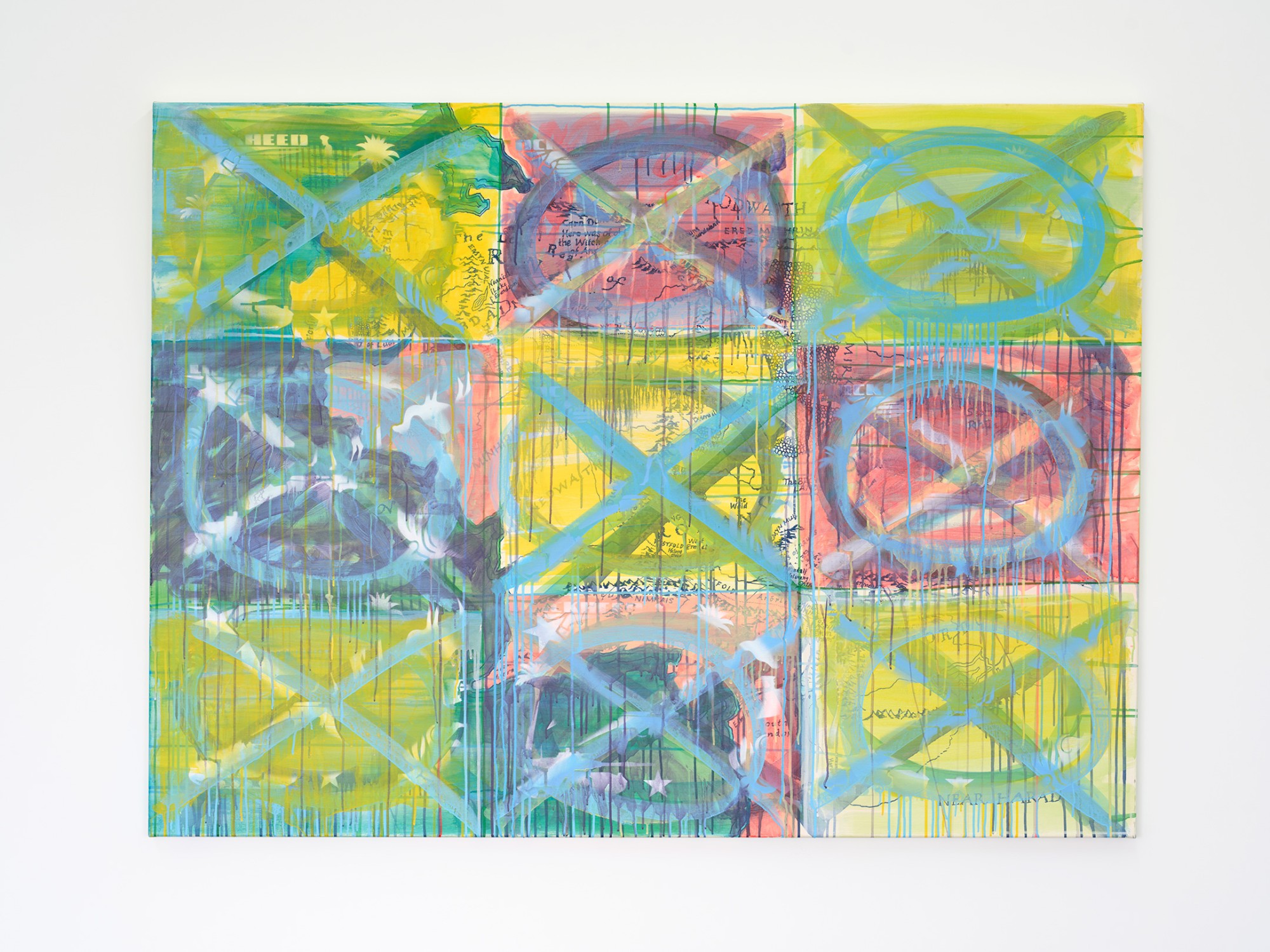 In Anto Yeldezian's paintings images from a myriad of sources are layered on top of one another and synthesized, very adeptly, into painterly tableau. The works in Arena are, as the title suggests, often organised around game boards – such as Snakes & Ladders and Noughts & Crosses – and representations of contested territories, both fictional and otherwise. In one large painting a map of Middle Earth is discernible under multiple grids of information, while in another, the source material is arranged in the squares of a chess board.