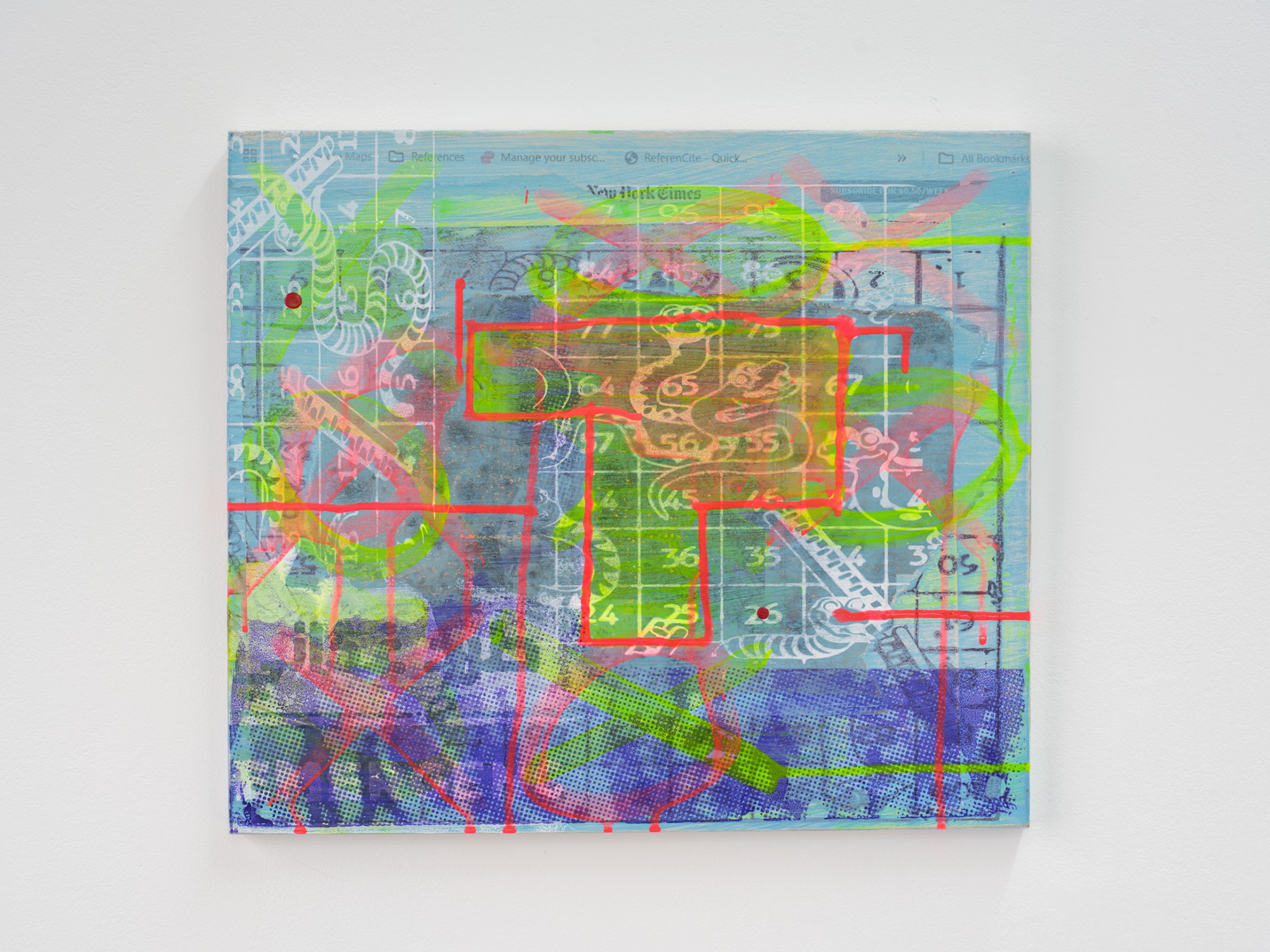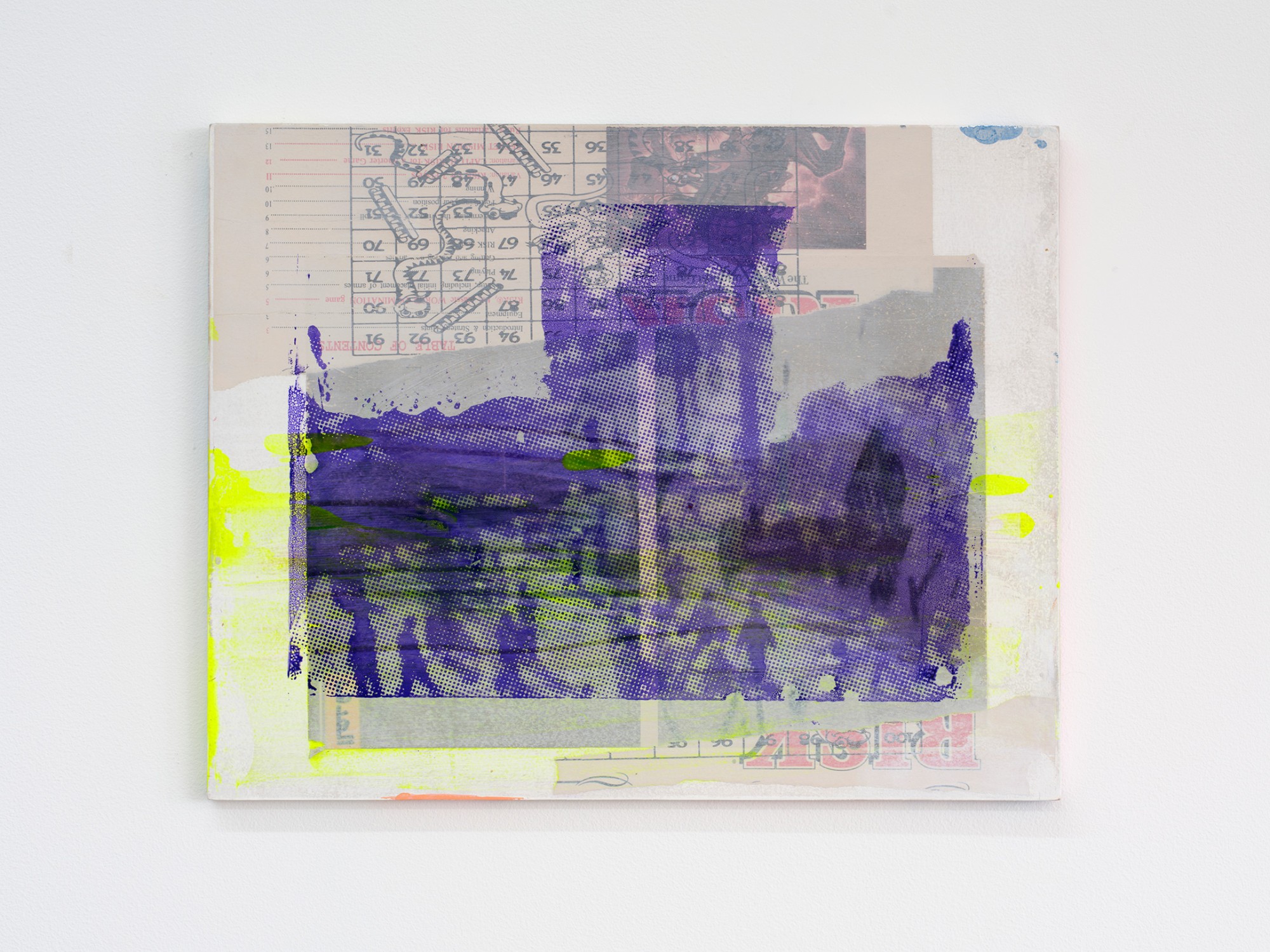 silk screen emulsion, acrylic, inkjet newsprint on wood panel