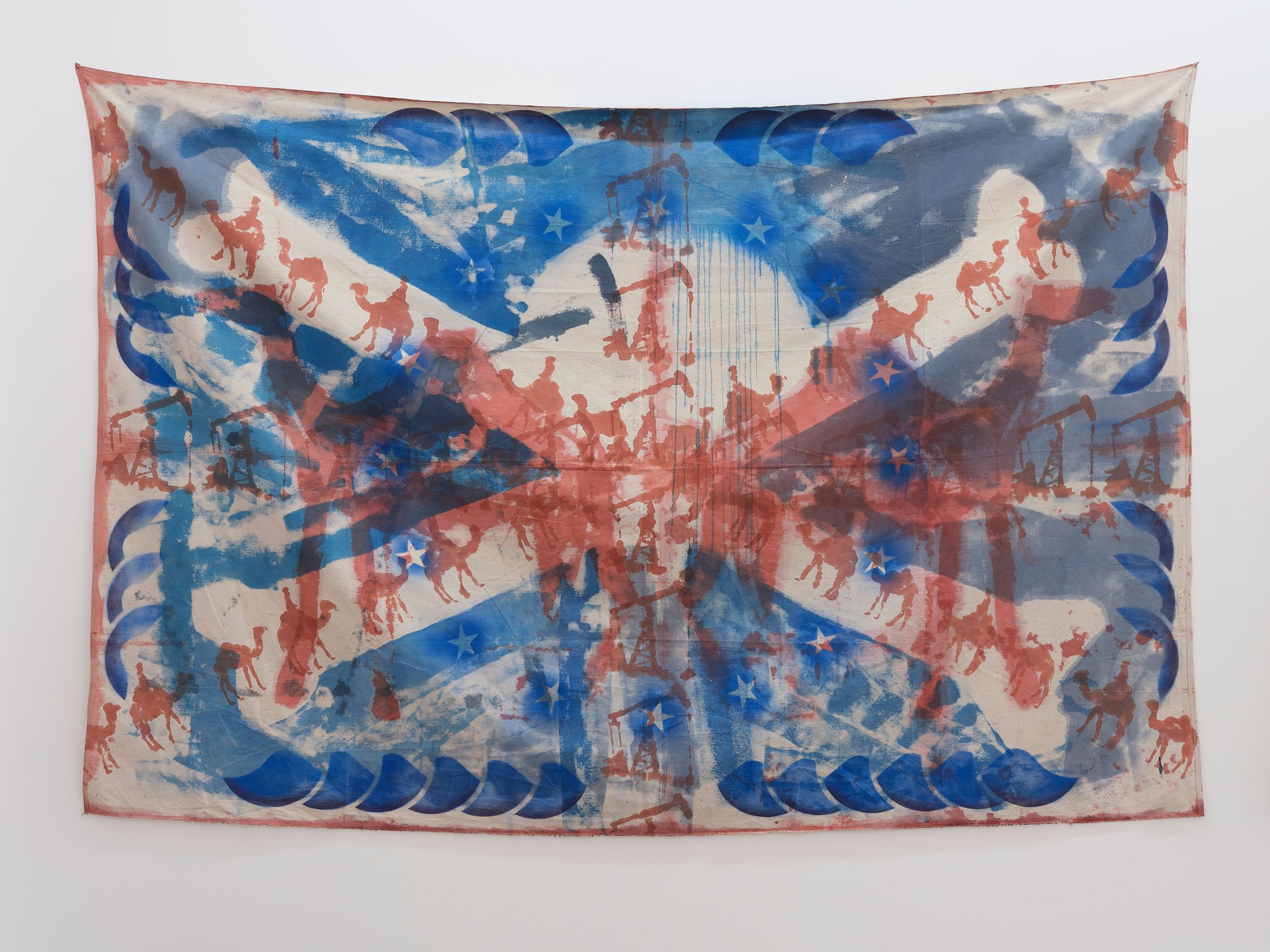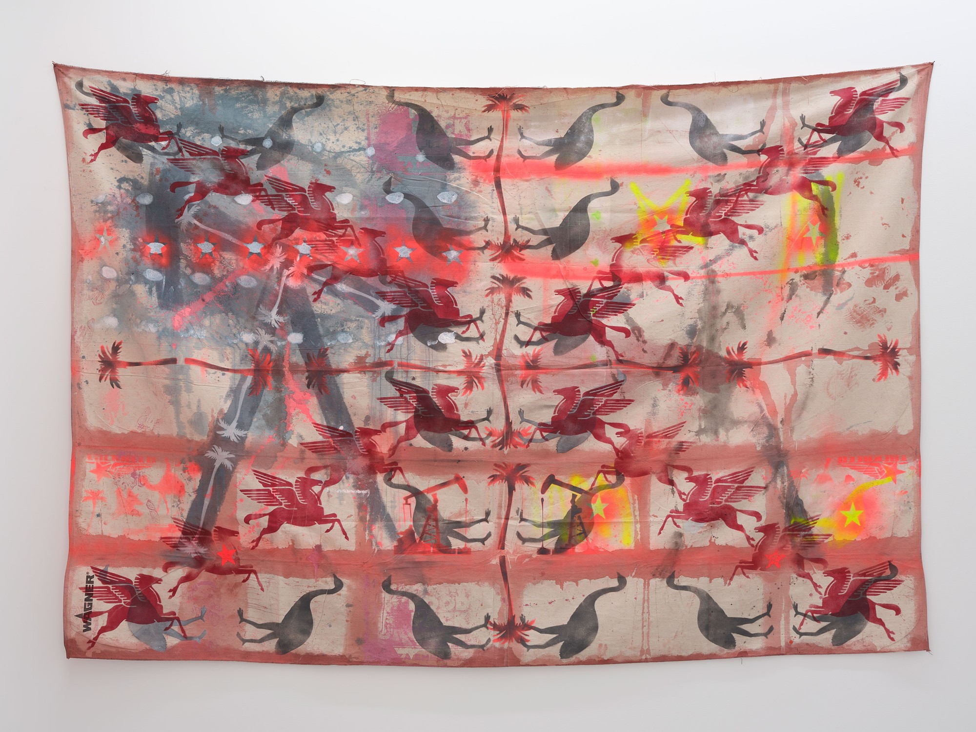 acrylic spray, house paint, acrylic and oil on canvas drop-sheet