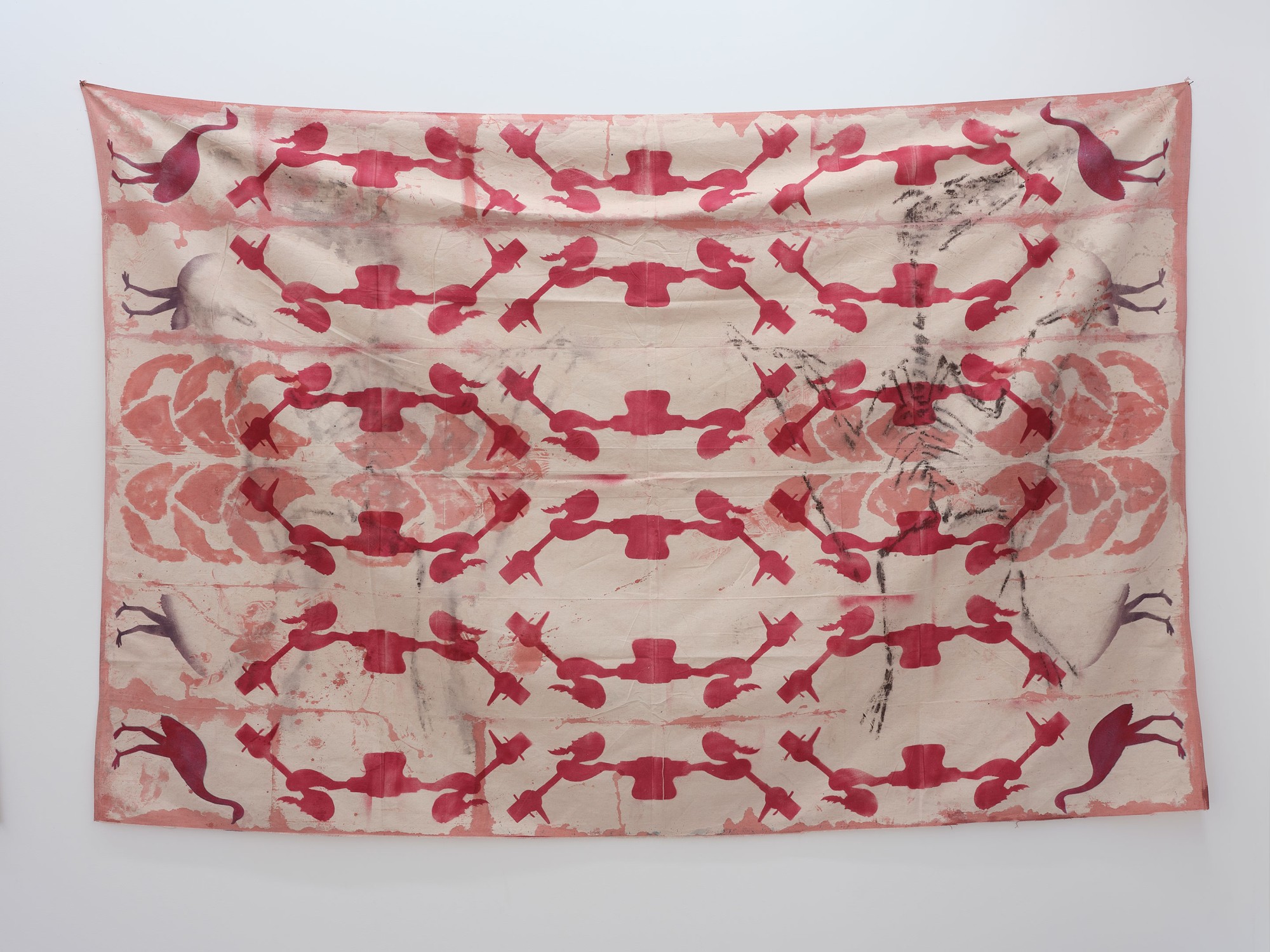 line marking paint, acrylic spray, oil and acrylic on canvas drop-sheet