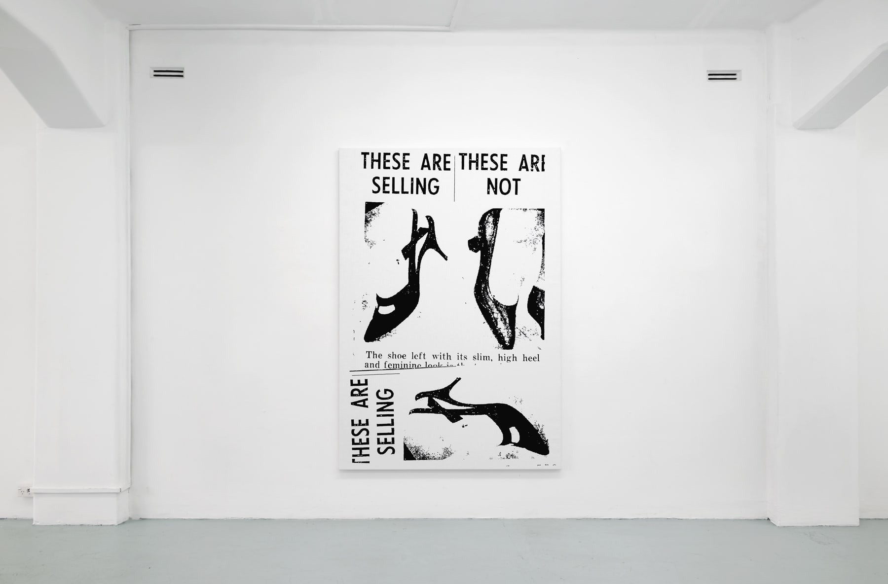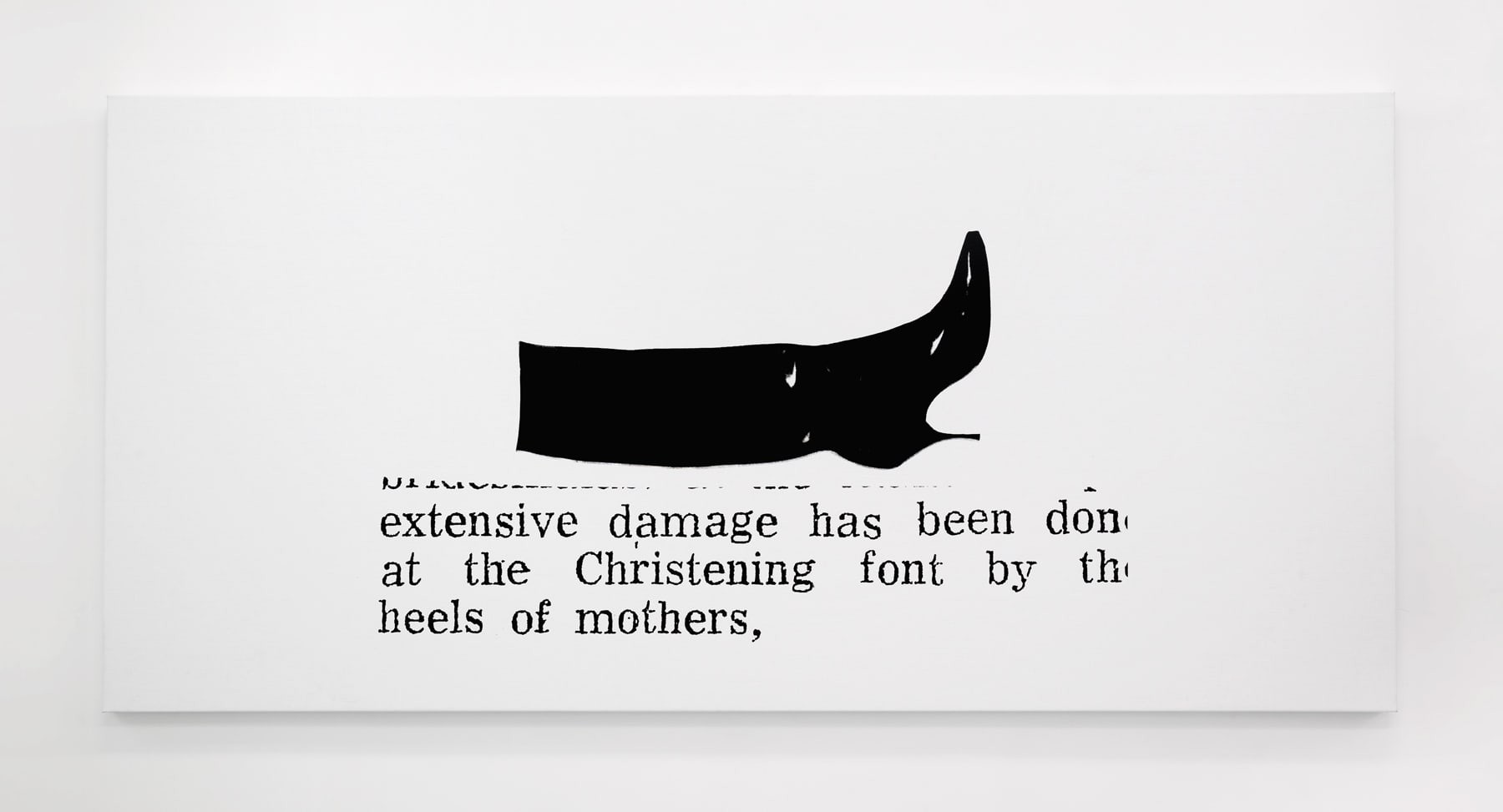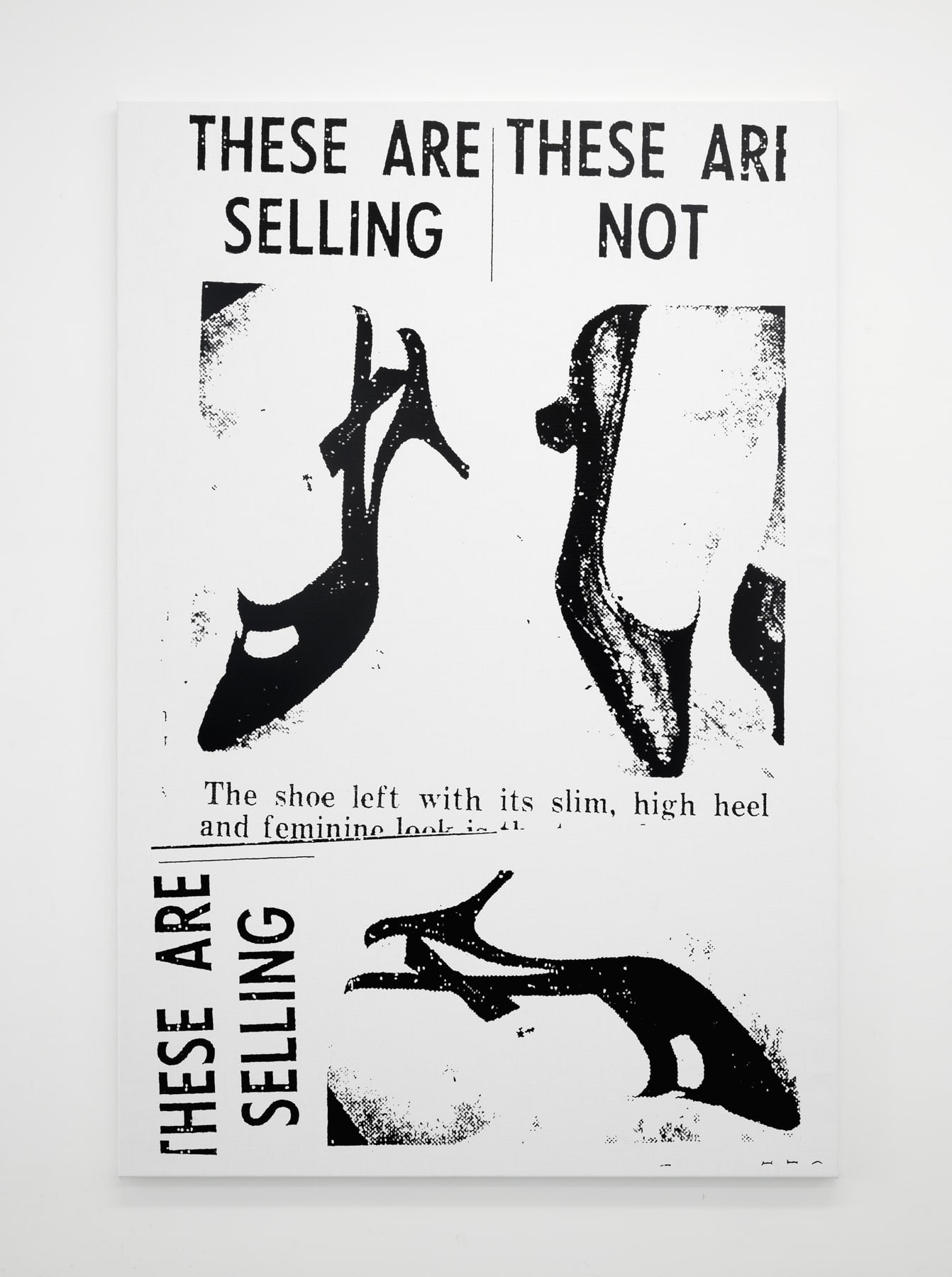 Heels of Mothers continues Seymour’s long-standing enquiry into the nature of images in repetition. The exhibition is organised, almost exclusively, around a single subject; high heel shoes. Three large-scale screen-printed canvasses feature various designs – the knee-high boot, the strappy stiletto – as well as snippets of text that reveal their sources as newspaper or magazines. A single small-scale collage, Electric Ladyland (2023), comprises an image of a fluffy white cat and a photograph, taken by the artist in New York in the 1990s, of infamous model and transgender performer Amanda Lepore.