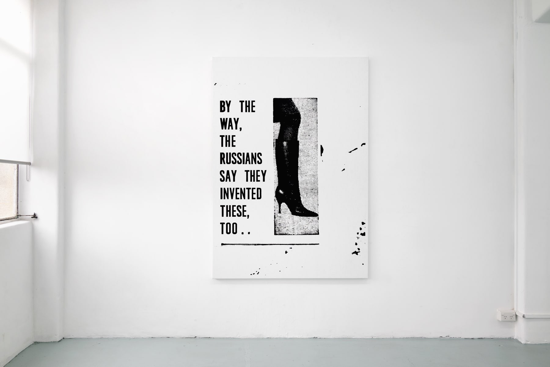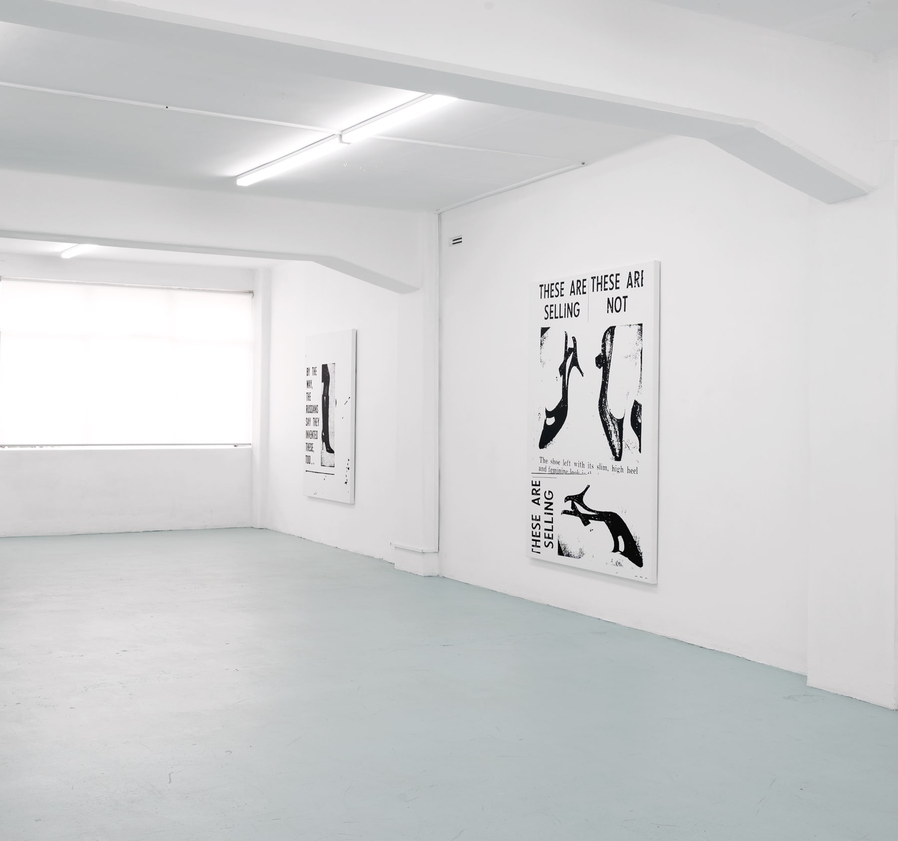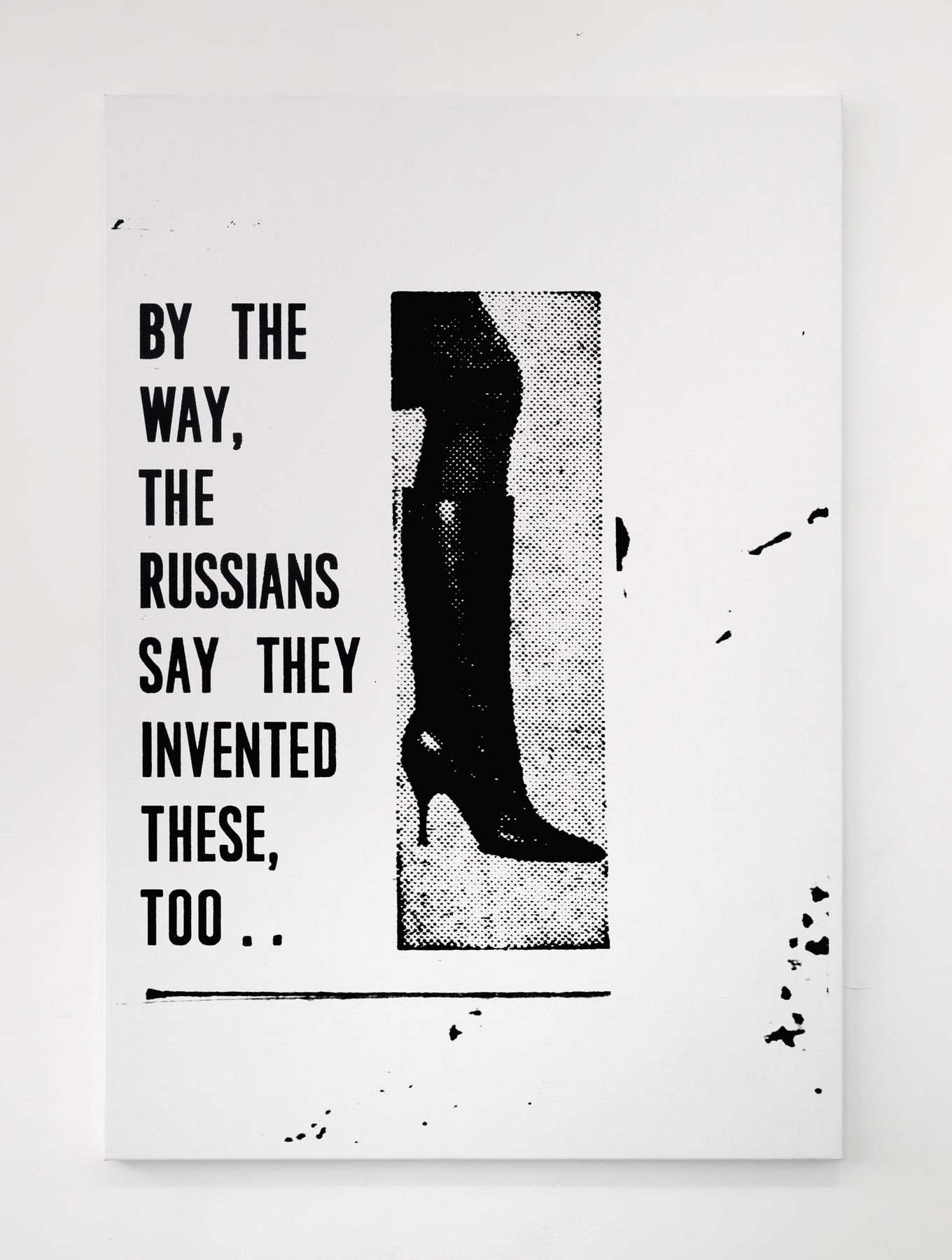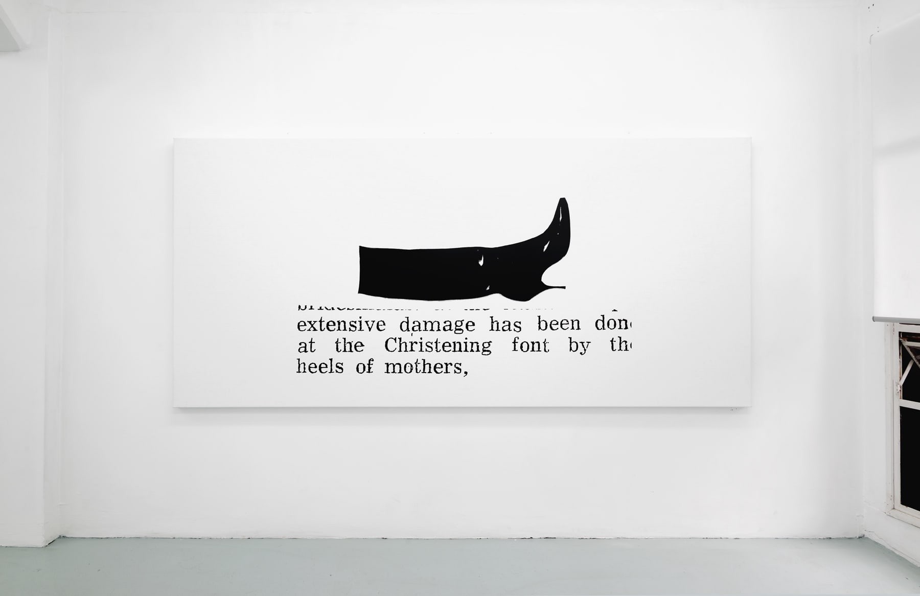 Heels of Mothers continues Seymour’s long-standing enquiry into the nature of images in repetition. The exhibition is organised, almost exclusively, around a single subject; high heel shoes. Three large-scale screen-printed canvasses feature various designs – the knee-high boot, the strappy stiletto – as well as snippets of text that reveal their sources as newspaper or magazines. A single small-scale collage, Electric Ladyland (2023), comprises an image of a fluffy white cat and a photograph, taken by the artist in New York in the 1990s, of infamous model and transgender performer Amanda Lepore.