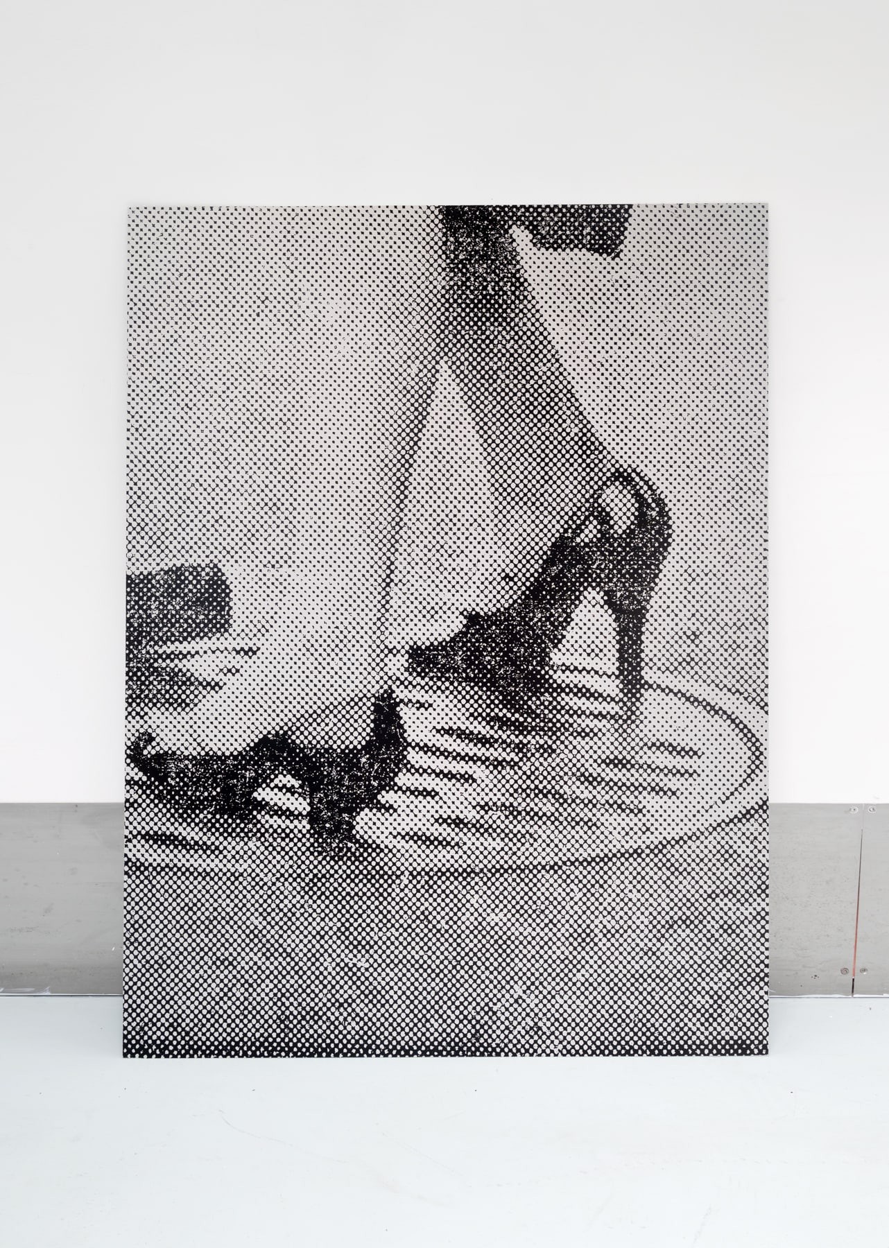 The works themselves are physically imposing, almost muscular in their appeal. Images are lifted, cropped, and exploded into stark, monochrome compositions complete with incidental marks of the collage and screen-printing process.