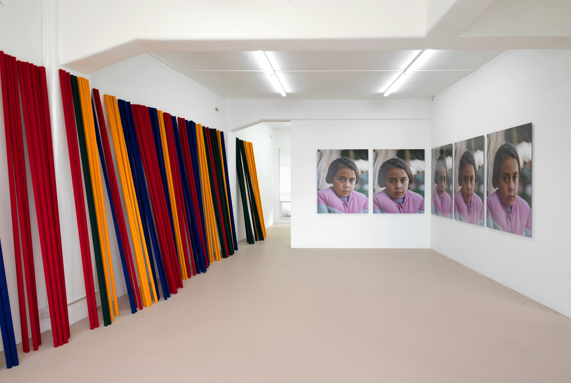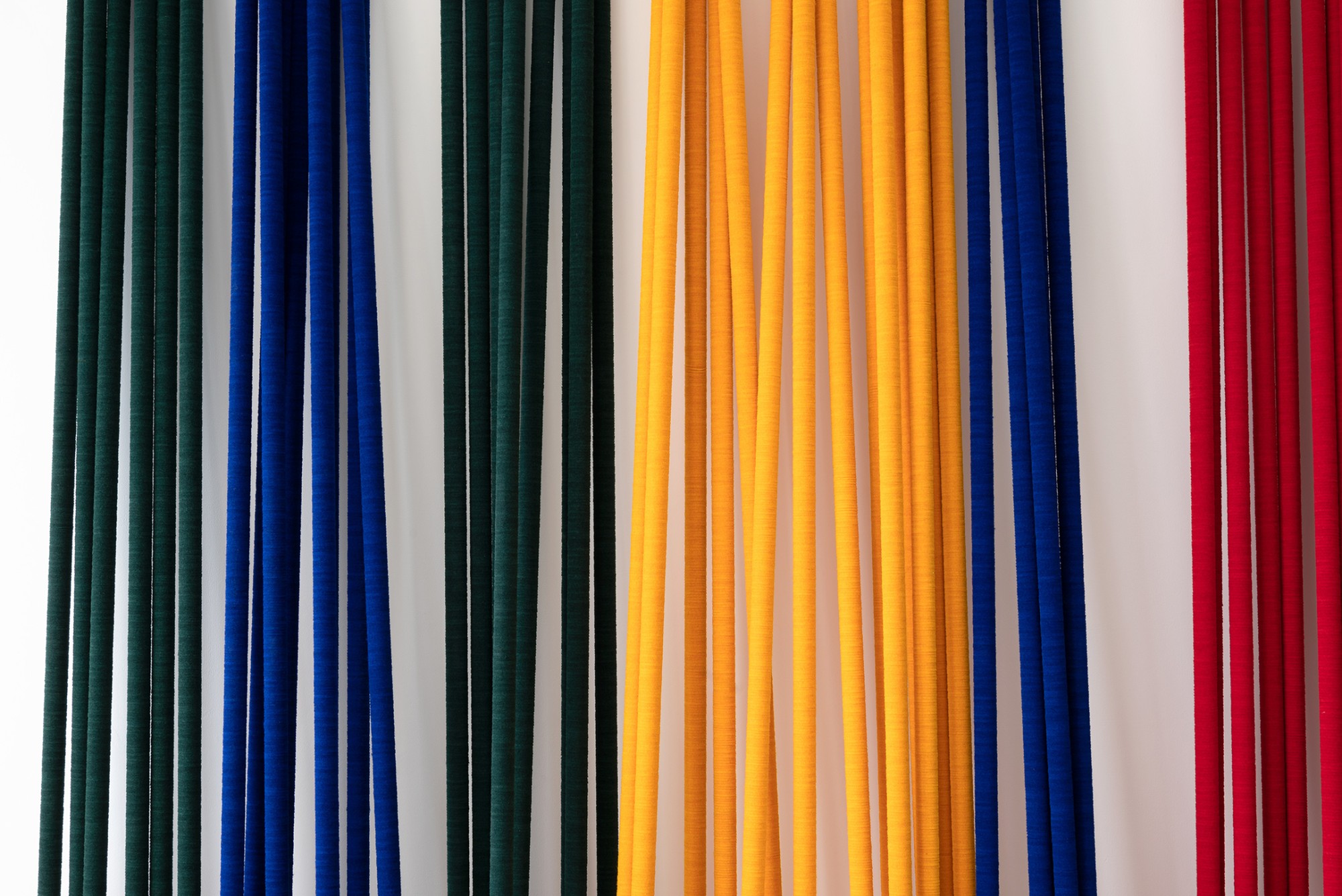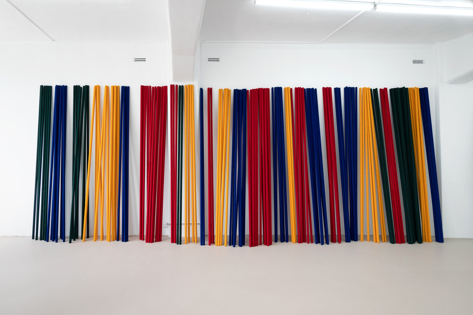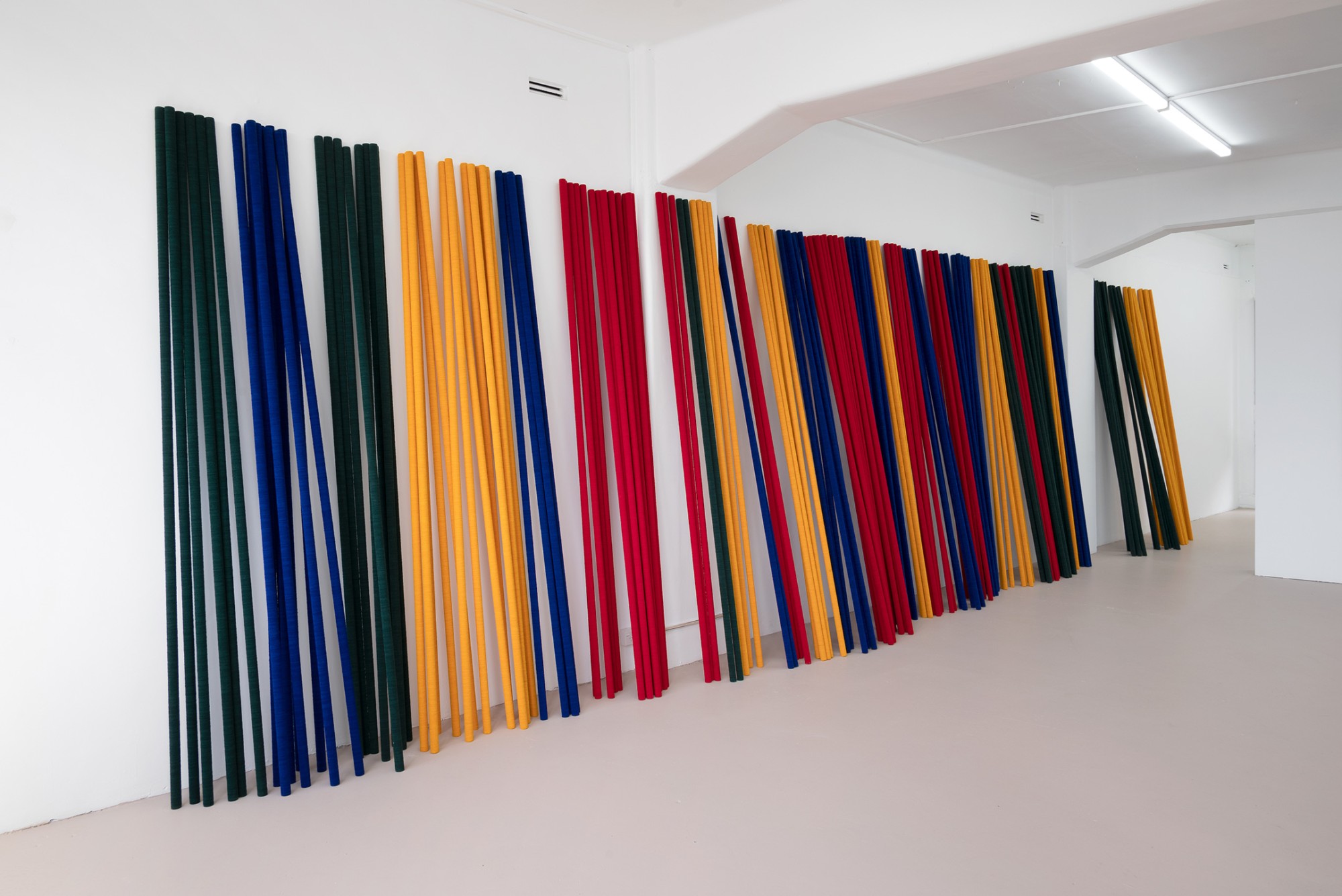 Peter Robinson’s If you were to work here is an installation of felt poles, commissioned for the 5th Auckland Triennial in 2013 and installed at The Auckland War Memorial Museum and Auckland Art Gallery Toi o Tāmaki. Casually stacked along the wall of the gallery, the poles feel totemic or ceremonial while their formation is war-like; an armory of weapons, a palisade, or fortification. The colours relate to the four humours – phlegm, haima (blood), melanchole (black bile), and chole (bile) – that were believed to influence temperament and health.