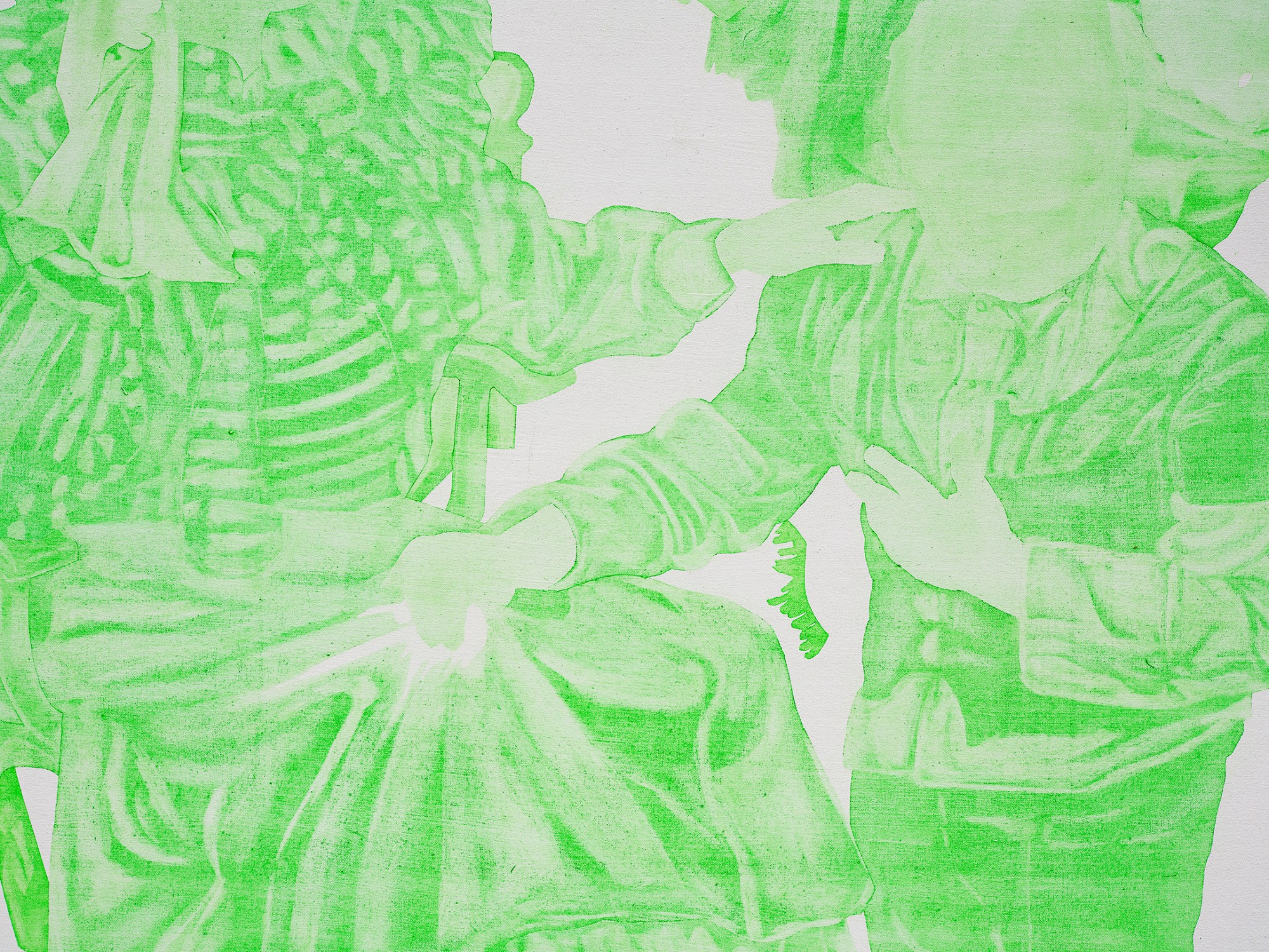 Friedman has been painting paintings of other paintings since 2022; paintings that painters look at, either in adoration or with aversion. Photographs taken by the artist are cropped and projected onto the canvas, then painted exclusively in a single colour: Kama fluorescent green. Friedman avoids expressive or subjective decisions about the application of paint, where possible, in an attempt to “deny the hand”. Friedman's pictures increasingly operate in relation to her writing practice and the built identity of a painter.