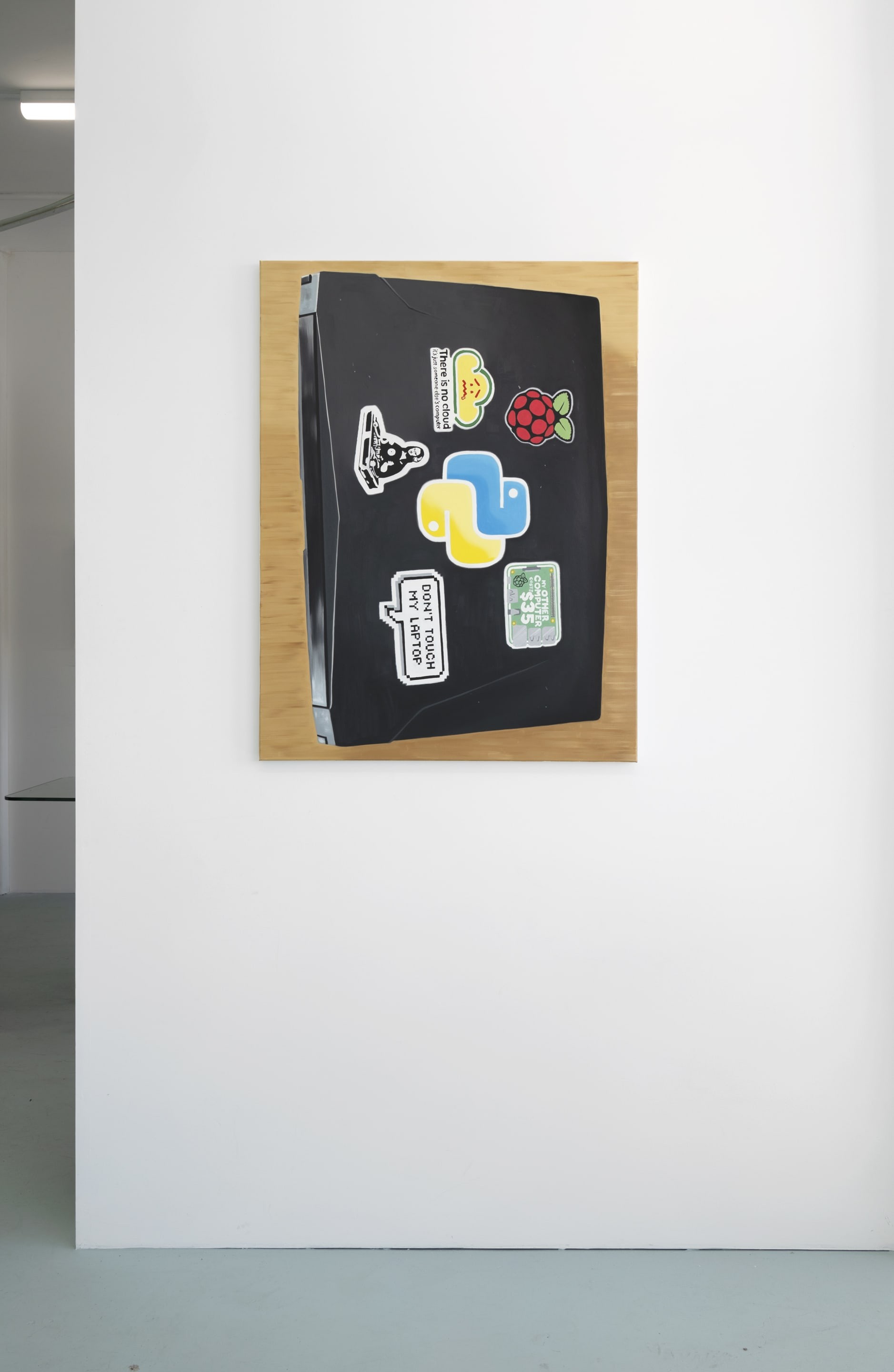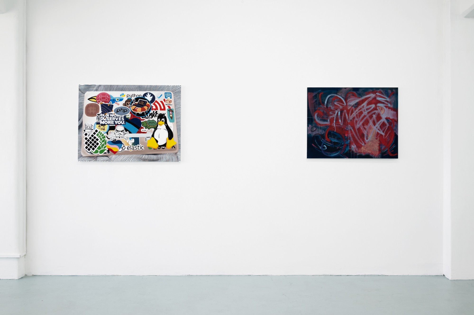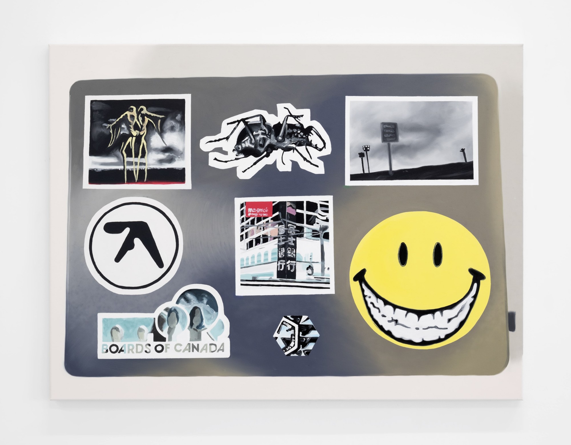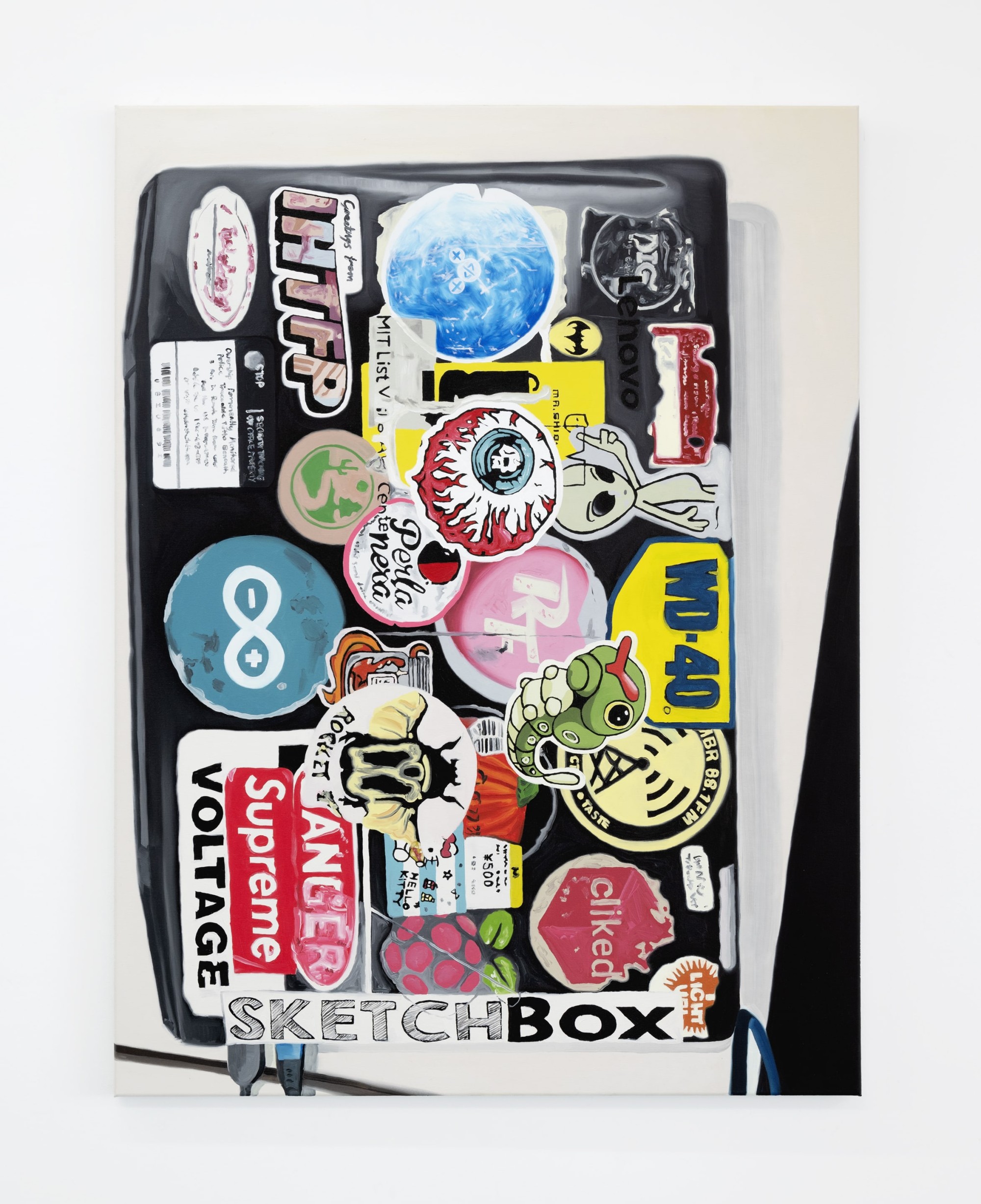 As always, Wagstaff’s subject matter is carefully chosen for both it’s legibility as a cultural sign, and for it usefulness in the artist’s ongoing critique of value and taste. Like the fashion images and tattoos from Wagstaff’s previous paintings, the laptops and their stickers are tools of identity formation and display. While the personal brand of each user is specific to their device, the jumble of symbols – characters from the Simpsons, Pokémon, a Mona Lisa dj-ing, aliens, self-help slogans, coder in-jokes – give an overall impression of young people who are vaguely counter-cultural and very online.