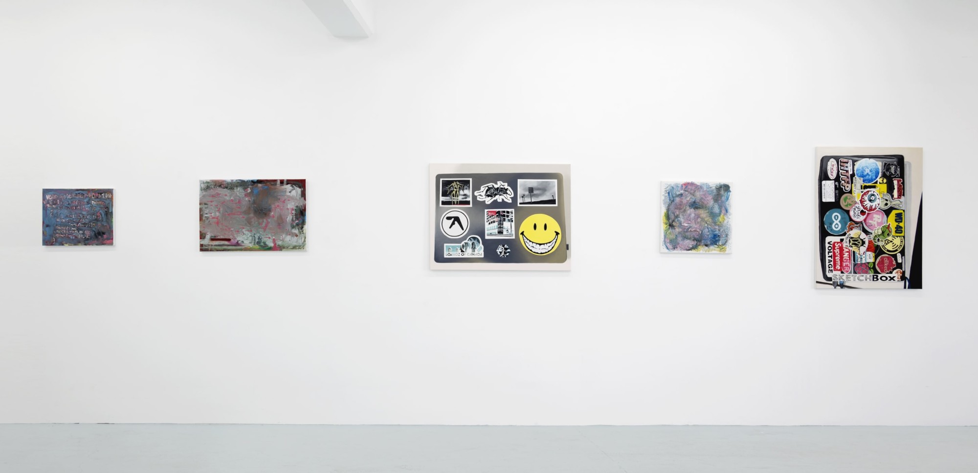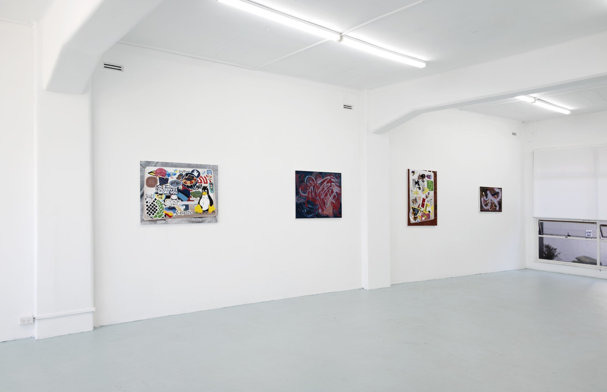 Input coverage melds two channels of Wagstaff’s elastic painting practice. Five works titled Single layer paintings or composed markers of repurposed cultural fragments (2023) are neo-realist depictions of the top of a closed laptop, covered in stickers. Amongst the laptops are abstract paintings most of which are based, imaginatively, on the readymade compositions and palettes of their realist neighbours.