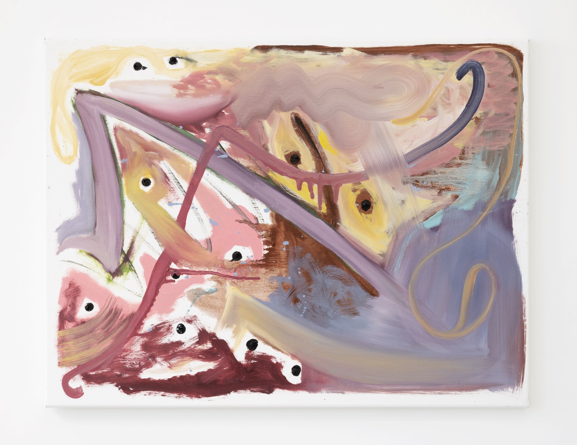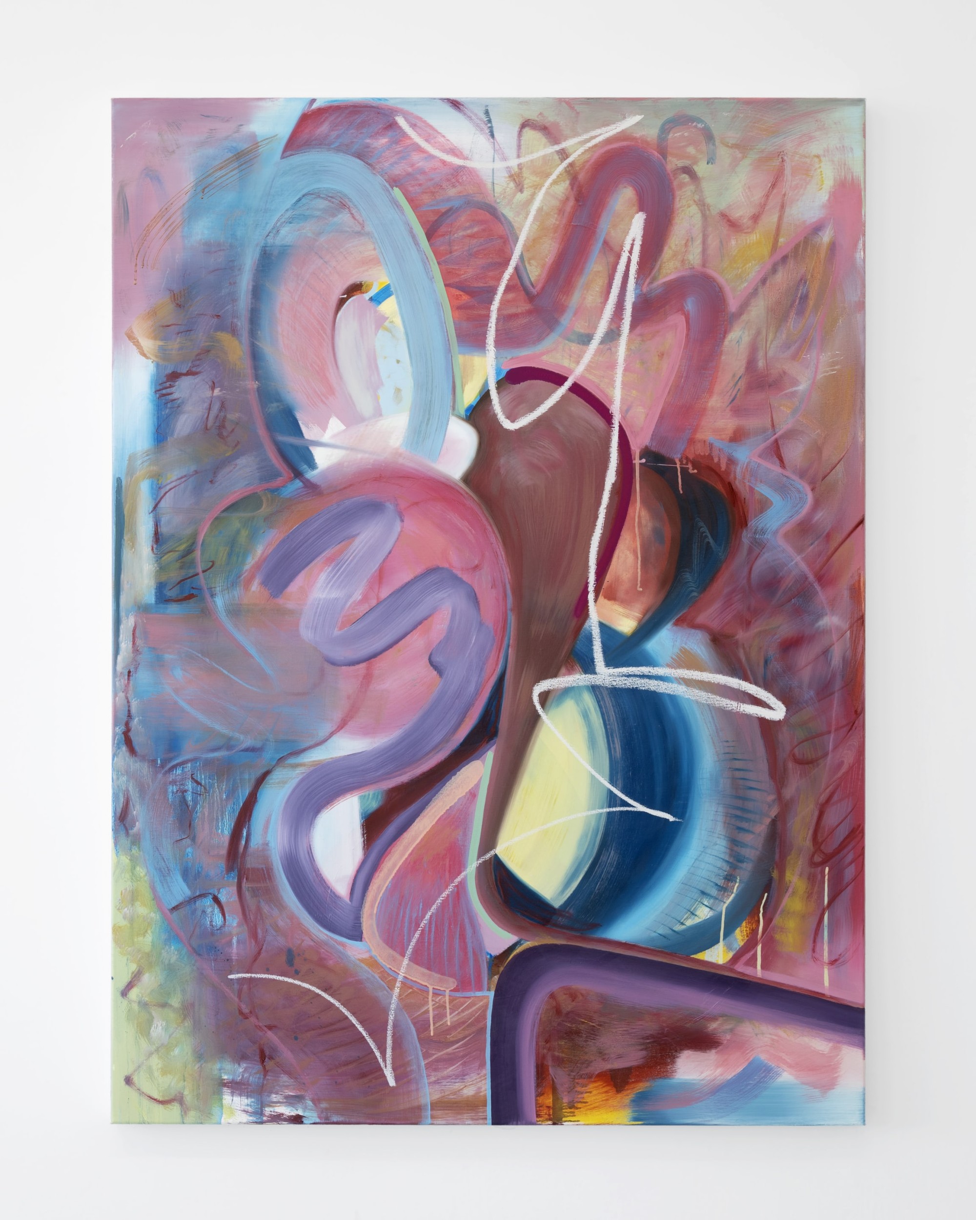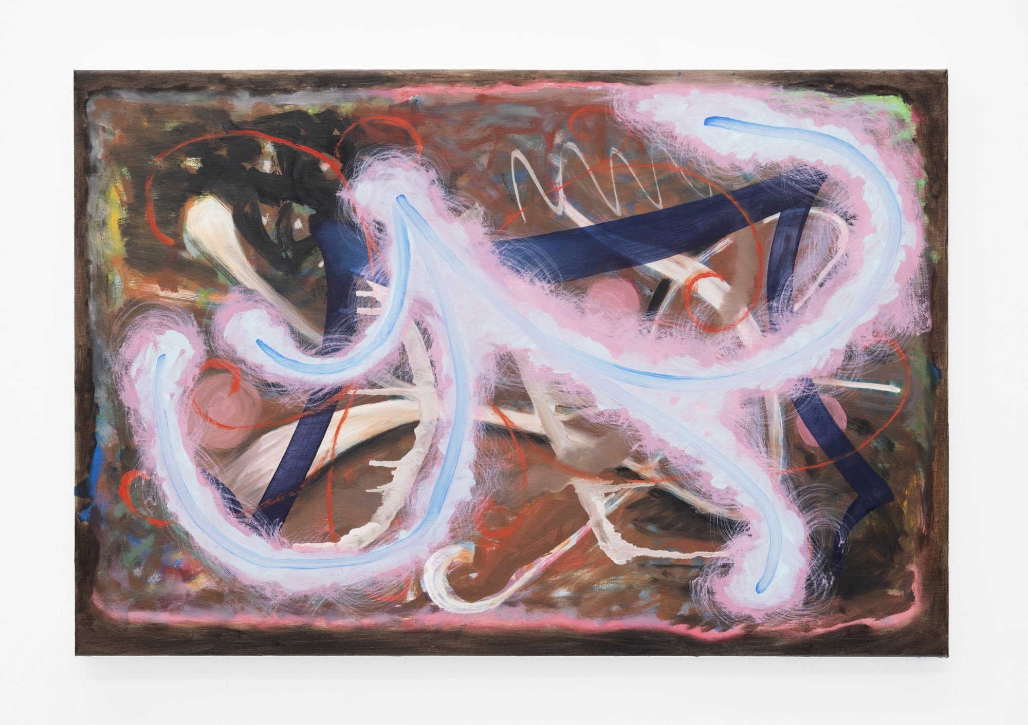 Compared to the precision of the laptops, the abstract paintings seem unprecious, even emancipated. Combining a number of painterly tricks and references from painting’s past – Krebbe-like squiggles, Oehlen curves, even a nod to Coastal Signs’ ‘house style’ – the abstracts are the laptop paintings tied in knots, scraped back, smudged, softened, until they slip into a different symbolic register.