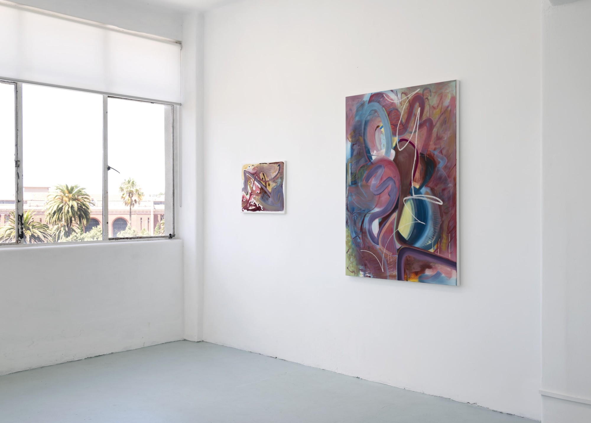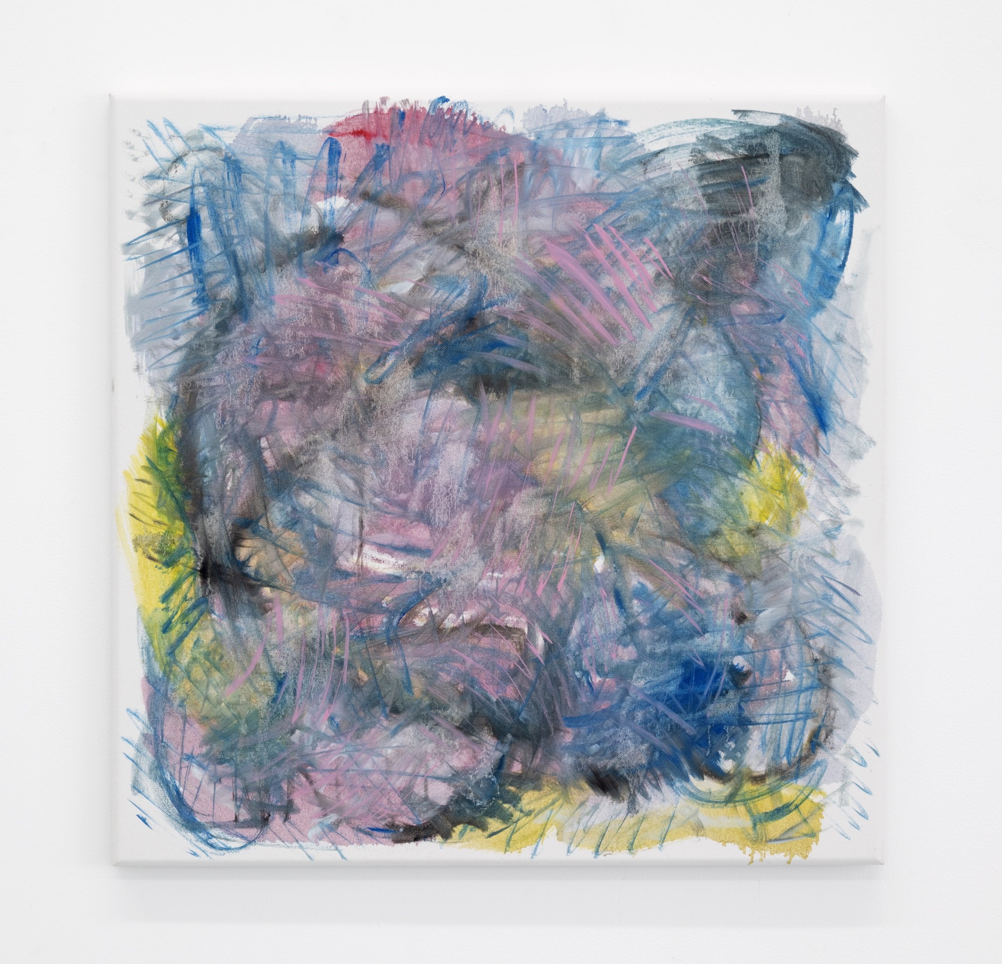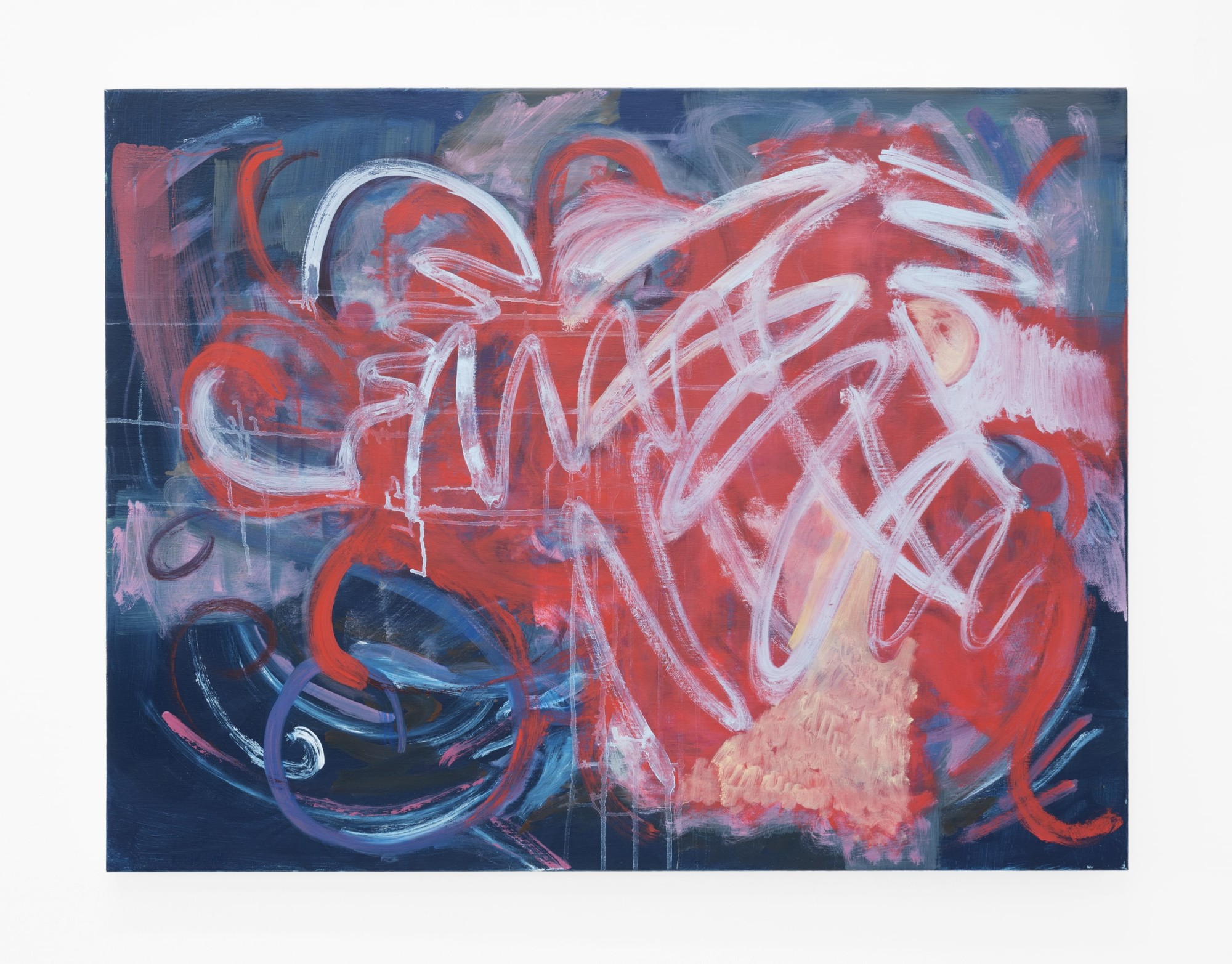 Compared to the precision of the laptops, the abstract paintings seem unprecious, even emancipated. Combining a number of painterly tricks and references from painting’s past – Krebbe-like squiggles, Oehlen curves, even a nod to Coastal Signs’ ‘house style’ – the abstracts are the laptop paintings tied in knots, scraped back, smudged, softened, until they slip into a different symbolic register.