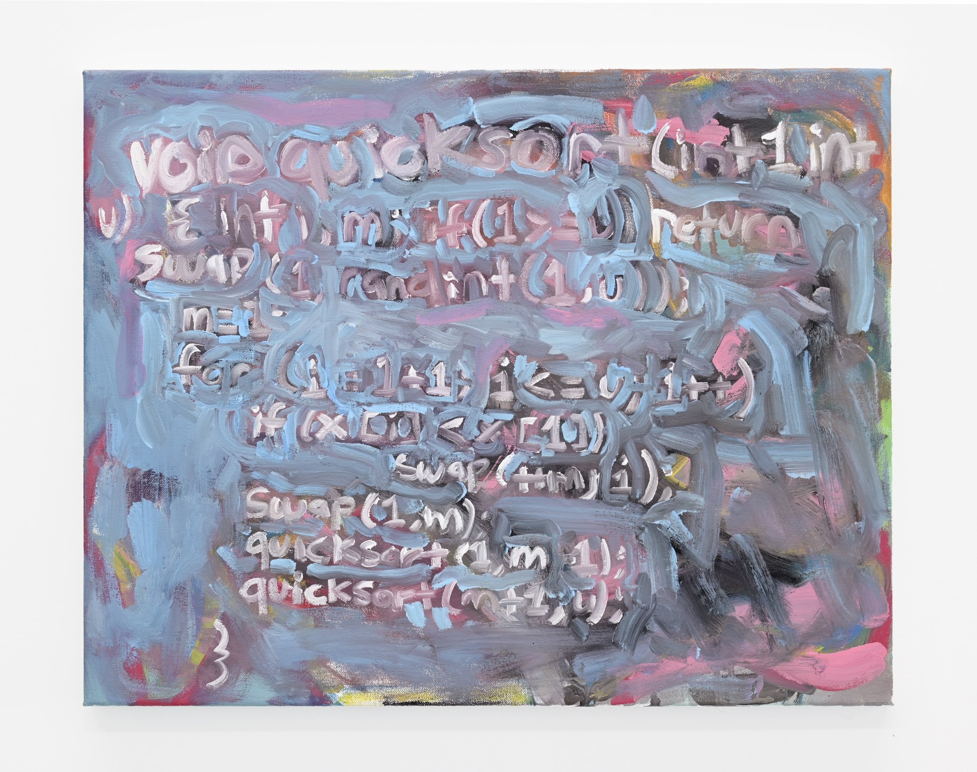 One work, Quicksort algorithm in C language (2024) features painted language forms; a code used to sort large data sets in digital technology. However, like most of the paintings on that wall, it feels distorted, or a bit fried; paint marks are more ordered around the text, and disordered towards the edges. In another work, Everything means nothing to me (2024) the compositional reference is discarded in favour of tonality or musicality; placed next to the ‘music’ laptop, this painting channels the attitude of its neighbour in white noise.