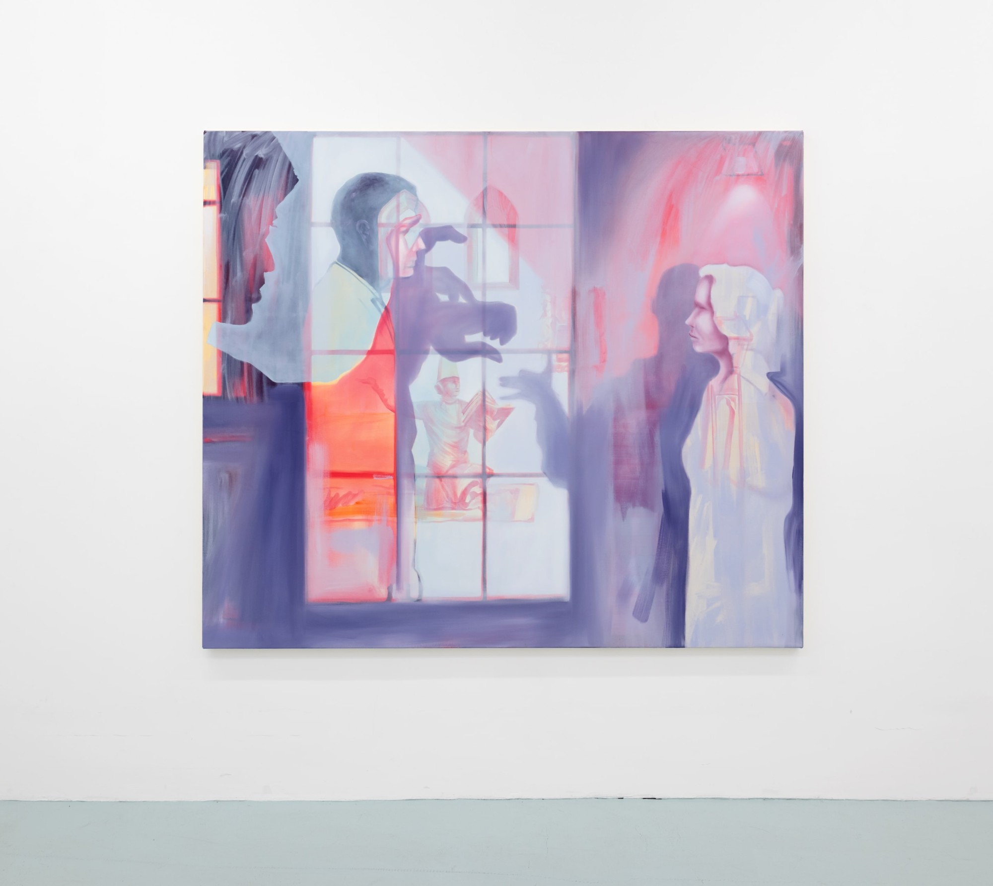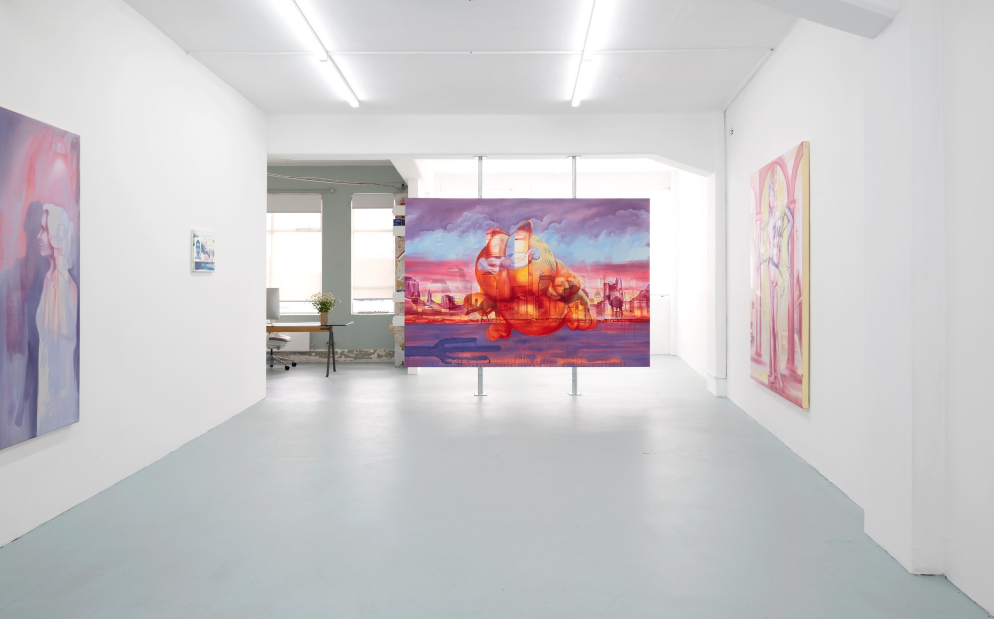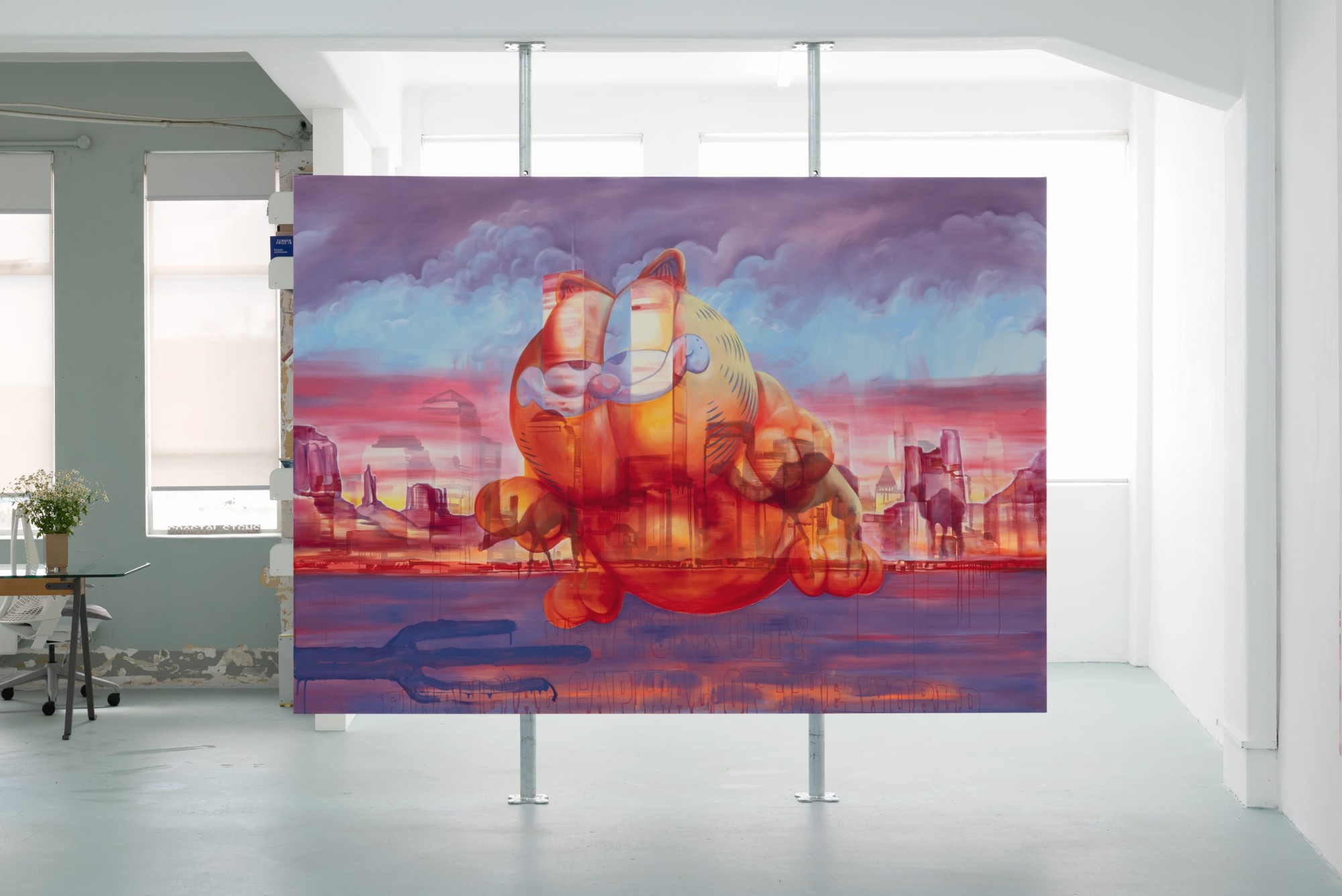 American popular culture features prominently in the paintings; the outline of a Disney castle glows like a portal in Royal Academy (2023) and in Parade Day (2023) an enormous Garfield balloon floats over the New York skyline. The title of the exhibition, Monument Valley, refers to another degraded icon; the vast geological structures of the Navajo Tribal Park in Arizona that have acted as backdrop to many Western films, including a cartoon after-life in Looney Tunes.