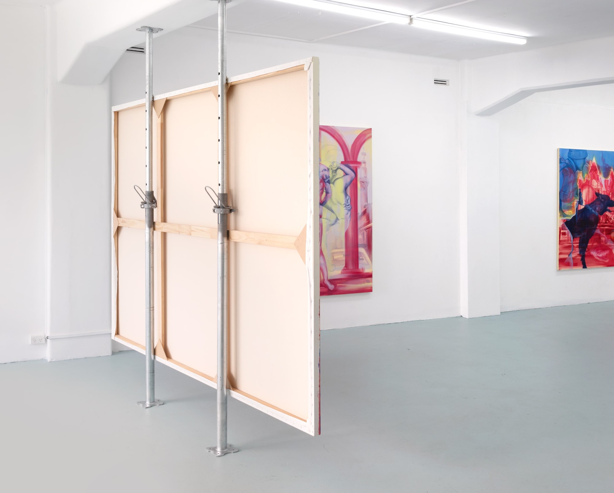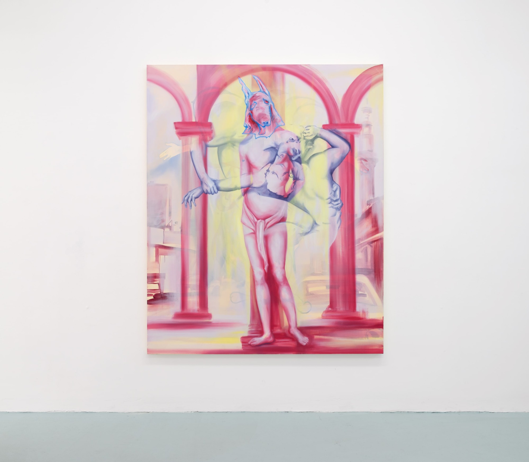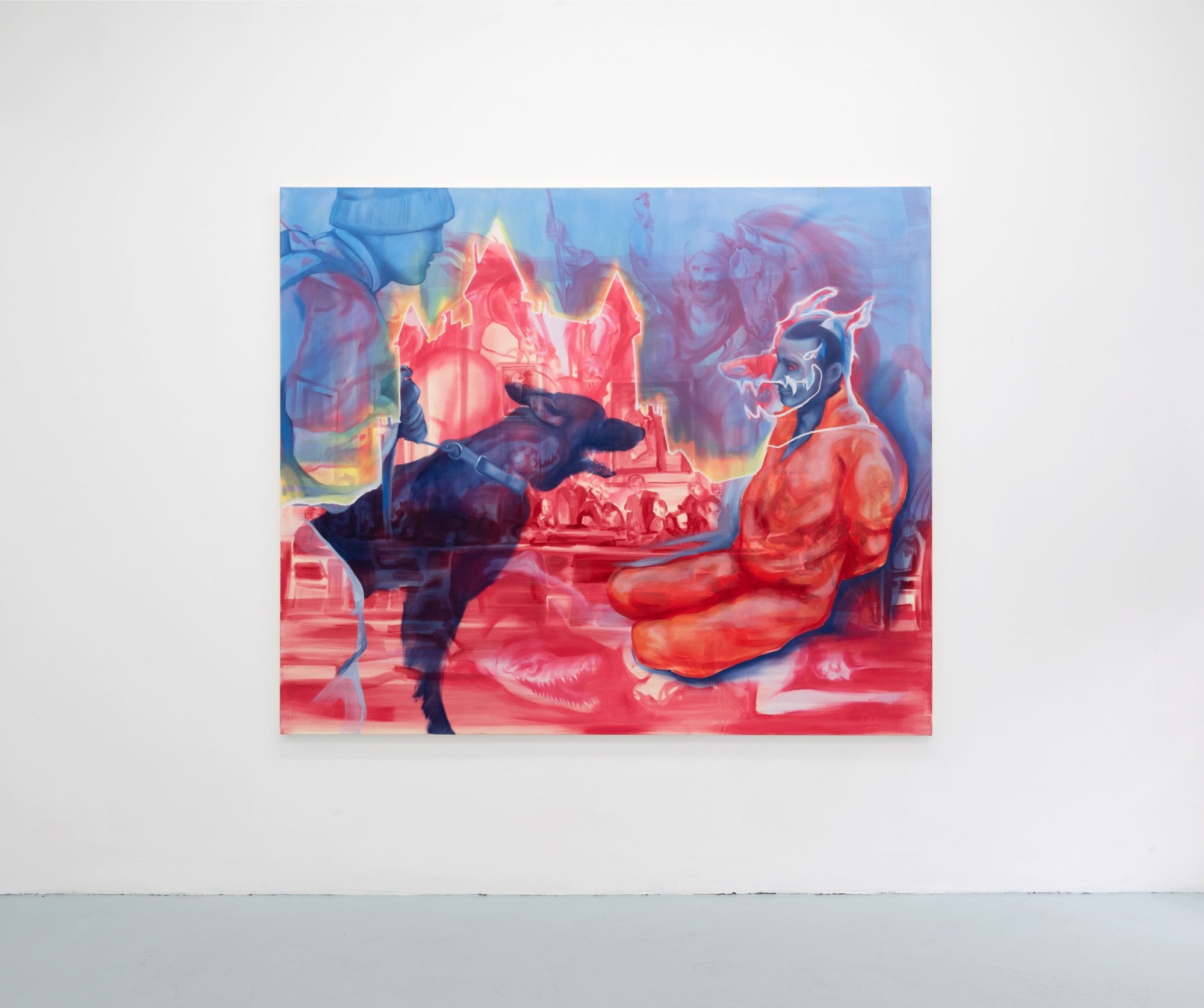 Art History, too, haunts these paintings; a ghostly version of Rubens' Hippopotamus and Crocodile Hunt (1615) curls violently under Royal Academy and in Sebastian's Inferno (2023), an oddly smooth-bodied Sebastian stands bound to a column, the martyr ready for a volley of arrows.
