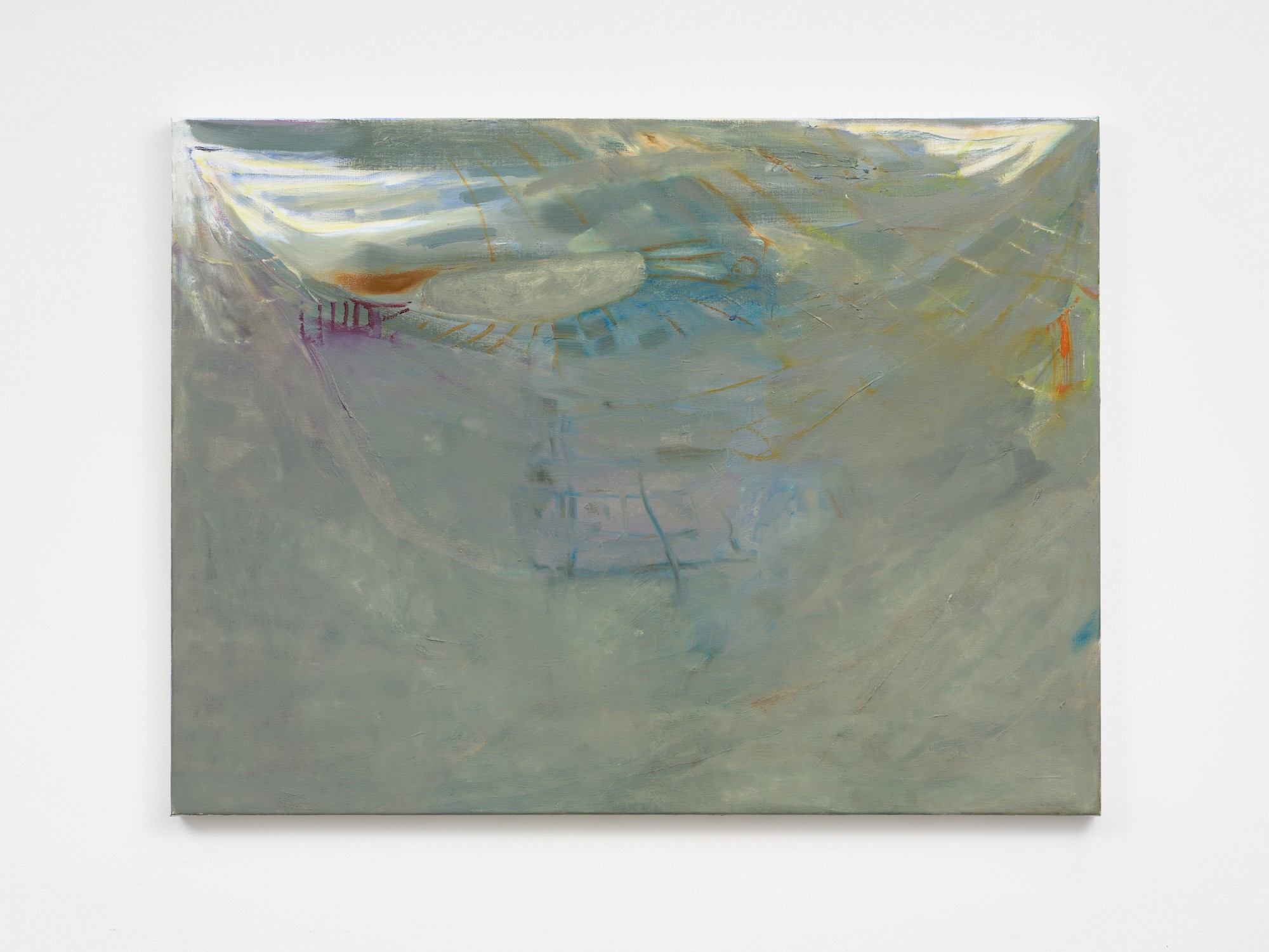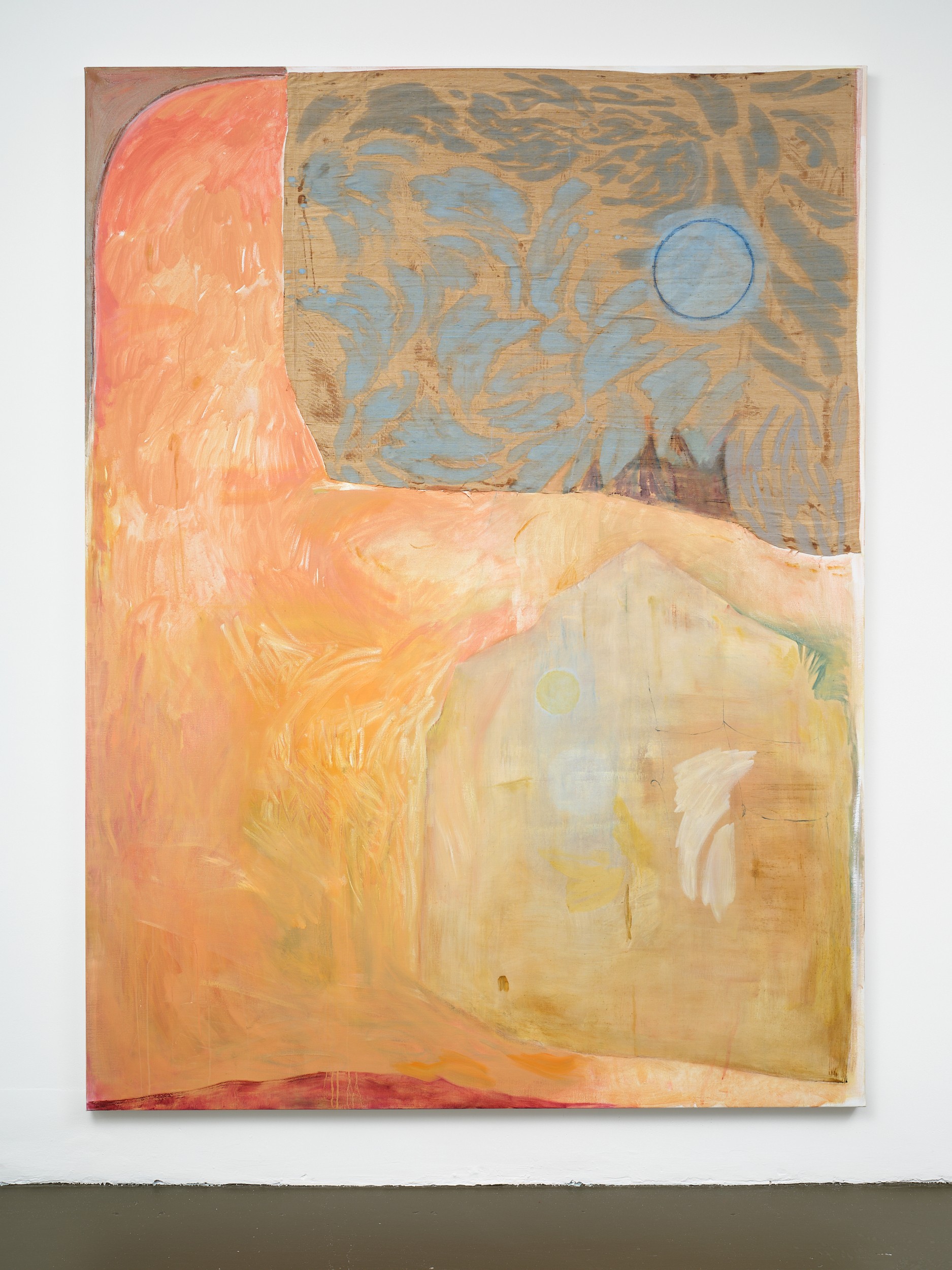 In Shivers, as in many of Jannides’ recent exhibitions, time appears to be playing tricks. Both within the confines of a single painting – in the contrary speeds of mark-making – and in a broader sense, as the artist conjures motifs and settings of her early work. Shivers features phantoms of paintings-past – veiled subjects and rooms, arches, and perhaps the most iconic marker of time, the shining sun/moon – which taken together disclose an eerie process of return.