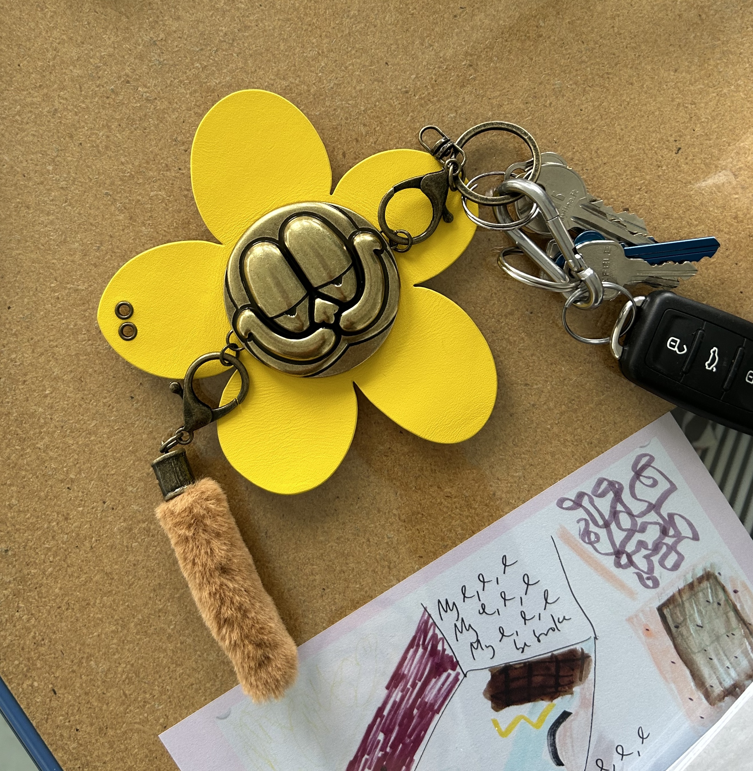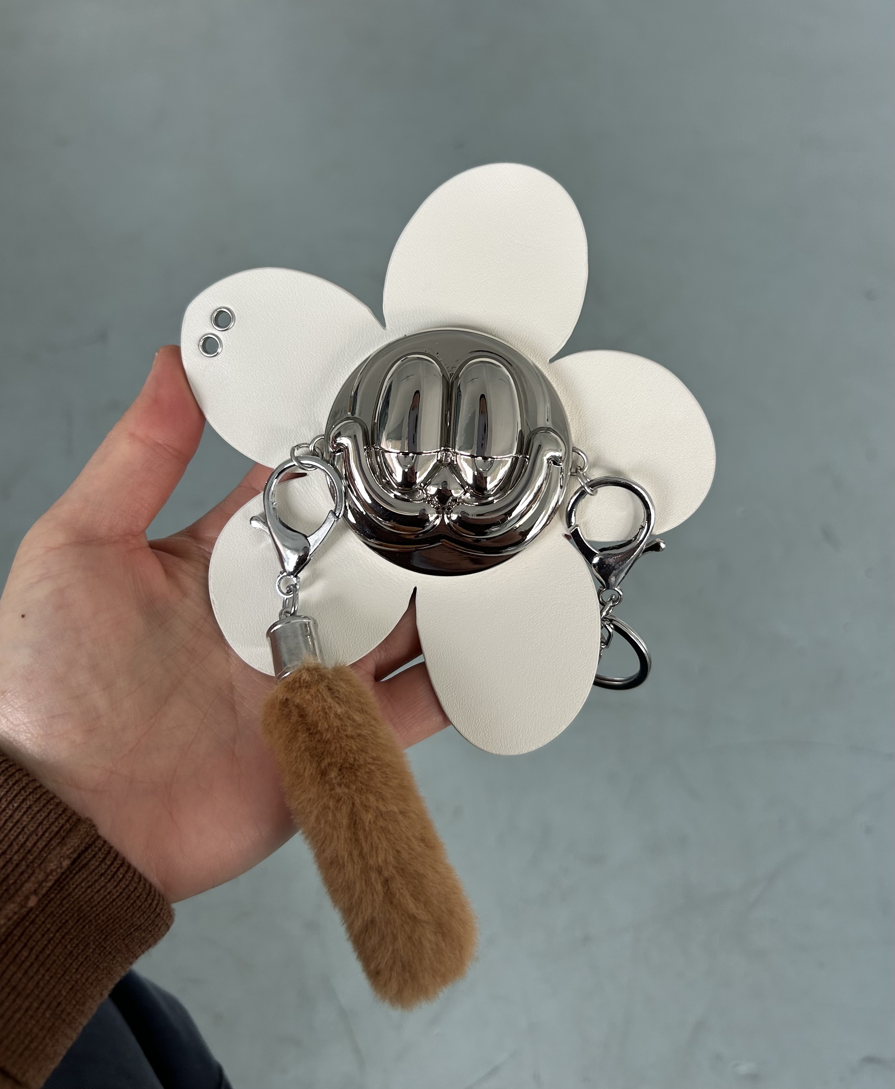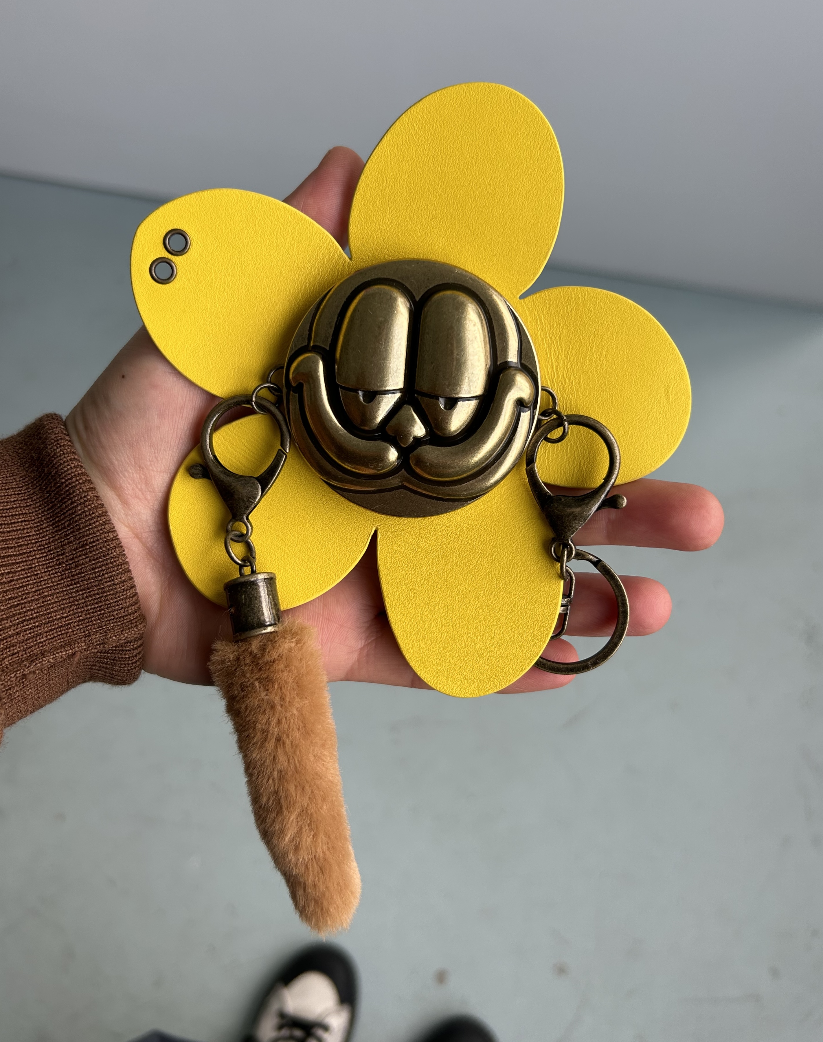 Wall Flower Charm combines references both fashion and popular culture, in particular 80s Americana and noughties pop-optimism. The metal face is a stylised Garfield, a figure that recurs in Yeldezian's work, and the leather flower recalls Marc Jacobs Daisy perfume bottles.
