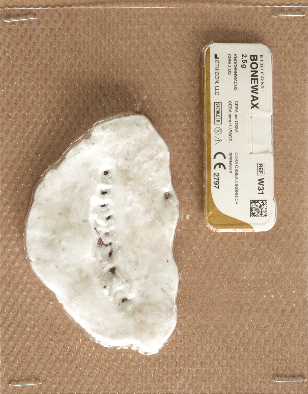 Geist includes two motifs from the artist’s oeuvre, prepackaged into a do-it-yourself sculpture. A cast resin jaw (a form encountered in the artist’s work since 2019) is paired with a tab of single-use bone wax; a material used in surgery to control bleeding from the bone.